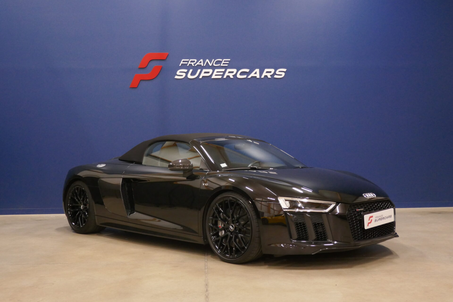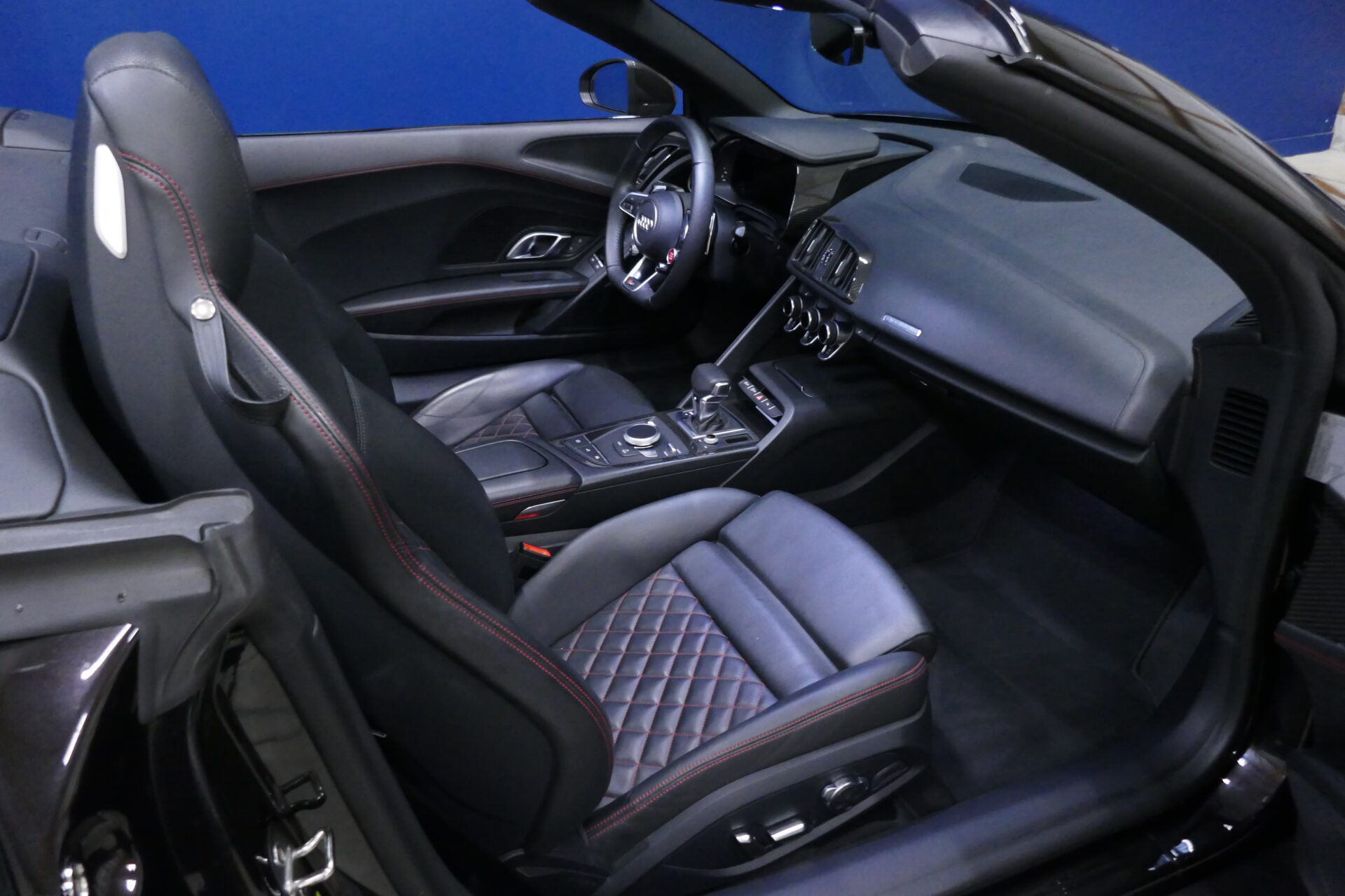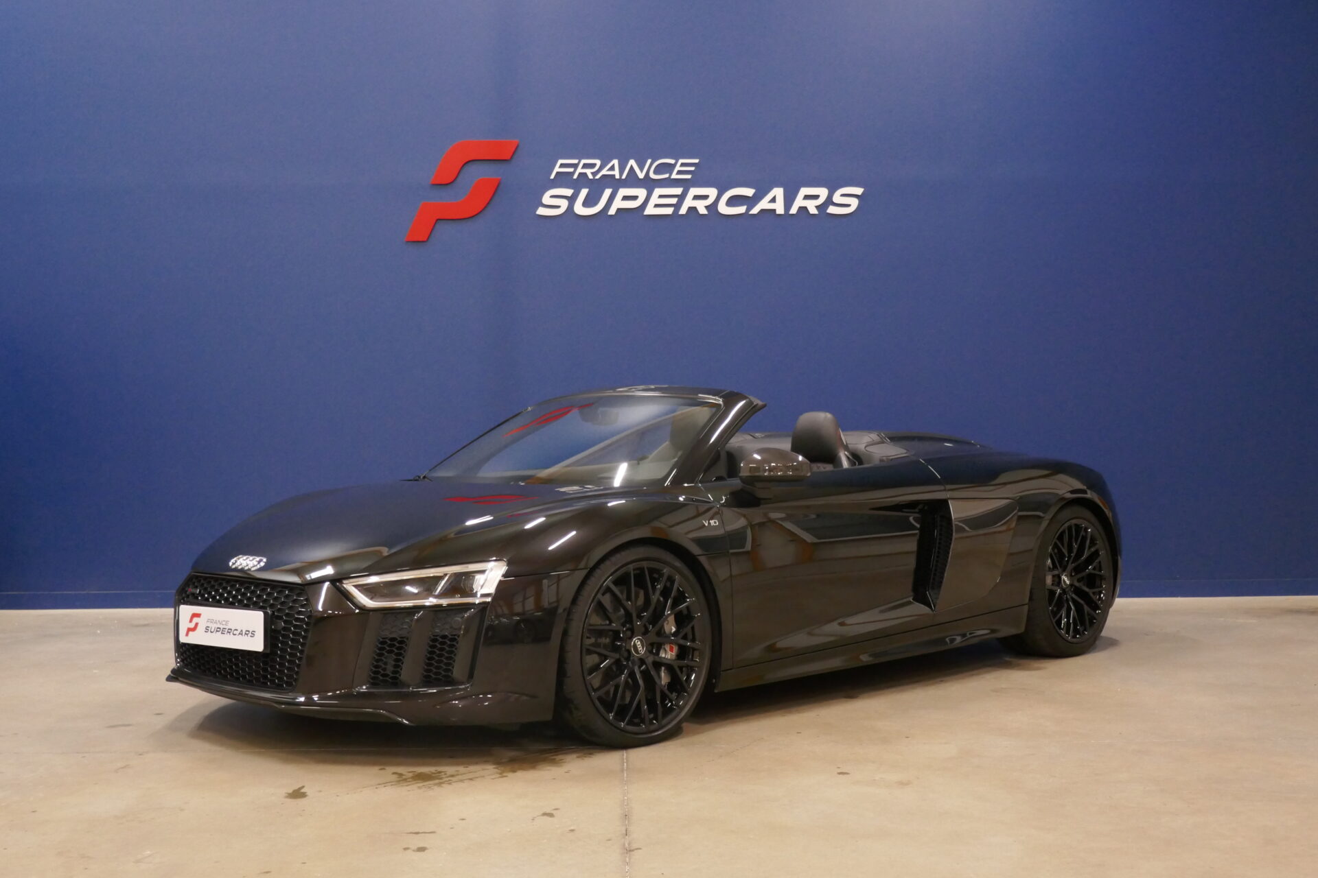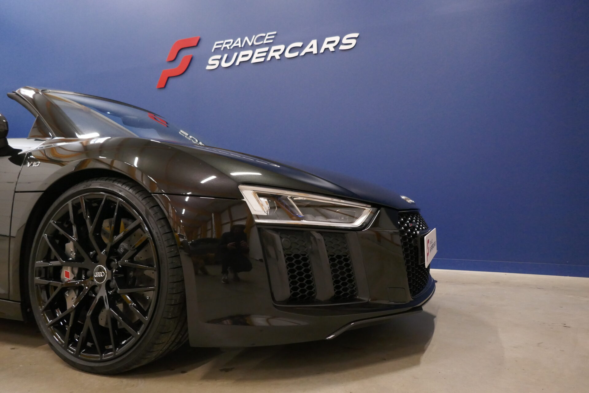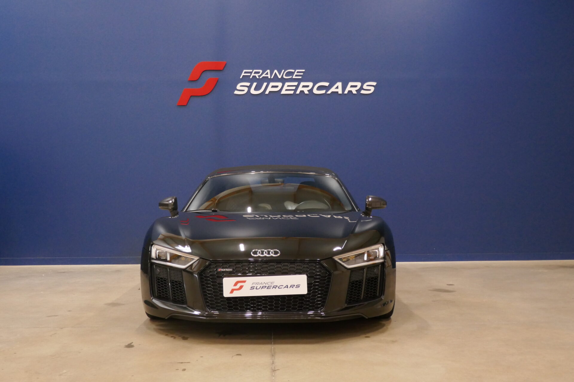 Elle affiche des performances impressionnantes, avec un 0 à 100 km/h en 3,6 s, un 0 à 200 km/h en 11,8 s et une vitesse maxi de… 318 km/h. Gare au brushing ! Doté d'un carter sec et pouvant tourner jusqu'à 8 700 tr/min, ce V10 est une vraie force de la nature, sans pour autant tomber dans la linéarité absolue, généralement nuisible à l'agrément. Ce moteur est plein partout, mais délivre un bon coup de pied aux fesses aux alentours des 6 000 tr/min, tout en faisant évoluer sa sonorité au fil des montées en régimes. Grave et rauque en bas du compte-tours, il hurle littéralement à l'approche de la zone rouge ! Un cri sauvage auquel l'échappement à clapets fourni en standard n'est évidemment pas étranger. Par ailleurs, ce V10 sait aussi jouer les citoyens modèles, grâce à sa bi-injection (directe dans le cylindre ou indirecte dans les tubulures, au choix, afin de réduire les émissions). Il est également capable de désactiver un banc de cylindres à faible charge pour réduire son (solide) appétit lorsque l'on adopte un rythme plus paisible. Quant à la boîte S Tronic, elle offre un mode roue libre pour encore grappiller quelques décilitres de ci, de là. On s'imagine aisément accomplir d'importants kilométrages avec cette auto, qui sait prendre soin de ses deux occupants, notamment grâce aux divers modes offerts par l'Audi Drive Select (Comfort, Auto, Dynamic).