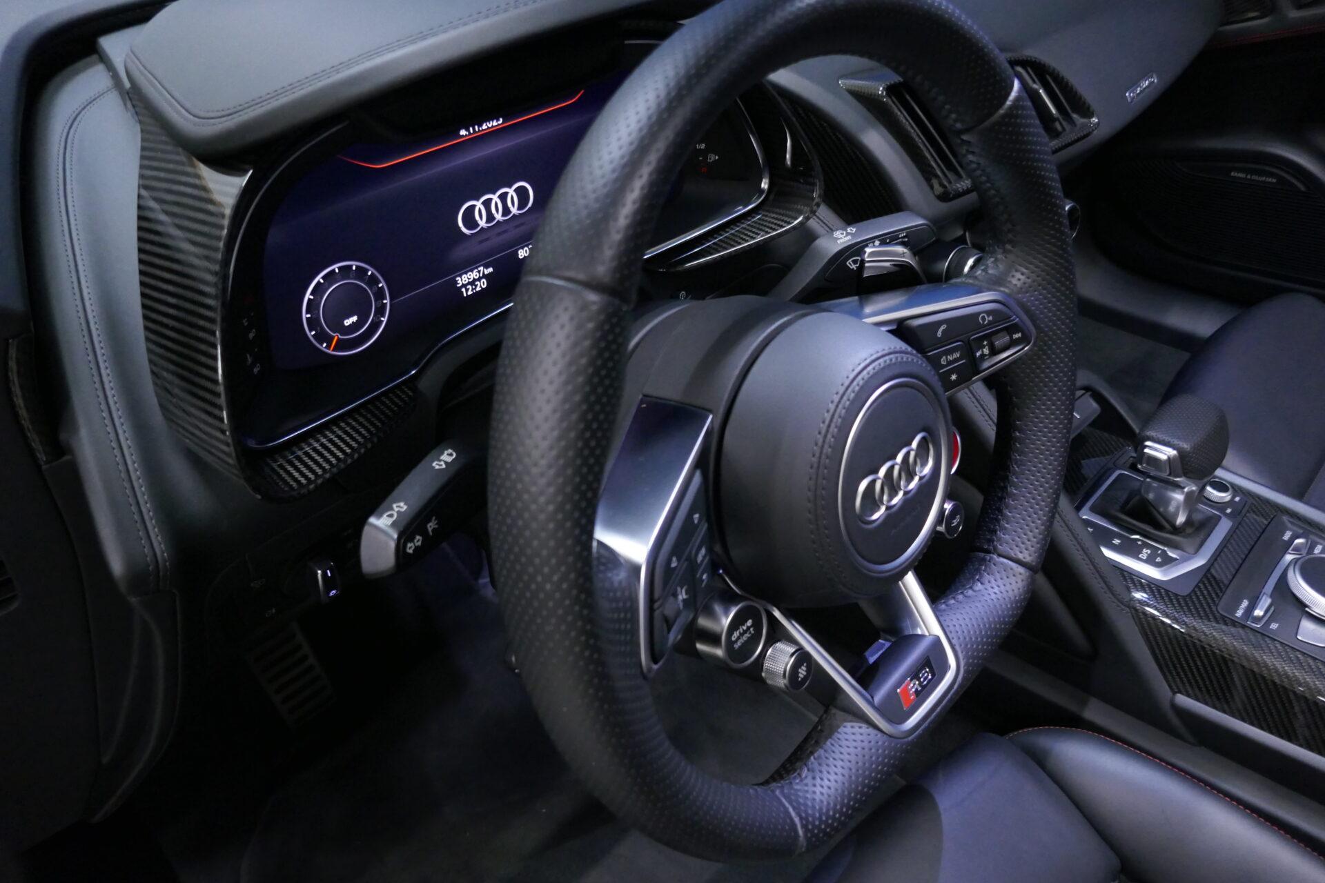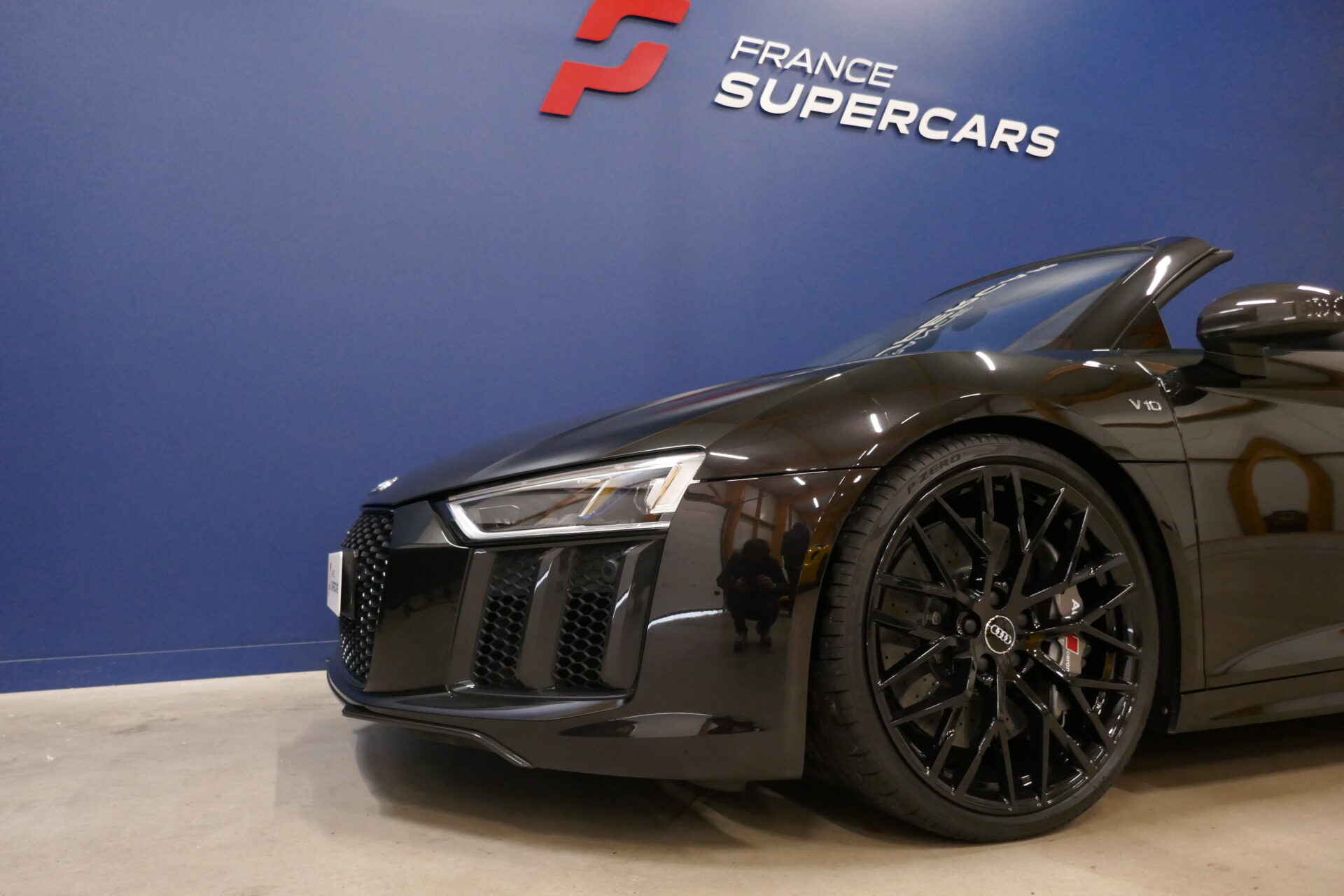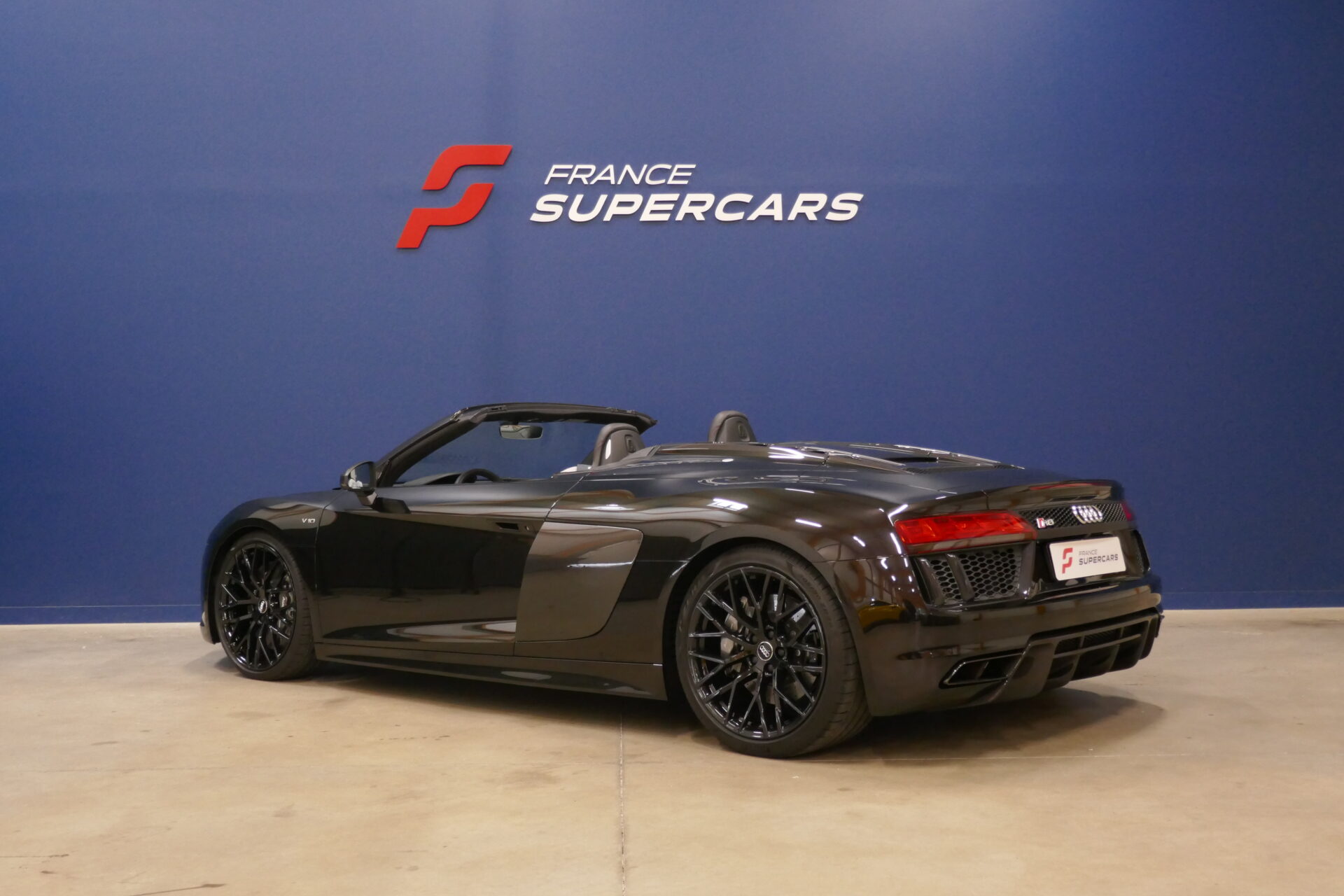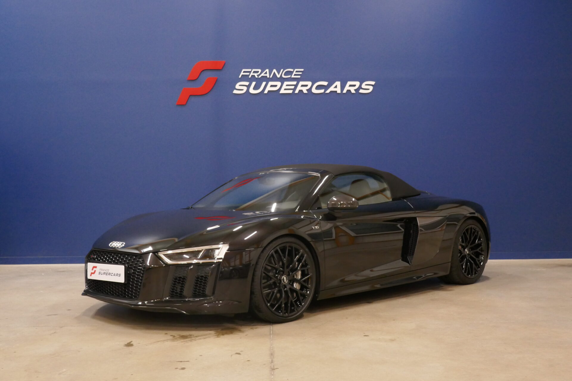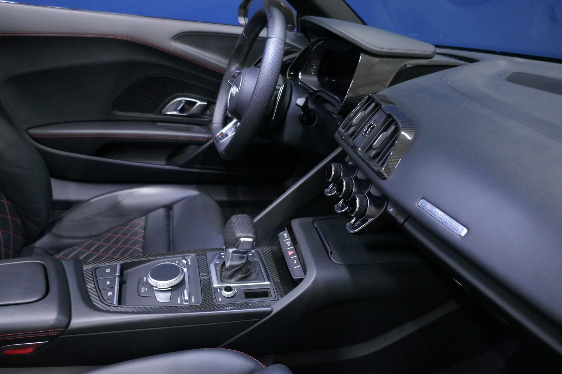 Elle affiche des performances impressionnantes, avec un 0 à 100 km/h en 3,6 s, un 0 à 200 km/h en 11,8 s et une vitesse maxi de… 318 km/h. Gare au brushing ! Doté d'un carter sec et pouvant tourner jusqu'à 8 700 tr/min, ce V10 est une vraie force de la nature, sans pour autant tomber dans la linéarité absolue, généralement nuisible à l'agrément. Ce moteur est plein partout, mais délivre un bon coup de pied aux fesses aux alentours des 6 000 tr/min, tout en faisant évoluer sa sonorité au fil des montées en régimes. Grave et rauque en bas du compte-tours, il hurle littéralement à l'approche de la zone rouge ! Un cri sauvage auquel l'échappement à clapets fourni en standard n'est évidemment pas étranger. Par ailleurs, ce V10 sait aussi jouer les citoyens modèles, grâce à sa bi-injection (directe dans le cylindre ou indirecte dans les tubulures, au choix, afin de réduire les émissions). Il est également capable de désactiver un banc de cylindres à faible charge pour réduire son (solide) appétit lorsque l'on adopte un rythme plus paisible. Quant à la boîte S Tronic, elle offre un mode roue libre pour encore grappiller quelques décilitres de ci, de là. On s'imagine aisément accomplir d'importants kilométrages avec cette auto, qui sait prendre soin de ses deux occupants, notamment grâce aux divers modes offerts par l'Audi Drive Select (Comfort, Auto, Dynamic).