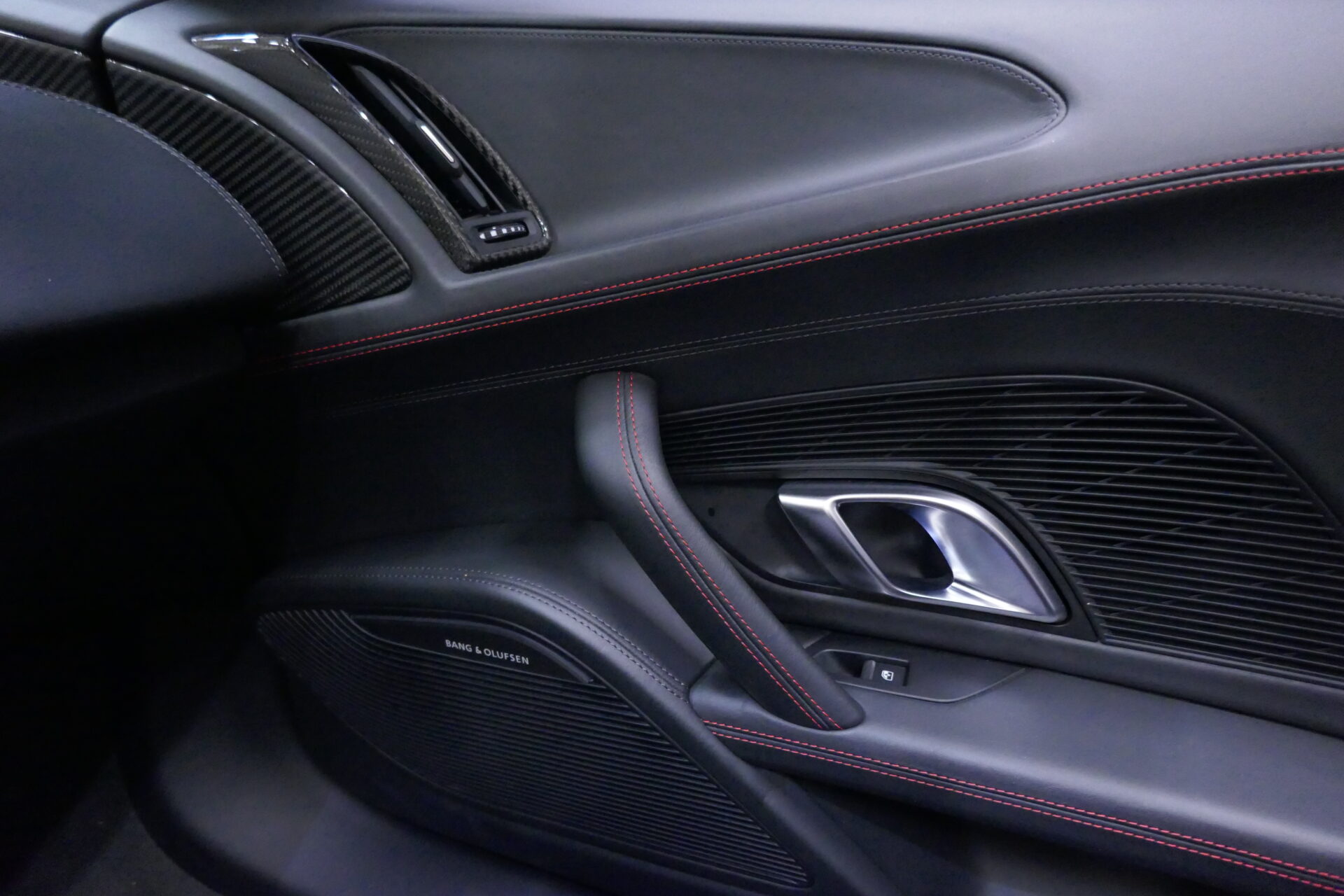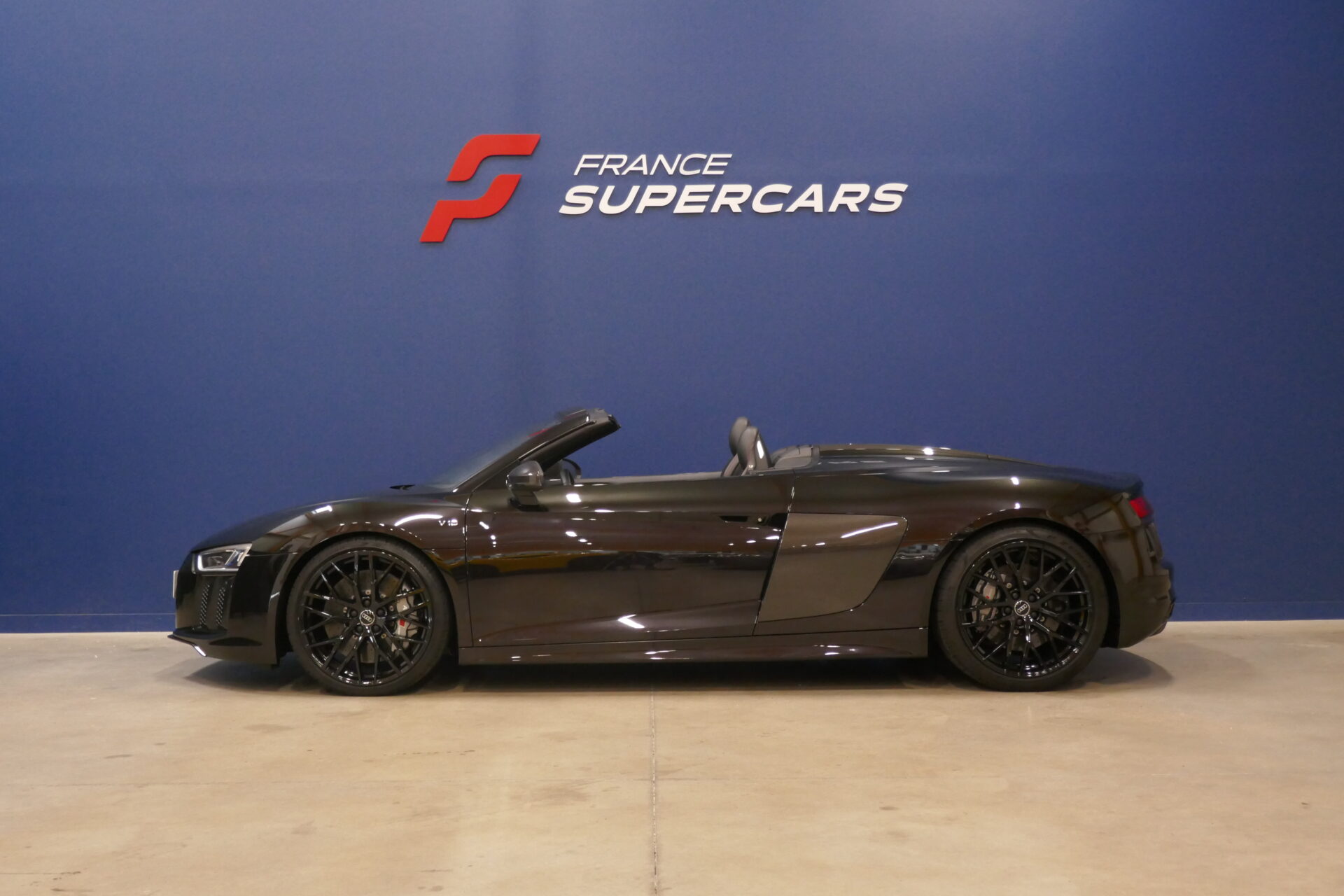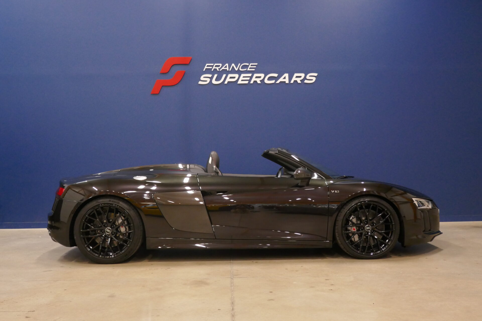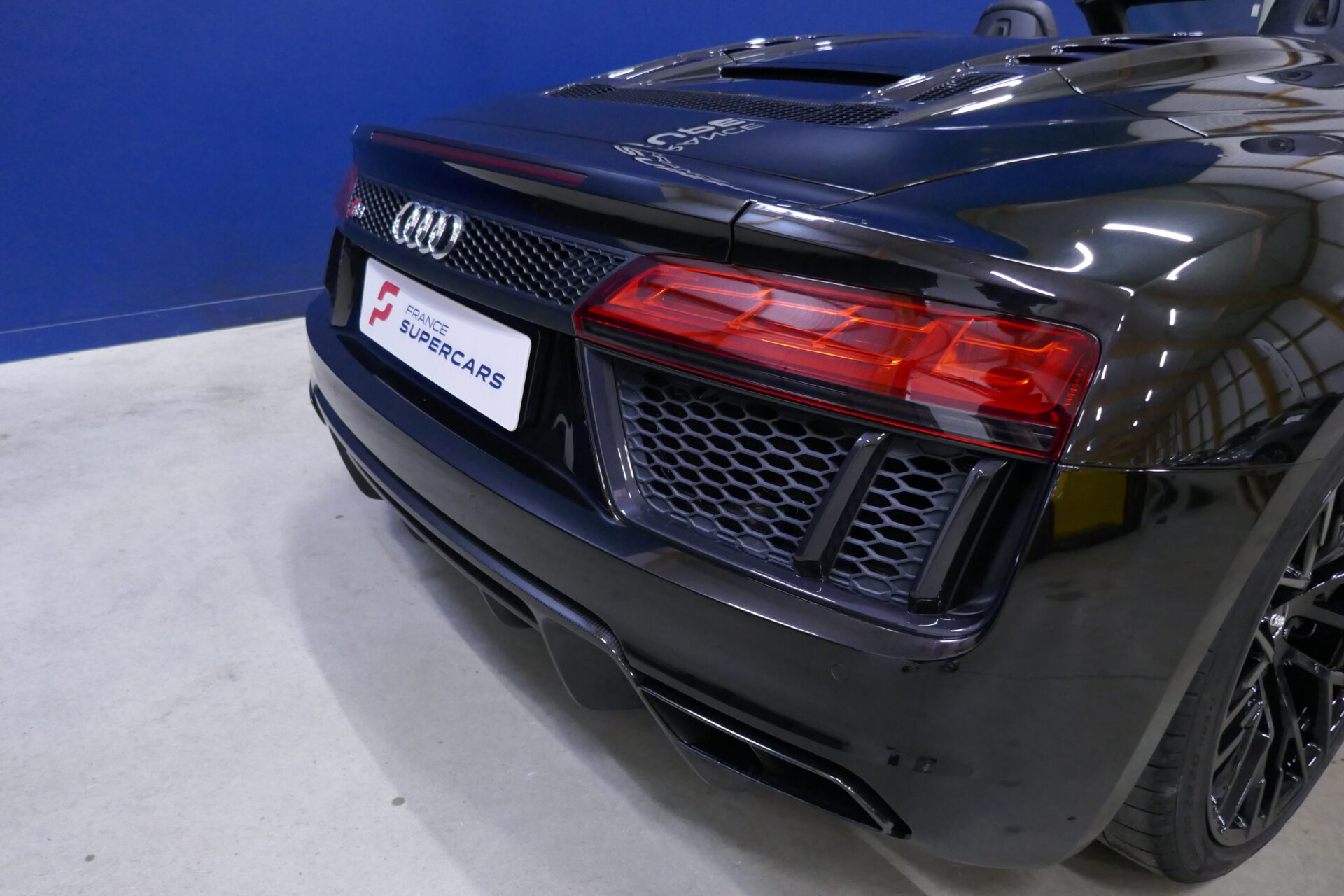 Elle affiche des performances impressionnantes, avec un 0 à 100 km/h en 3,6 s, un 0 à 200 km/h en 11,8 s et une vitesse maxi de… 318 km/h. Gare au brushing ! Doté d'un carter sec et pouvant tourner jusqu'à 8 700 tr/min, ce V10 est une vraie force de la nature, sans pour autant tomber dans la linéarité absolue, généralement nuisible à l'agrément. Ce moteur est plein partout, mais délivre un bon coup de pied aux fesses aux alentours des 6 000 tr/min, tout en faisant évoluer sa sonorité au fil des montées en régimes. Grave et rauque en bas du compte-tours, il hurle littéralement à l'approche de la zone rouge ! Un cri sauvage auquel l'échappement à clapets fourni en standard n'est évidemment pas étranger. Par ailleurs, ce V10 sait aussi jouer les citoyens modèles, grâce à sa bi-injection (directe dans le cylindre ou indirecte dans les tubulures, au choix, afin de réduire les émissions). Il est également capable de désactiver un banc de cylindres à faible charge pour réduire son (solide) appétit lorsque l'on adopte un rythme plus paisible. Quant à la boîte S Tronic, elle offre un mode roue libre pour encore grappiller quelques décilitres de ci, de là. On s'imagine aisément accomplir d'importants kilométrages avec cette auto, qui sait prendre soin de ses deux occupants, notamment grâce aux divers modes offerts par l'Audi Drive Select (Comfort, Auto, Dynamic).