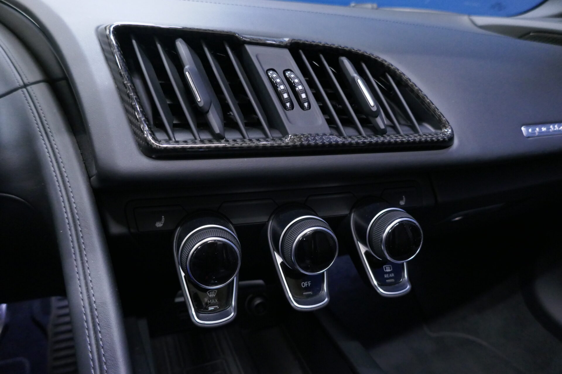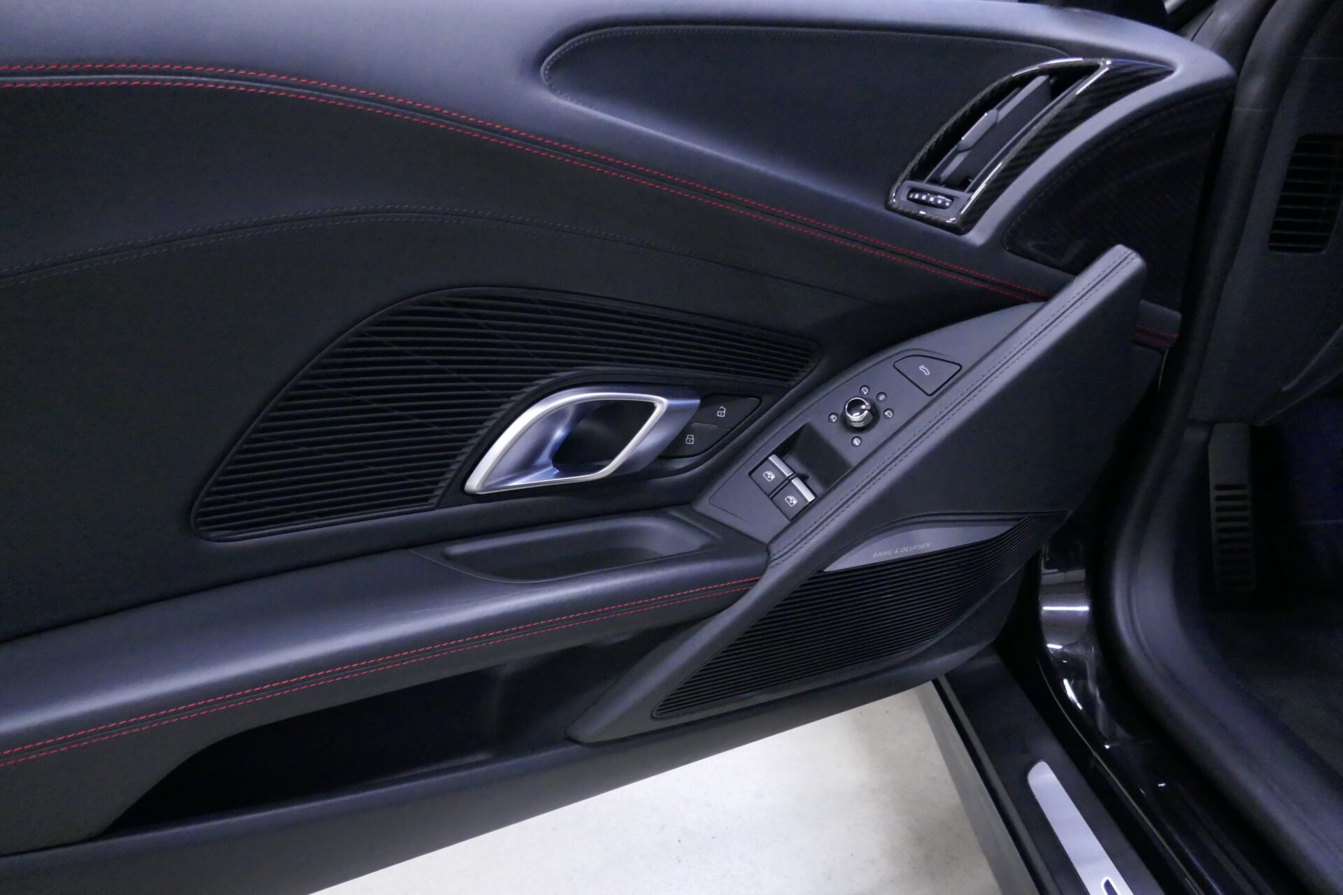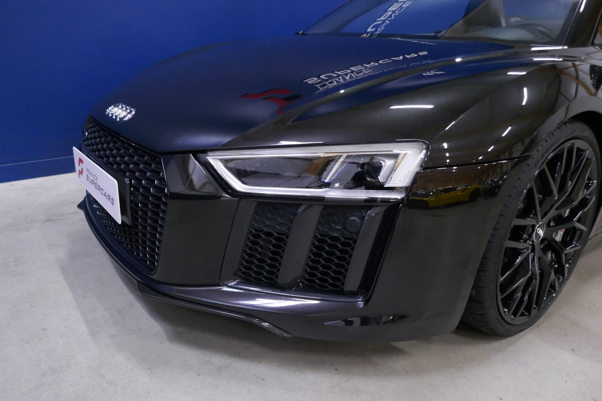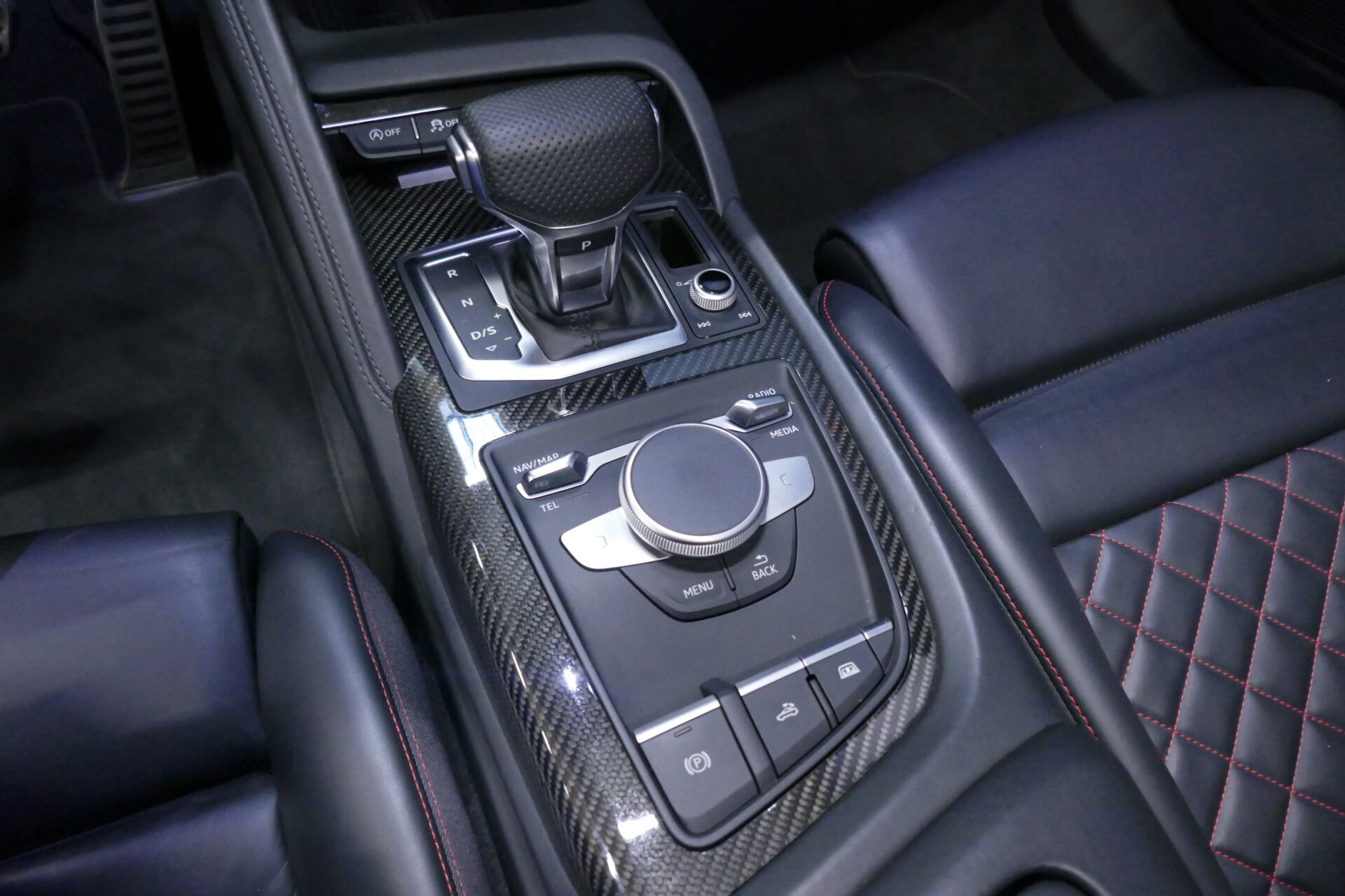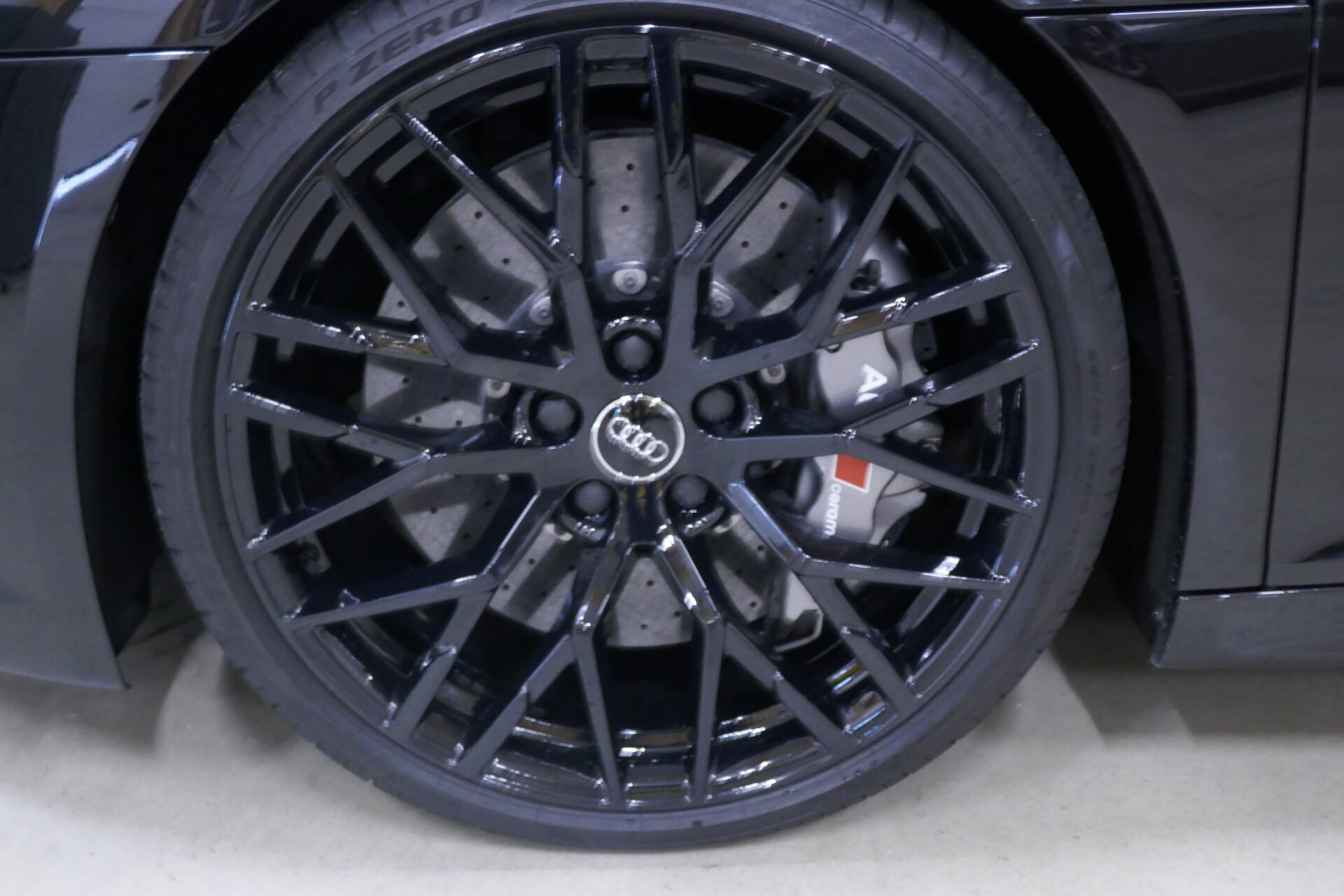 Elle affiche des performances impressionnantes, avec un 0 à 100 km/h en 3,6 s, un 0 à 200 km/h en 11,8 s et une vitesse maxi de… 318 km/h. Gare au brushing ! Doté d'un carter sec et pouvant tourner jusqu'à 8 700 tr/min, ce V10 est une vraie force de la nature, sans pour autant tomber dans la linéarité absolue, généralement nuisible à l'agrément. Ce moteur est plein partout, mais délivre un bon coup de pied aux fesses aux alentours des 6 000 tr/min, tout en faisant évoluer sa sonorité au fil des montées en régimes. Grave et rauque en bas du compte-tours, il hurle littéralement à l'approche de la zone rouge ! Un cri sauvage auquel l'échappement à clapets fourni en standard n'est évidemment pas étranger. Par ailleurs, ce V10 sait aussi jouer les citoyens modèles, grâce à sa bi-injection (directe dans le cylindre ou indirecte dans les tubulures, au choix, afin de réduire les émissions). Il est également capable de désactiver un banc de cylindres à faible charge pour réduire son (solide) appétit lorsque l'on adopte un rythme plus paisible. Quant à la boîte S Tronic, elle offre un mode roue libre pour encore grappiller quelques décilitres de ci, de là. On s'imagine aisément accomplir d'importants kilométrages avec cette auto, qui sait prendre soin de ses deux occupants, notamment grâce aux divers modes offerts par l'Audi Drive Select (Comfort, Auto, Dynamic).
