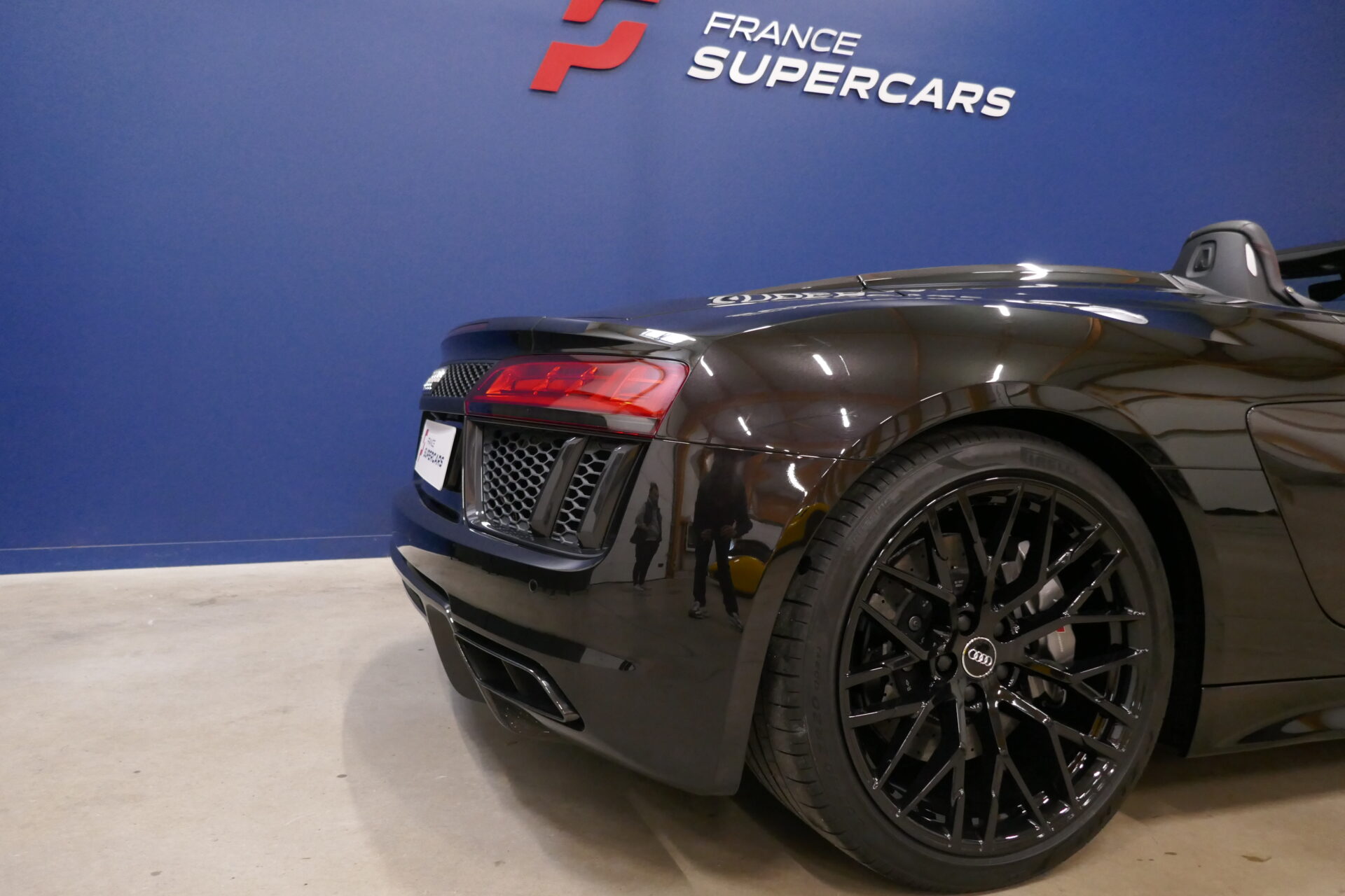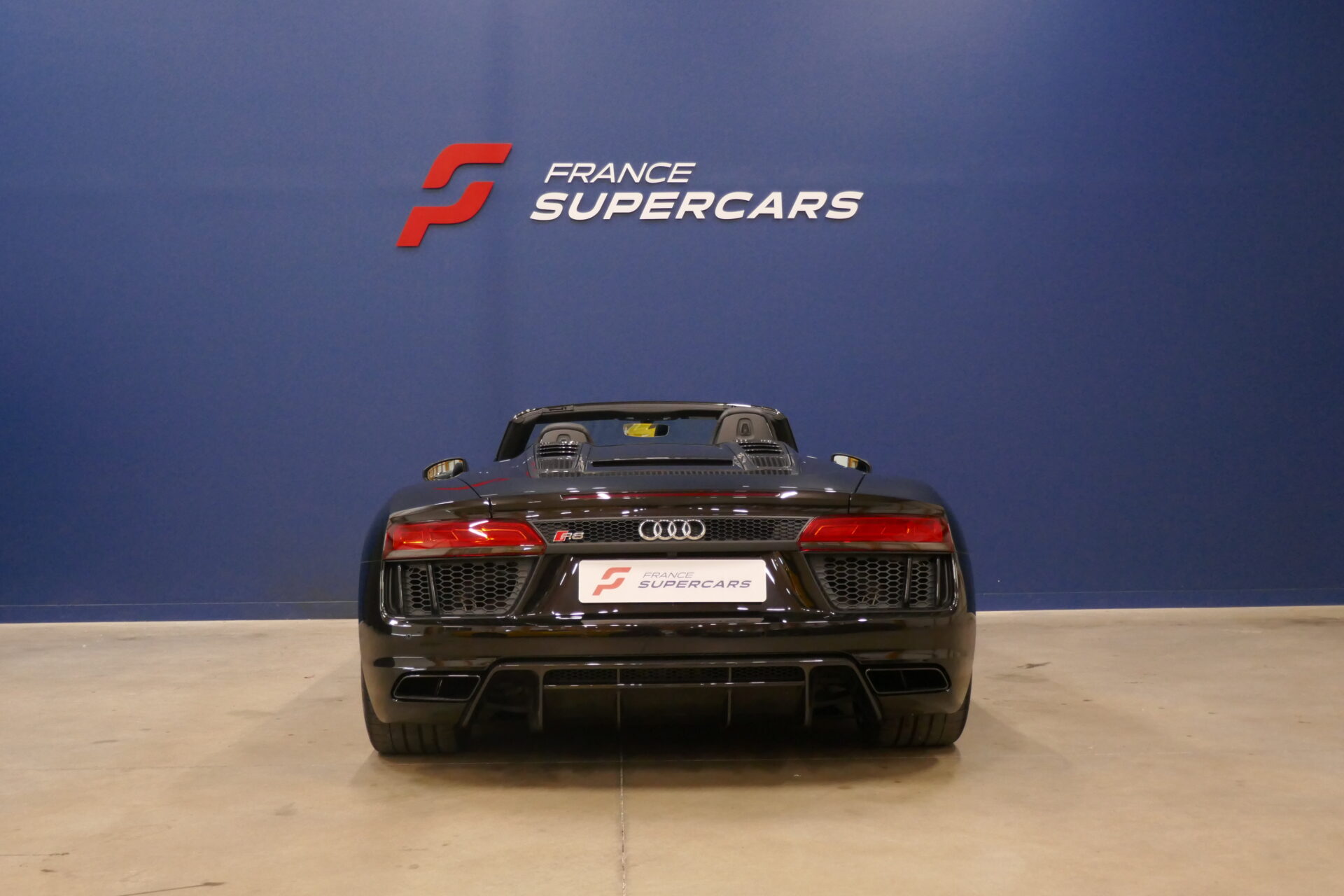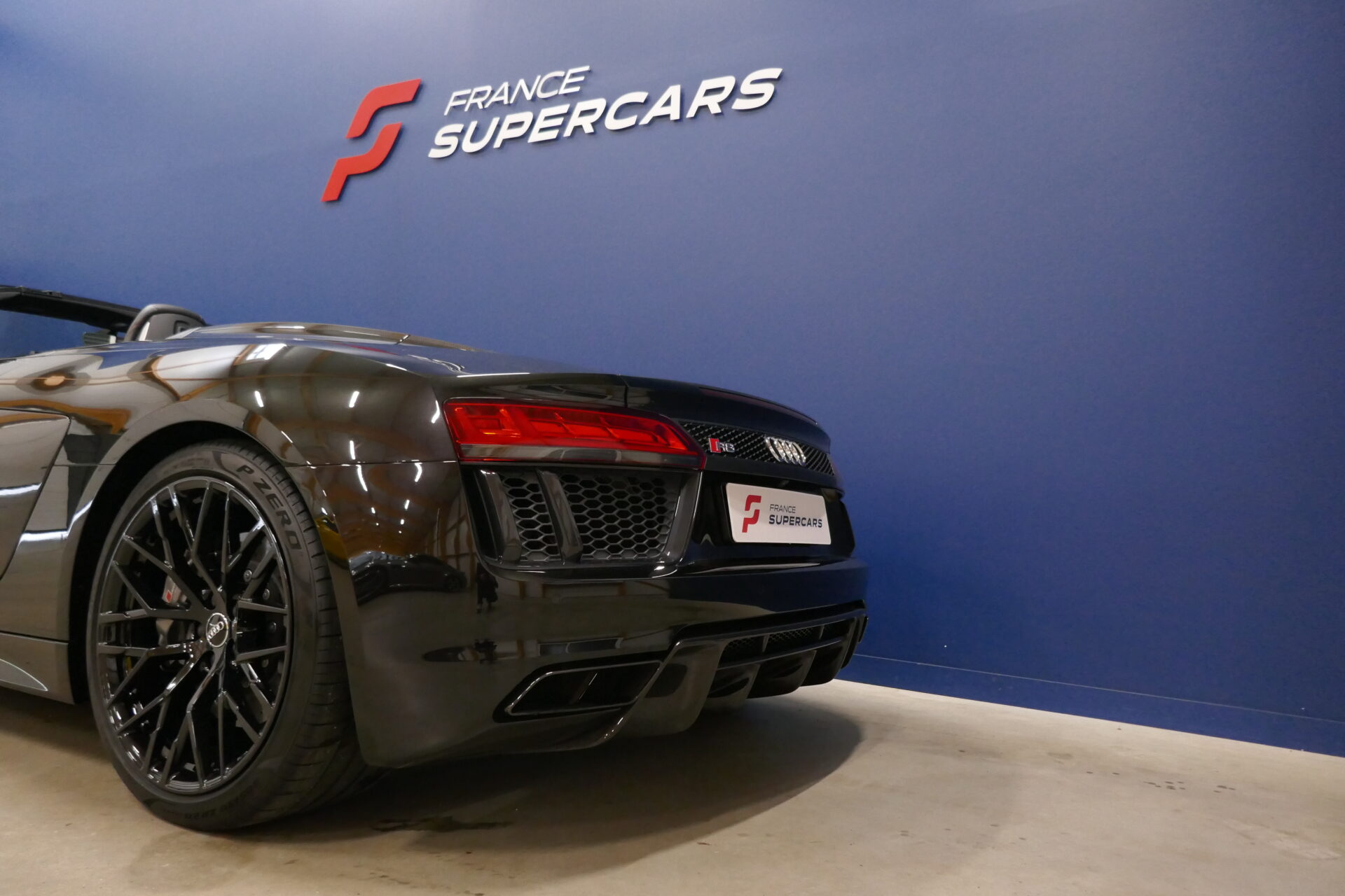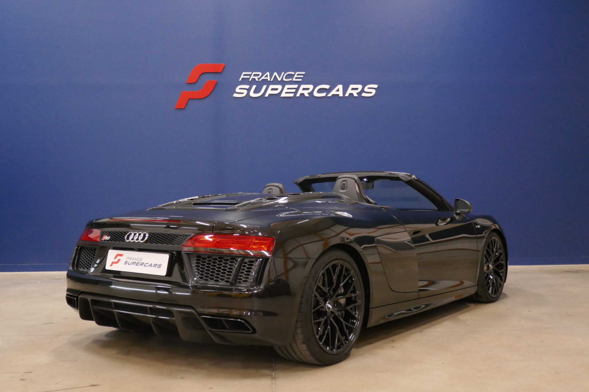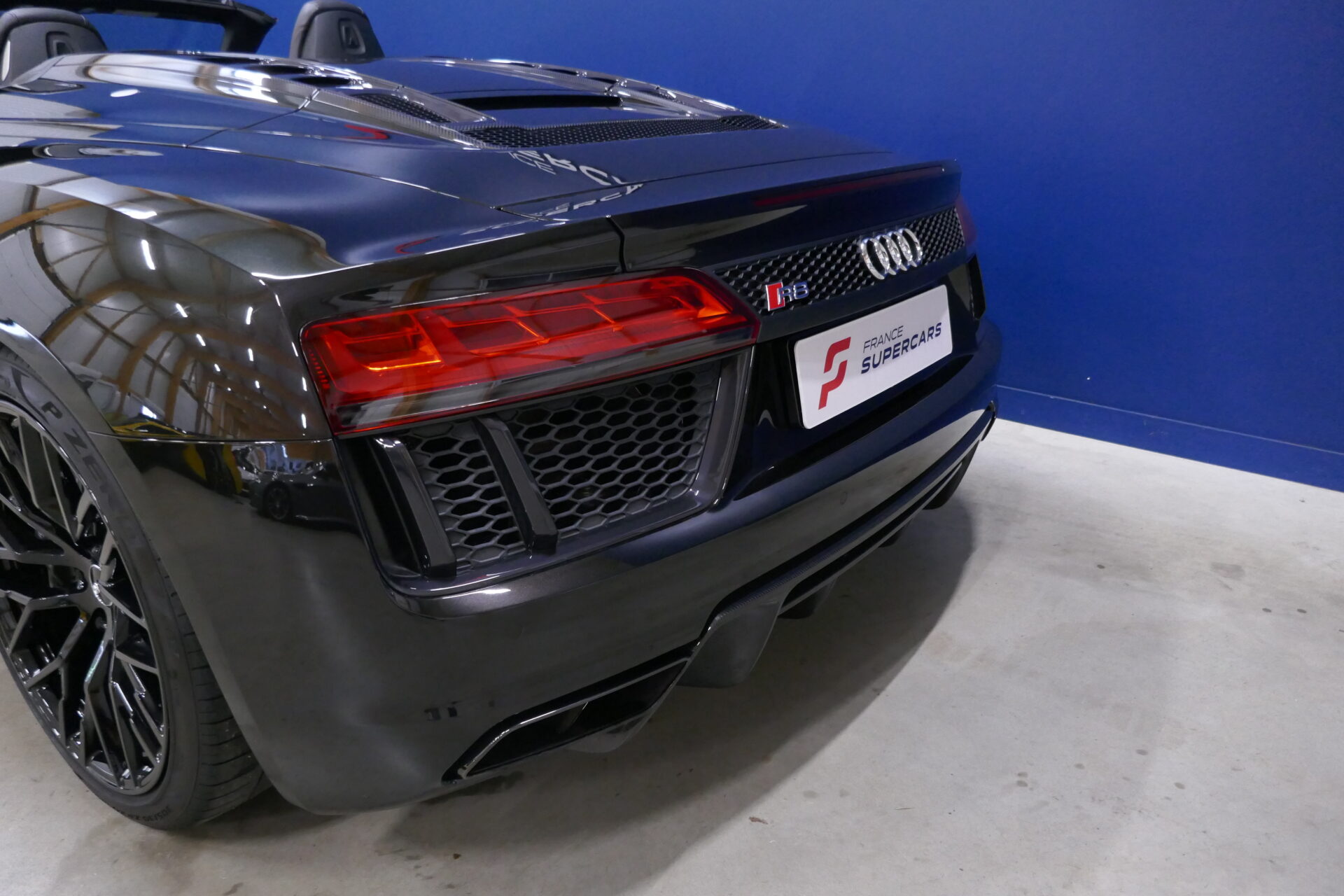 l'Audi R8 Spyder V10, comme le coupé dont elle dérive, a cette faculté de ne pas intimider son conducteur. Quatre roues motrices, une palanquée de modes de conduite et un comportement routier rassurant et progressif facilitent la prise en mains. Du coup, le plaisir est toujours là. Il est même magnifié par le fait qu'une simple capote en toile nous sépare des décibels générés par le V10 5.2. D'ailleurs, comme sur la génération précédente, il est possible d'abaisser la lunette arrière tout en conservant la capote en place, ce qui permet de vivre au rythme de cette mécanique même lorsque la météo est peu clémente.