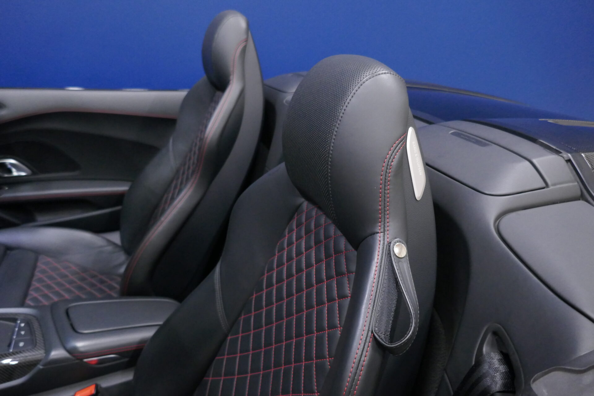 Mais commençons par le commencement : le style. Par rapport au coupé, l"Audi R8 Spyder V10 se distingue par cette capote entièrement électrique, qui se déploie et se replie en 20 secondes, y compris en roulant (jusqu'à 50 km/h). Toile et armature réunies ne pèsent que 44 kilos, grâce à l'emploi de magnésium et d'aluminium. Quant au couvre-capote, il est réalisé en fibre de carbone… Pour le reste, l'Audi R8 Spyder V10 reprend le châssis en aluminium et carbone du coupé, mais l'épaisseur de certains profilés d'aluminium a été augmentée à certains endroits stratégiques afin de compenser la perte de rigidité liée à l'ablation du toit. Au final, l'Audi R8 Spyder V10 nouvelle génération est 50 % plus résistante à la torsion que l'ancienne.