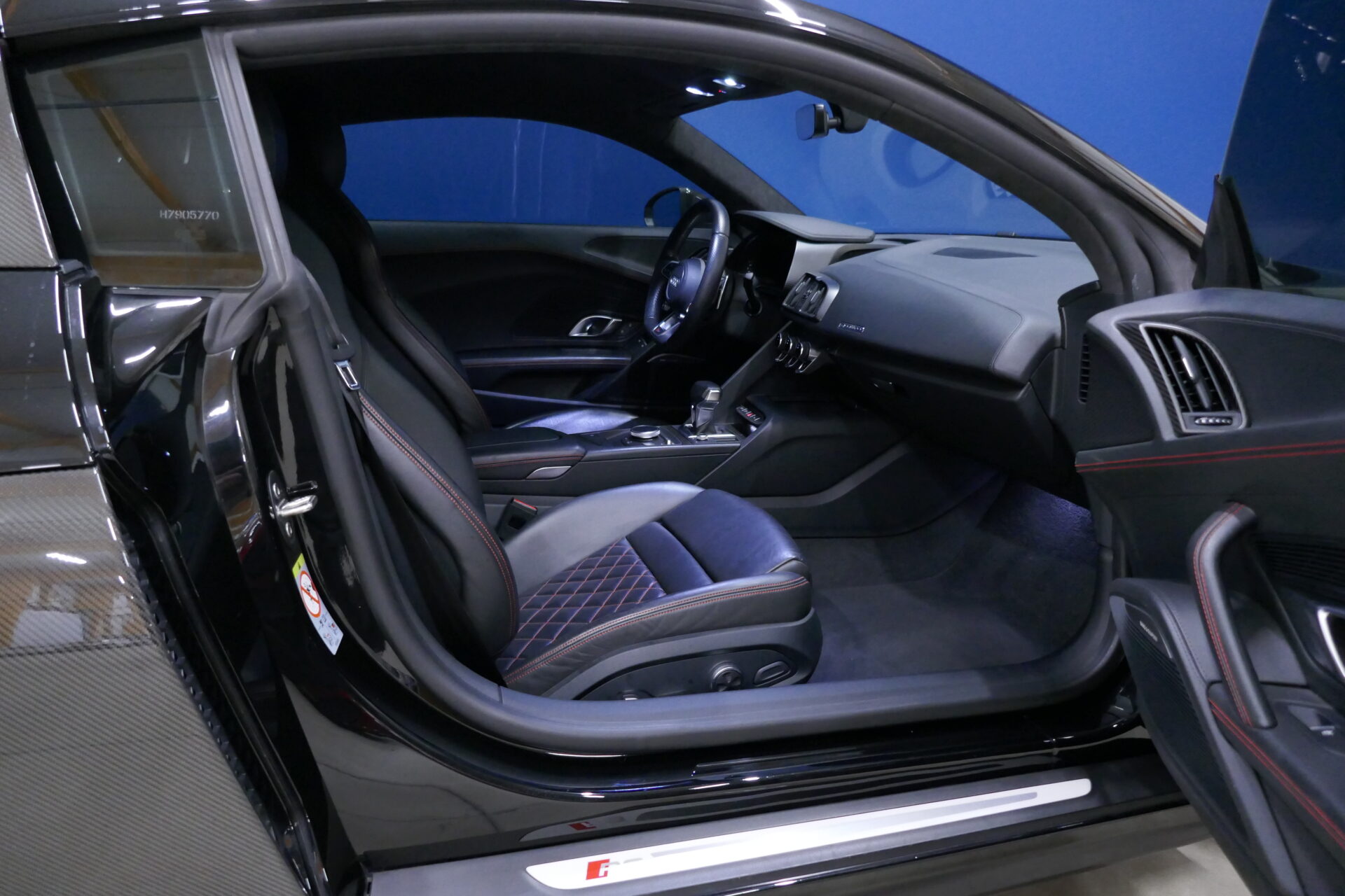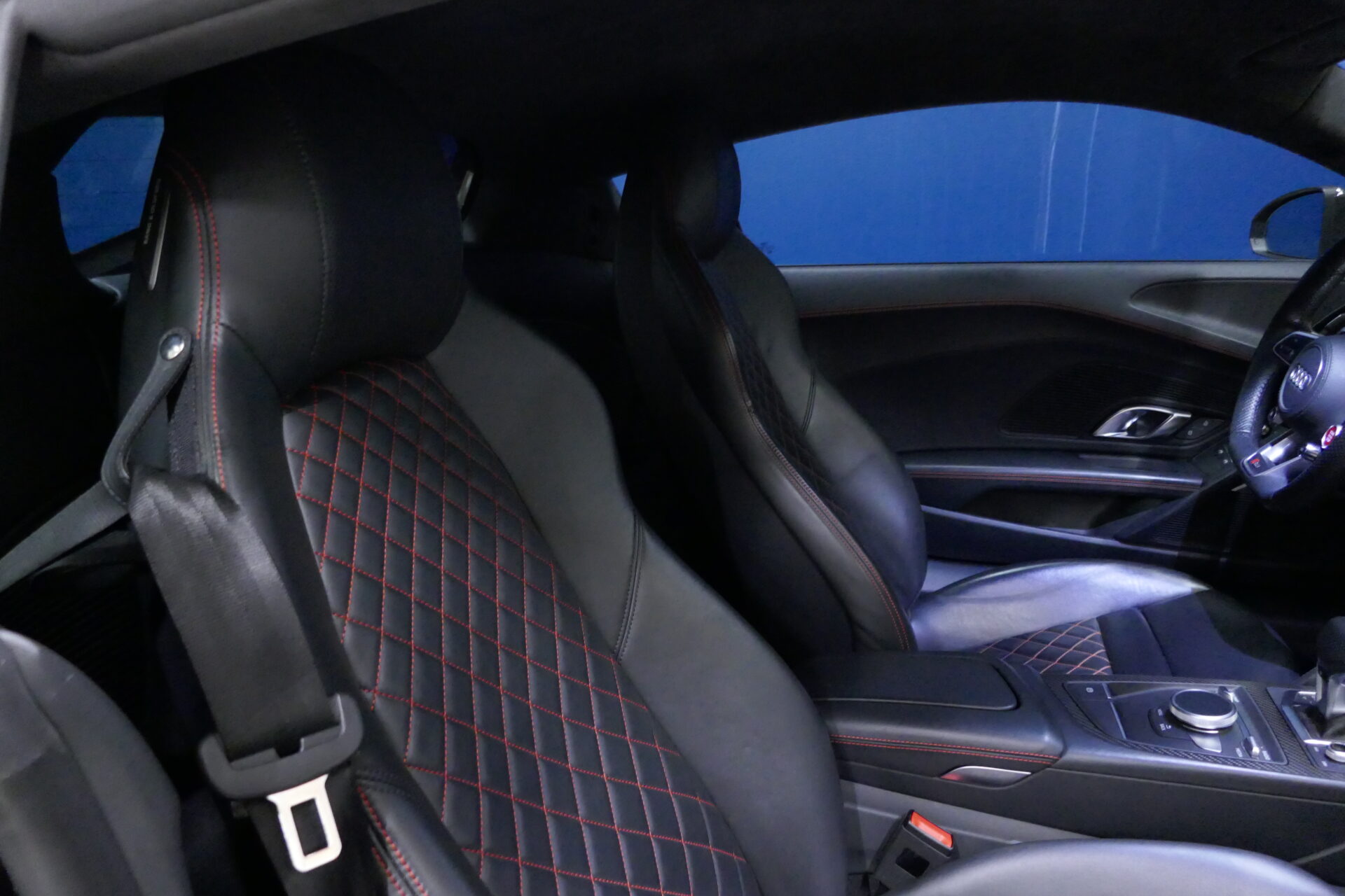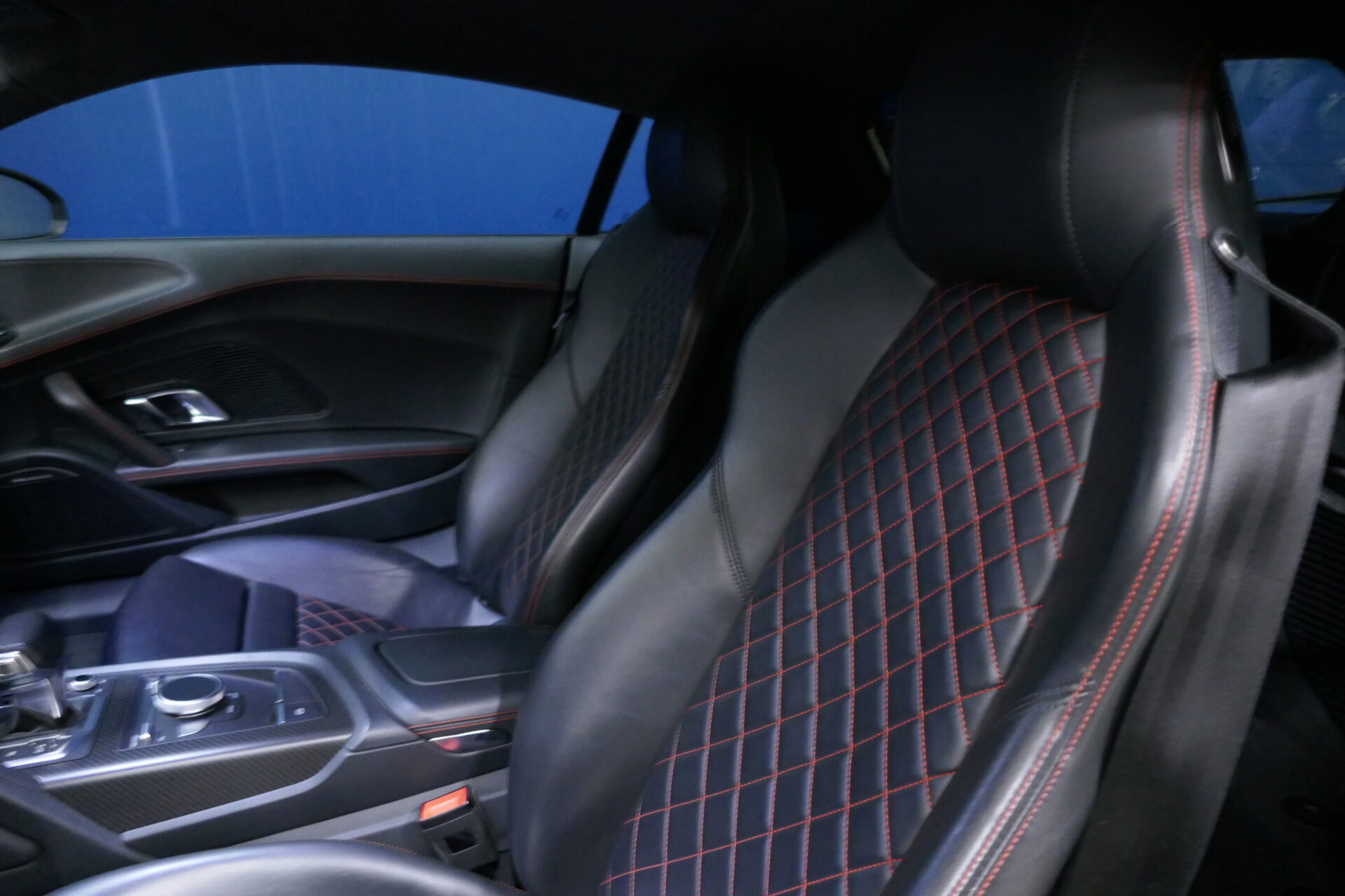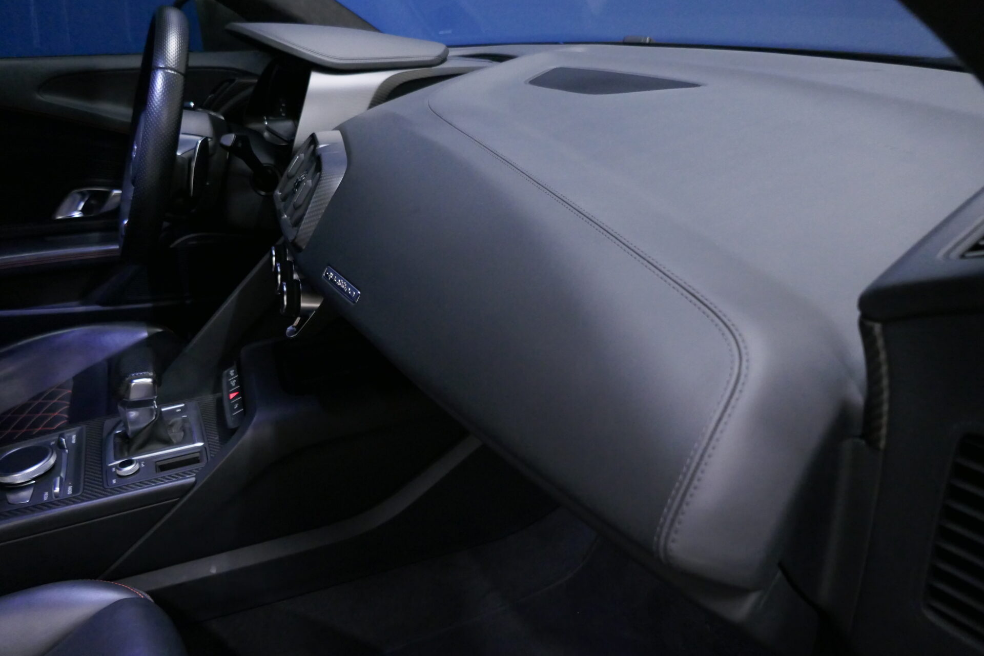 Cette Audi R8 V10 Plus est toujours un choc visuel ! Elle conserve son look de supercar, avec un capot plongeant, des passages de roues marqués et une lunette arrière ne cachant rien de la mécanique. Si l'auto reste reconnaissable immédiatement, son style évolue dans le détail, avec des lignes plus tendues, des angles marqués et des volumes plus abrupts quand sa devancière était toute en courbes. À l'avant, la calandre « singleframe » redessinée est encadrée par des optiques à LED. Les fameuses « sideblades », ces éléments de carrosserie contrastés ornant les flancs, sont désormais en deux parties et non plus d'un seul tenant comme sur l'ancien modèle. À l'arrière, la version Plus reçoit un aileron fixe en carbone (la V10 « normale » dispose d'un spoiler rétractable électriquement), qui lui permet de générer 140 kg d'appui aérodynamique à sa vitesse maxi de 330 km/h. Dans l'habitacle aussi, la R8 évolue plus qu'elle ne change véritablement. La planche de bord reprend ainsi ce qu'Audi baptise le « monoposto », à savoir cette arche enlaçant le poste de conduite. La présentation respire toujours le sérieux, mais la technologie embarquée fait un bond en avant : la R8 V10 Plus hérite ainsi de l'instrumentation sur écran à cristaux liquides apparue sur le TT. Entre les sièges apparaît la molette tactile pilotant le système d'info-divertissement, avec un pavé tactile pour faciliter la saisie d'adresses.