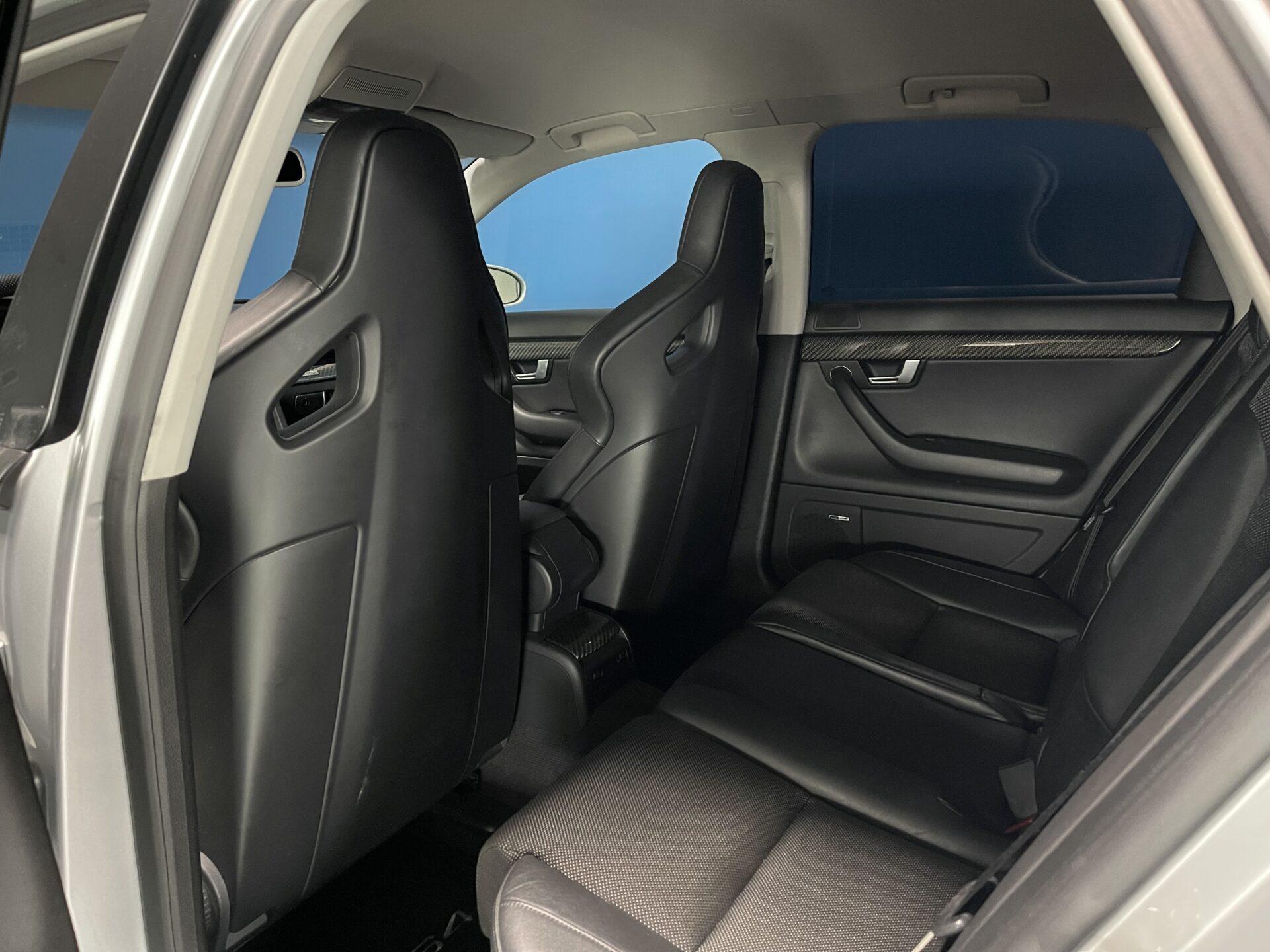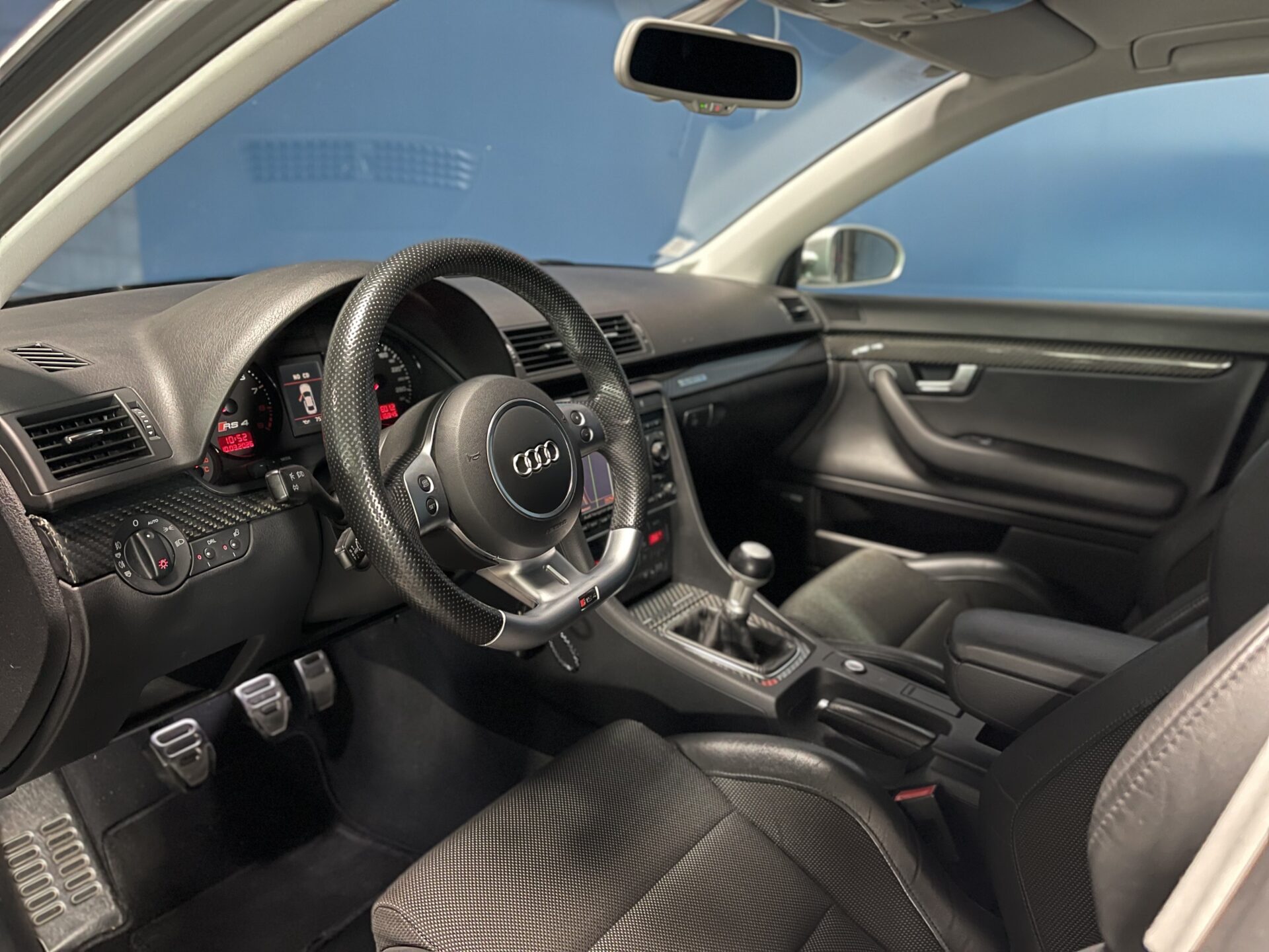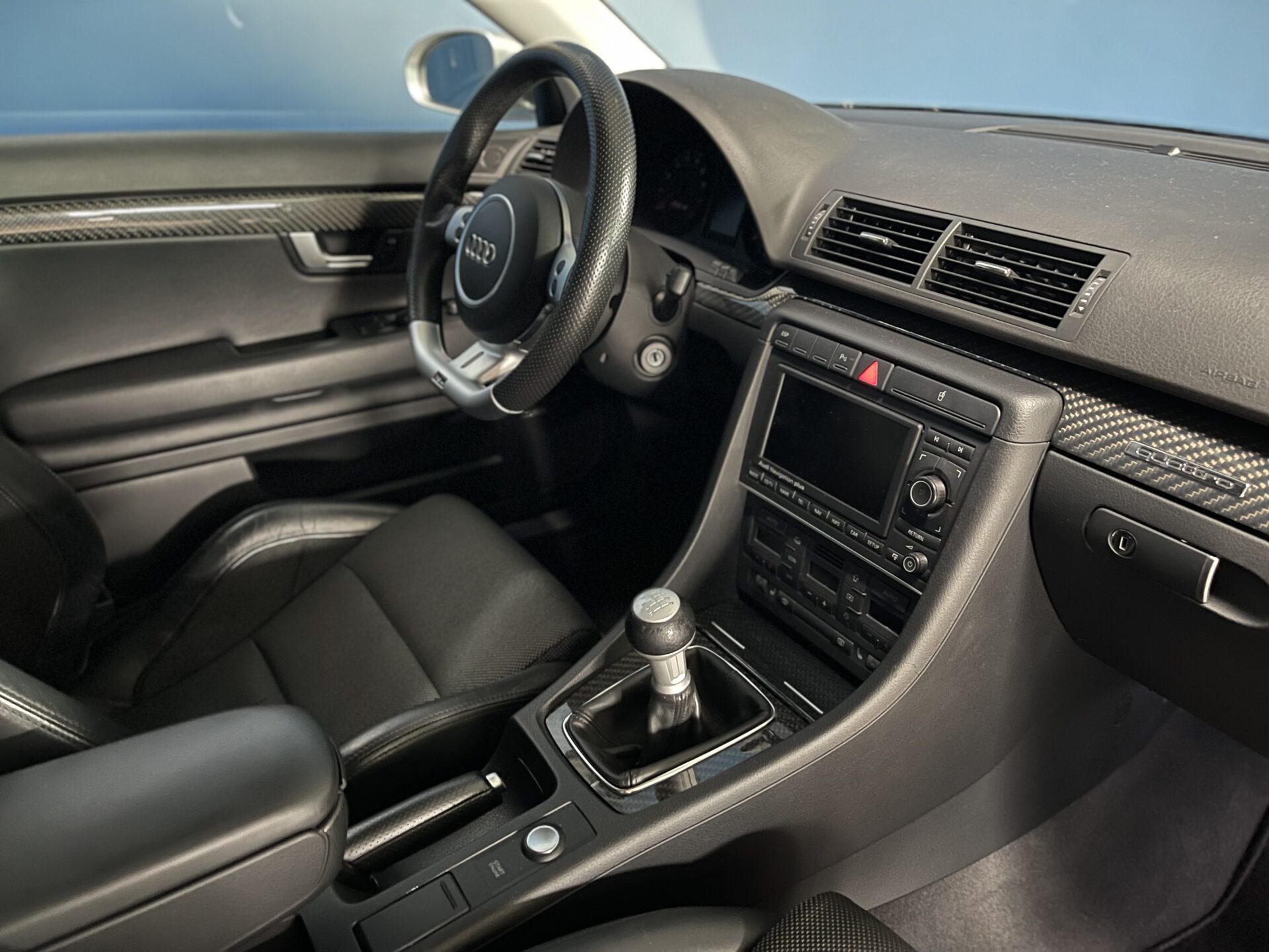 Trait esthétique maintenu, les rétroviseurs sont brossés aluminium, de même que l'entourage des portes. L'intérieur se distingue de la berline classique A4 par ses baquets en cuir, un pédalier aluminium et notamment, par un volant aplati dans sa partie inférieure, une première chez Audi et bientôt adoptée par toutes les sportives Audi.