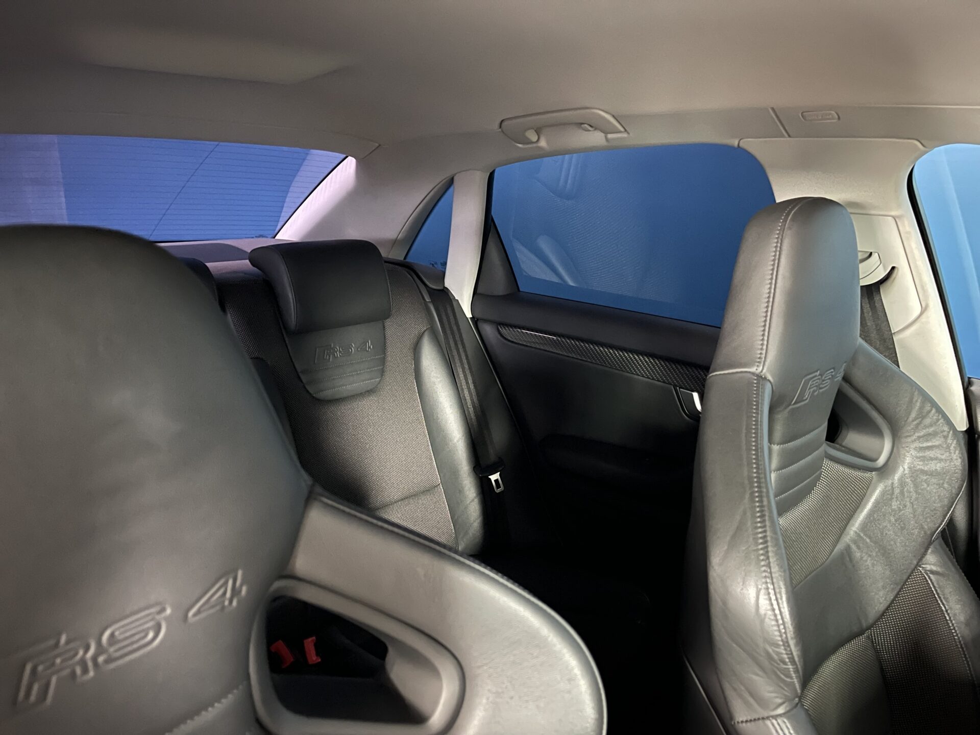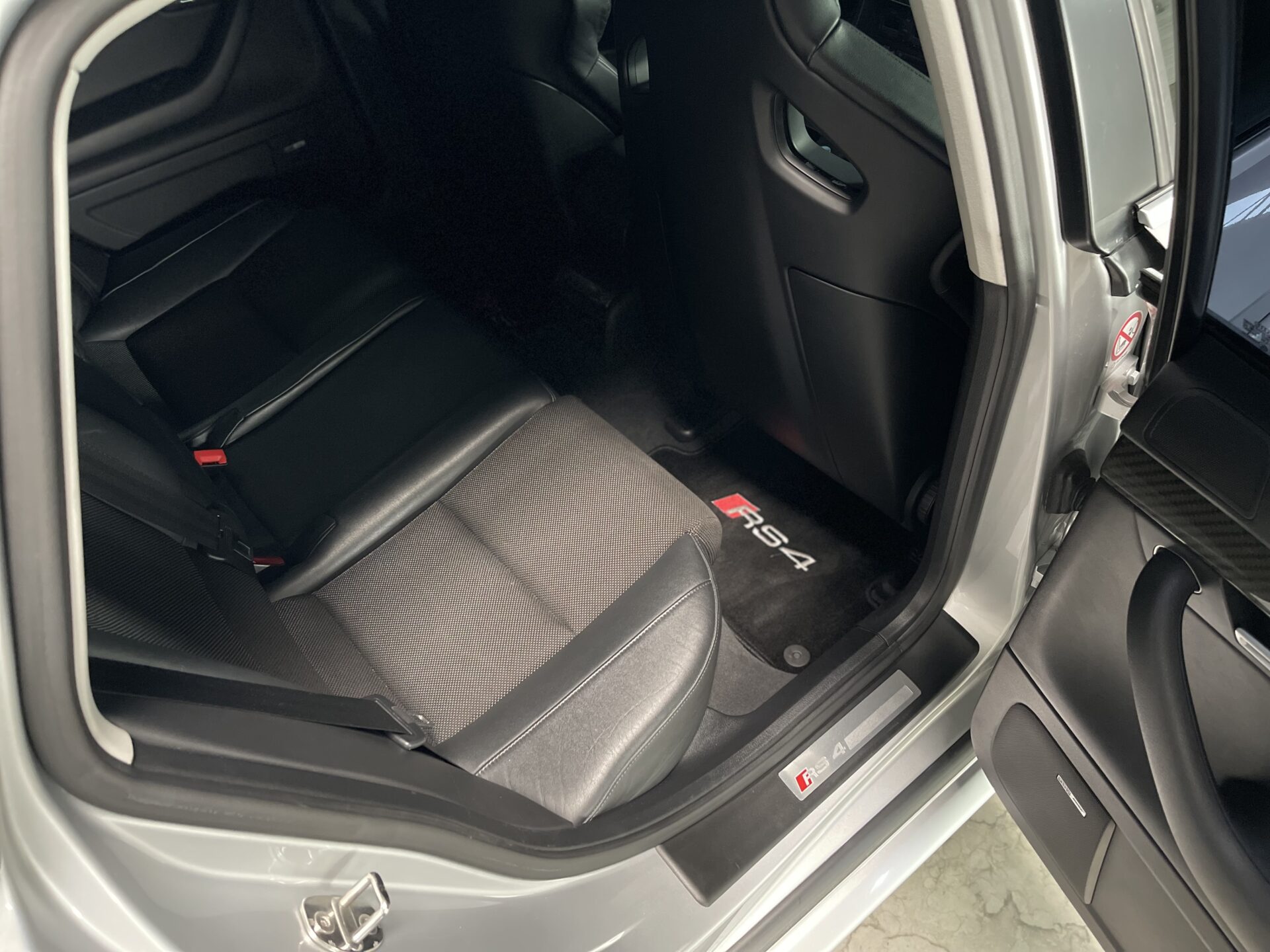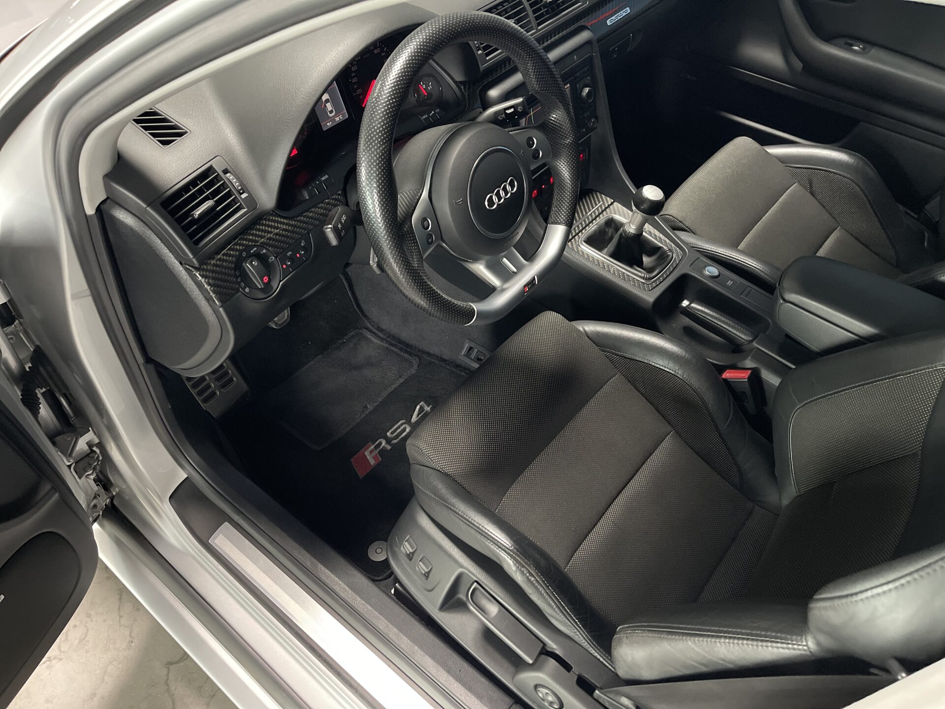 L'Audi RS4 ne néglige pas le confort et s'équipe de nombreux équipements de série : 4 coussins gonflables de sécurité (« airbags »), dont le système en rideaux couvrant toute la surface vitrée latérale et le montant central en cas d’accident21, les projecteurs au xénon, l'aide au stationnement avant et arrière, la climatisation automatique bizone, le système d'immobilisation et de localisation par satellite, le régulateur de vitesse, le réglage électrique des sièges, etc. La particularité de l'intérieur de l'Audi RS4 est de proposer, gratuitement, deux types d'ambiance : une confort, reprenant les éléments de l'S4 dont notamment les sièges baquets Recaro, ou bien une version sportive siglée « RS » comprenant de nombreux inserts de carbone ainsi que de nouveaux sièges baquets.