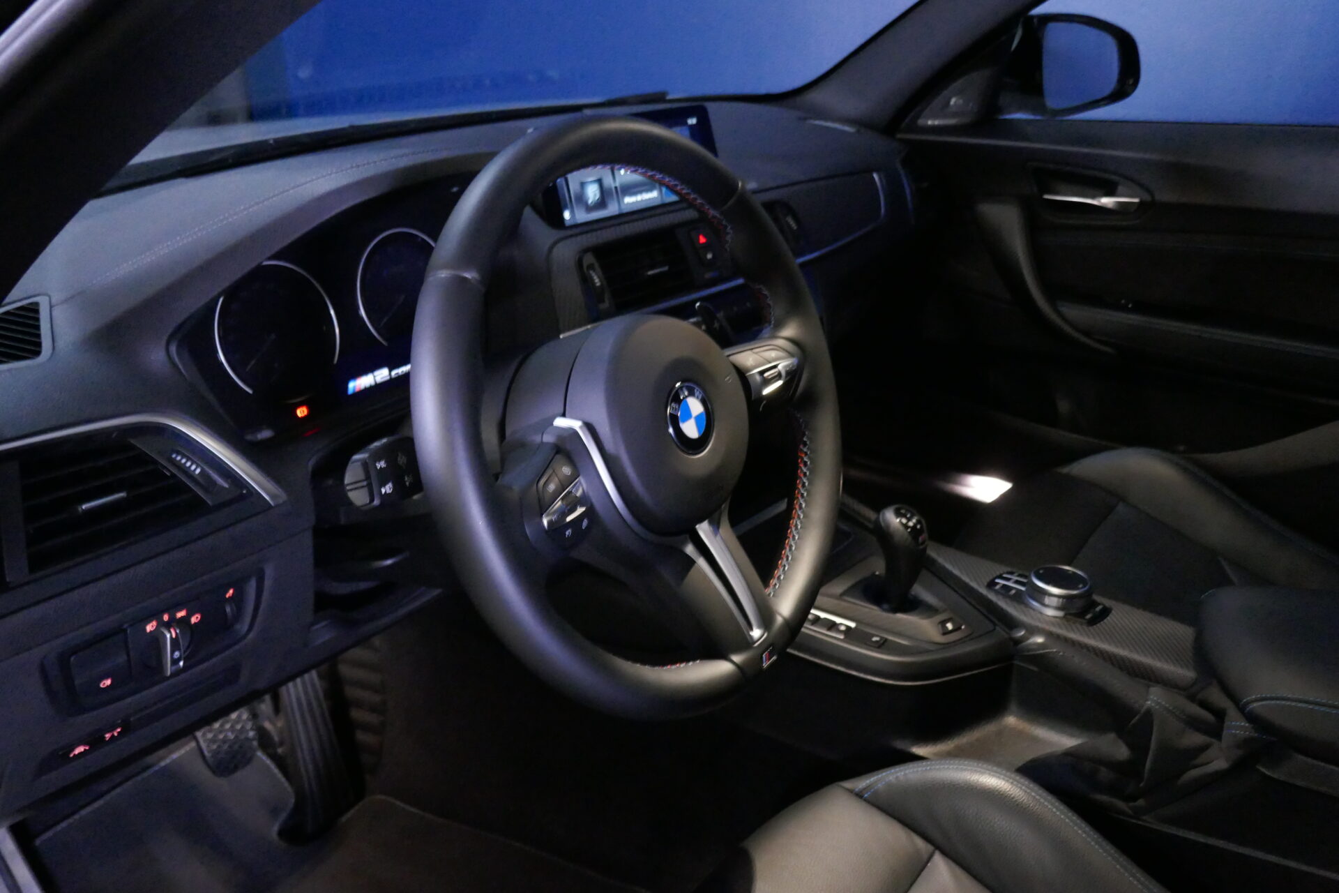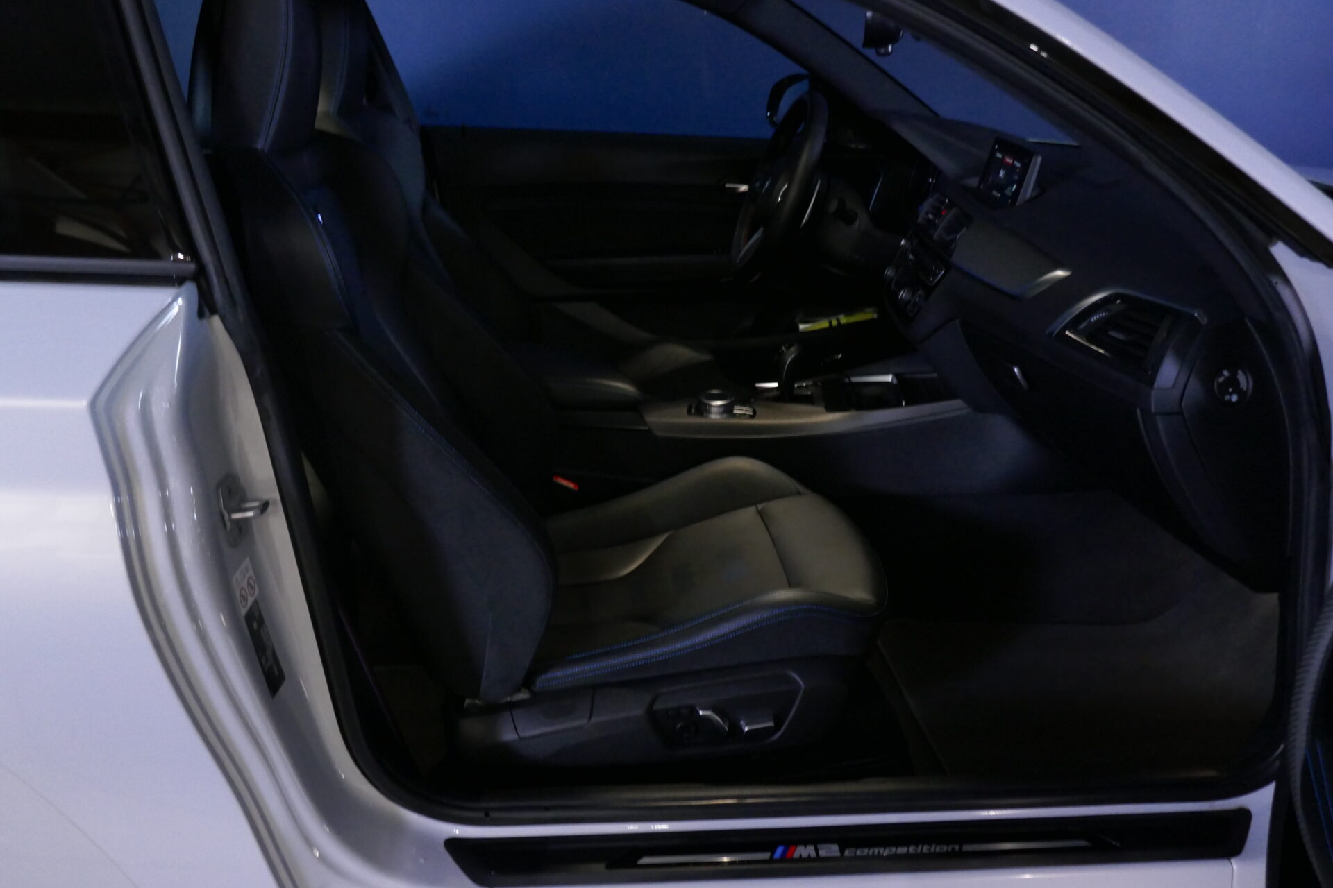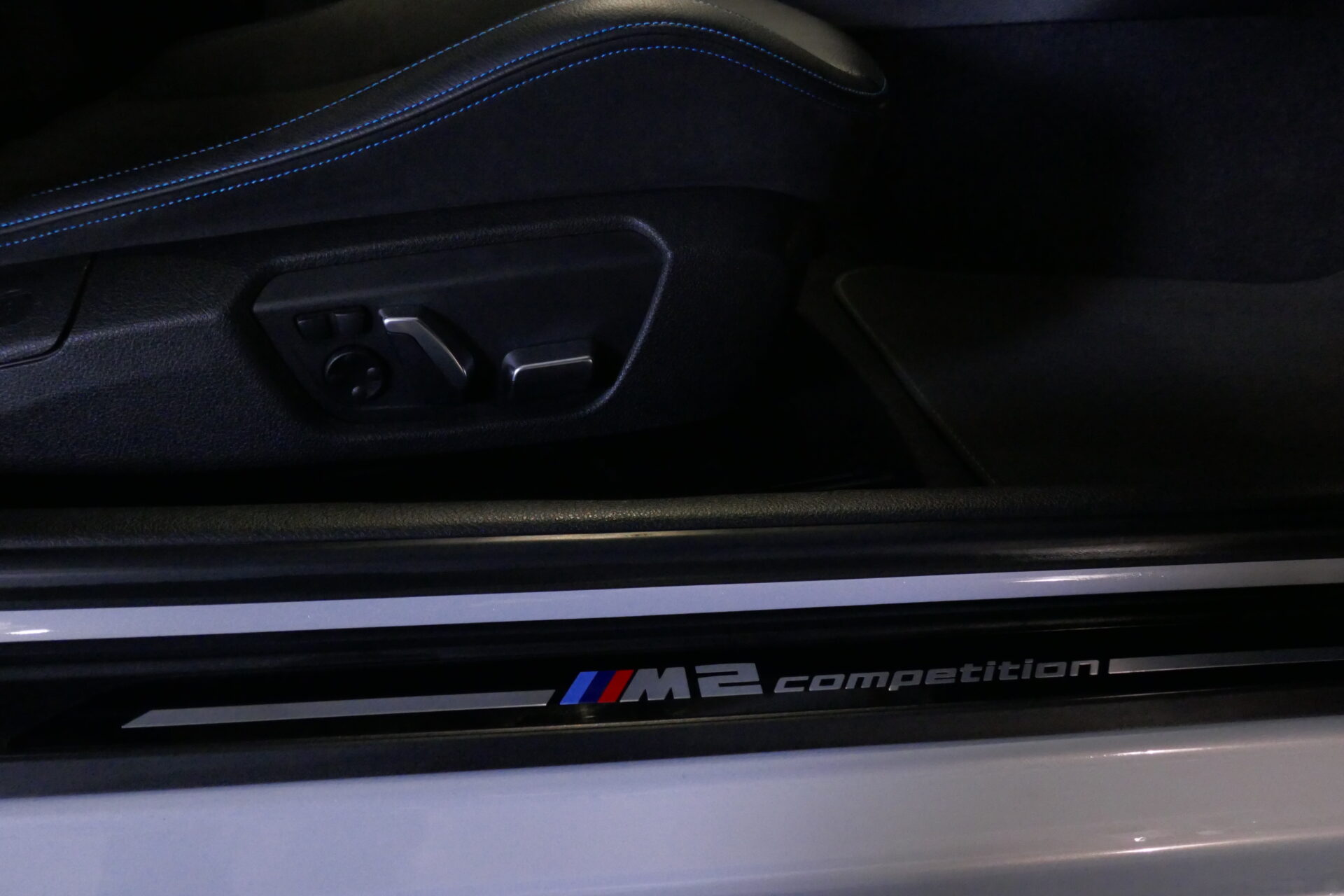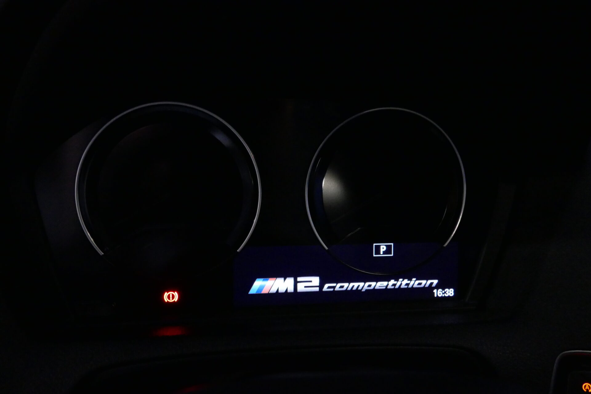À l'ouverture des portières, on découvre des seuils estampillés « M2 Compétition », que l'on peut compléter en option (1 550 €) par des sièges sport arborant un logo M2 rétro-éclairé. L'instrumentation (partiellement numérique) est claire et lisible. L'écran du GPS est tactile, et moteur, boîte DKG et direction se règlent individuellement grâce à des boutons situés sur la console centrale. Pour plus de facilité, il est possible de préprogrammer deux réglages accessibles au volant par les touches « M1 » et « M2 ». Au delà de l'équipement, plutôt complet, la BMW M2 Compétition garde ce qui fait la force des modèles M : la polyvalence. Elle propose en effet un habitacle bien fini et accueillant, avec deux vraies places arrière et un coffre plus que correct. Bref, la BMW M2 Compétition peut parfaitement être utilisée au quotidien, y compris pour déposer les enfants à l'école. Rares sont les sportives de ce niveau de gamme à pouvoir en dire autant.