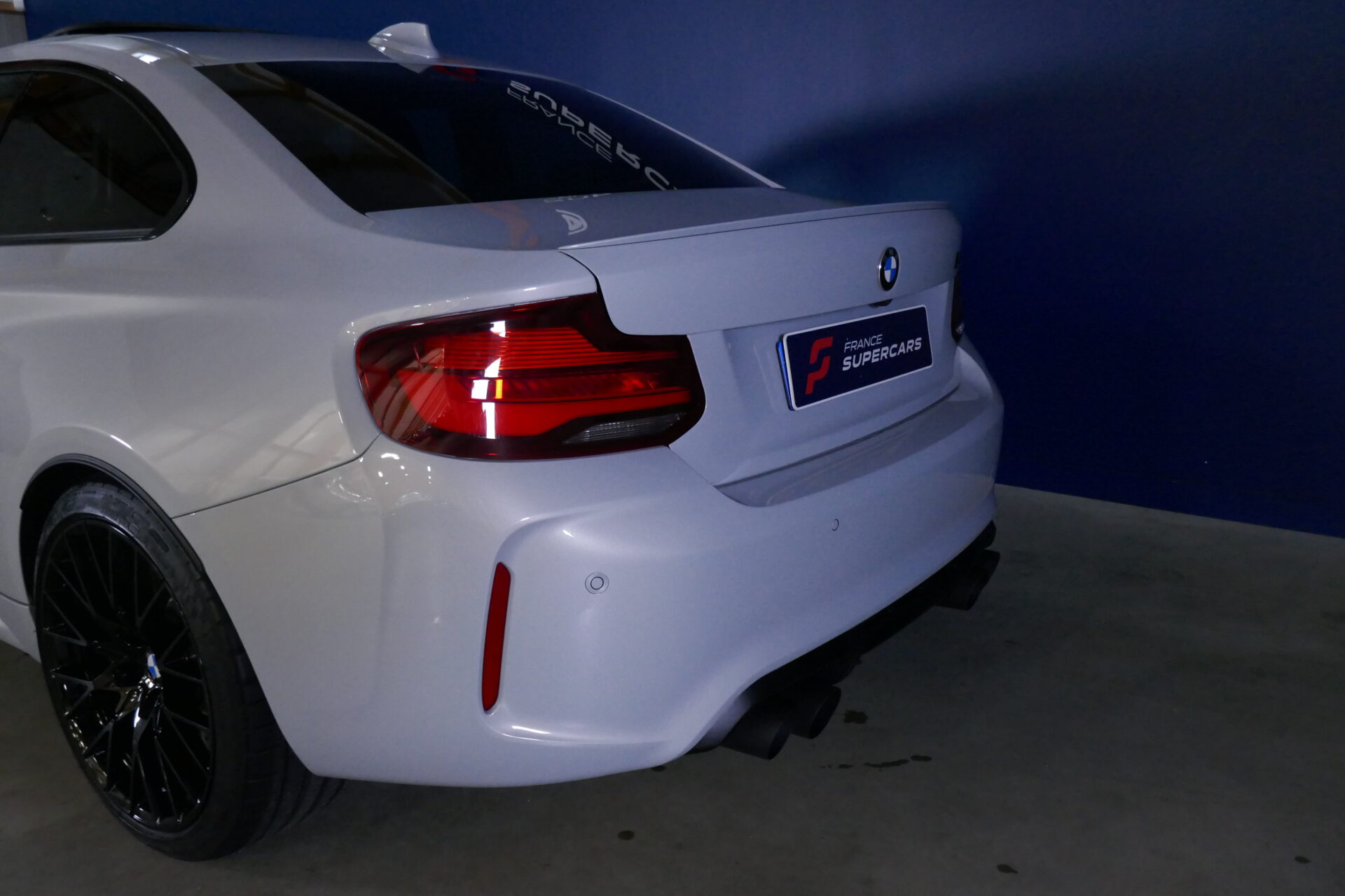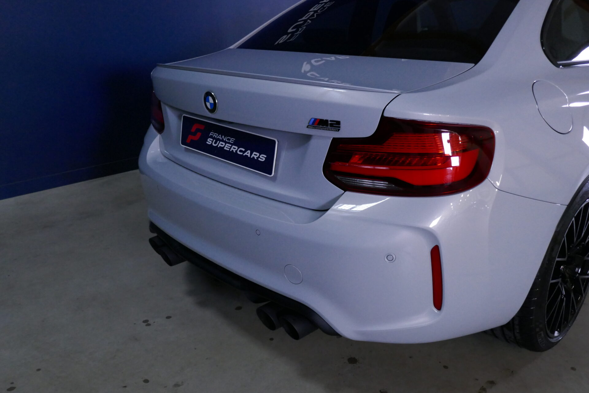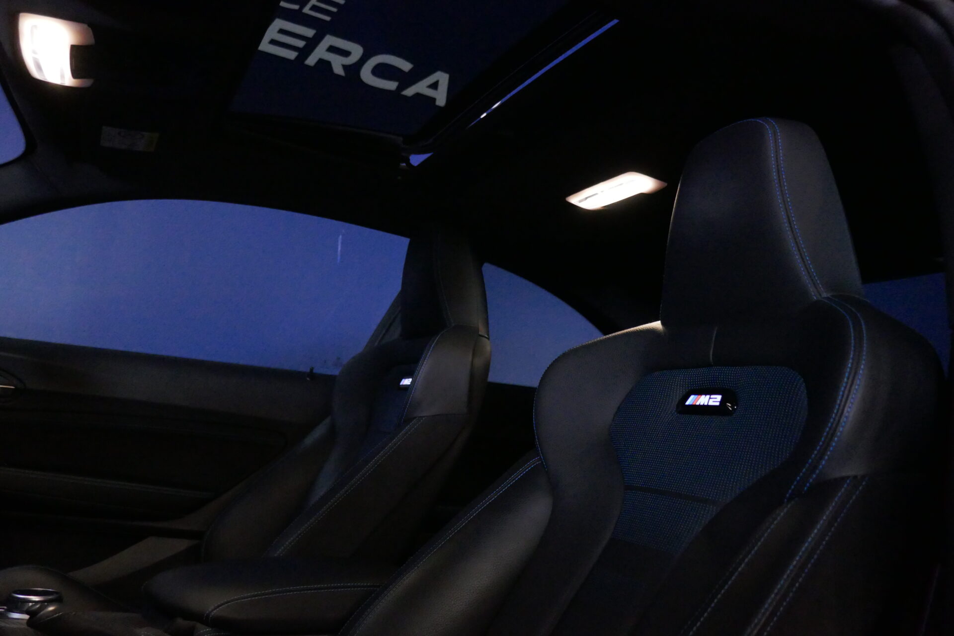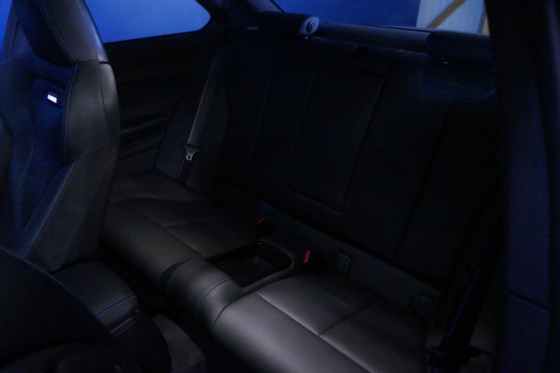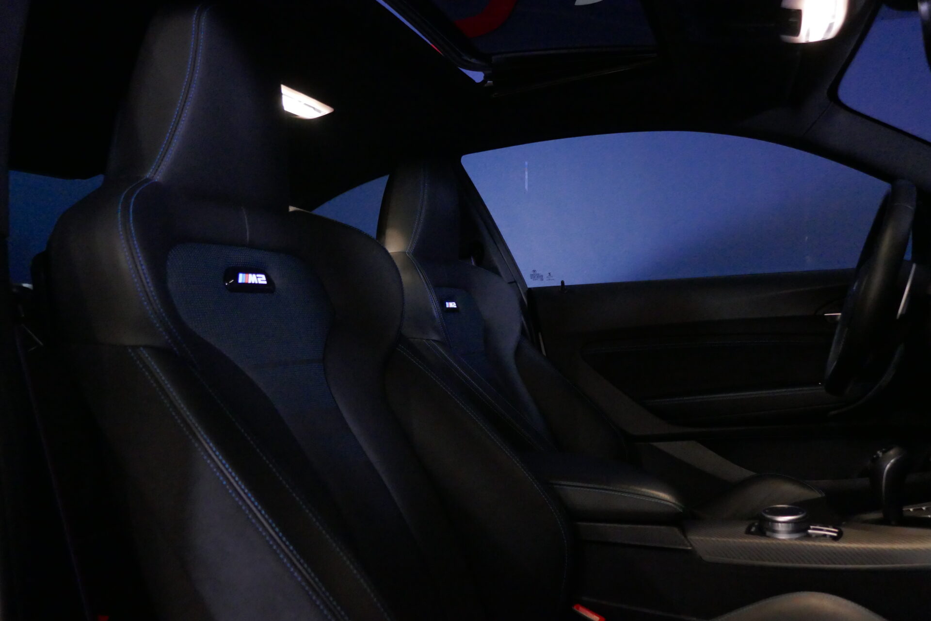 À l'ouverture des portières, on découvre des seuils estampillés « M2 Compétition », que l'on peut compléter en option (1 550 €) par des sièges sport arborant un logo M2 rétro-éclairé. L'instrumentation (partiellement numérique) est claire et lisible. L'écran du GPS est tactile, et moteur, boîte DKG et direction se règlent individuellement grâce à des boutons situés sur la console centrale. Pour plus de facilité, il est possible de préprogrammer deux réglages accessibles au volant par les touches « M1 » et « M2 ». Au delà de l'équipement, plutôt complet, la BMW M2 Compétition garde ce qui fait la force des modèles M : la polyvalence. Elle propose en effet un habitacle bien fini et accueillant, avec deux vraies places arrière et un coffre plus que correct. Bref, la BMW M2 Compétition peut parfaitement être utilisée au quotidien, y compris pour déposer les enfants à l'école. Rares sont les sportives de ce niveau de gamme à pouvoir en dire autant.