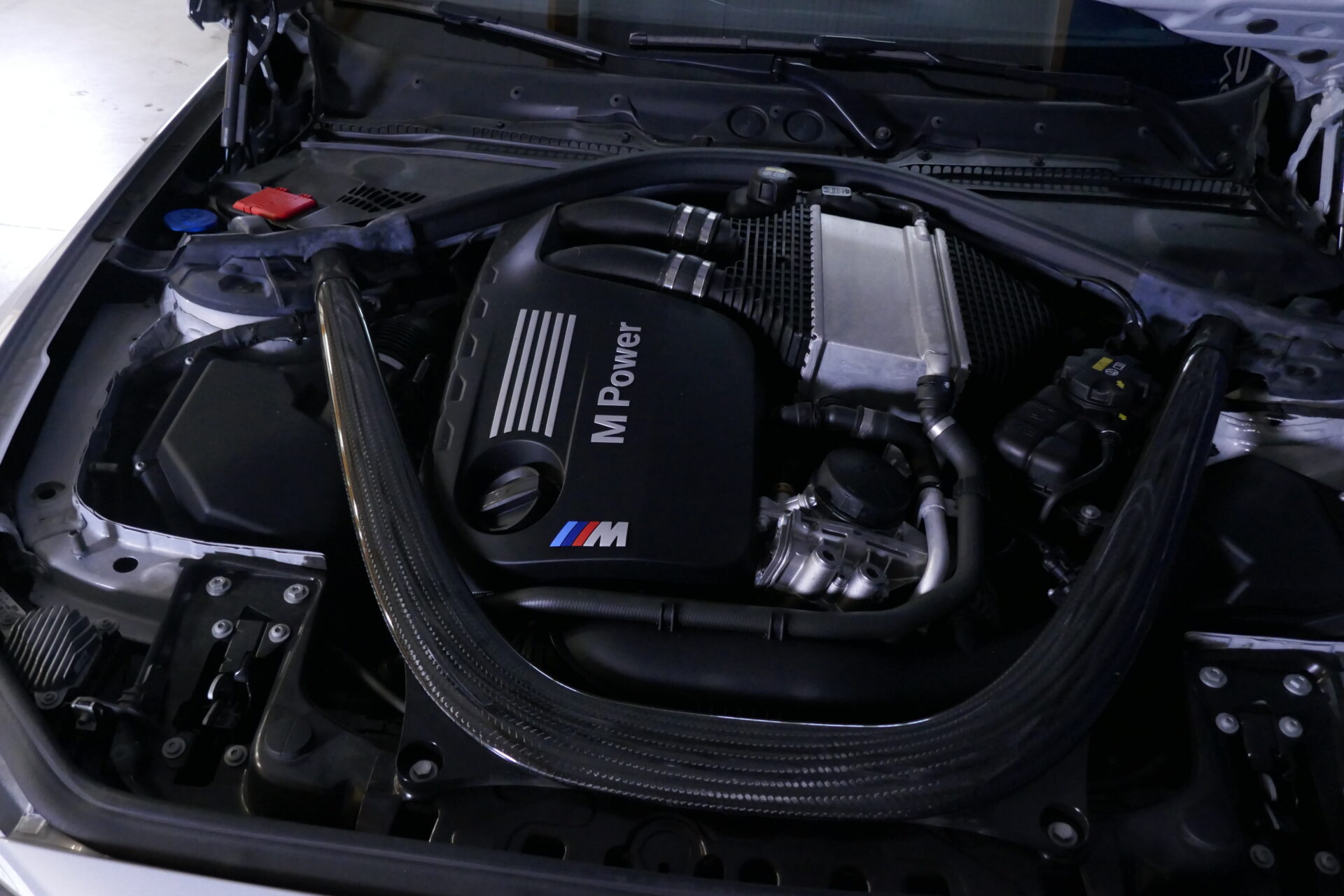 En ouvrant le capot, surprise : on découvre la même barre de rigidification en carbone que sur les M3 et M4 ! Cet élément permet de renforcer toute la partie avant, au bénéfice de la précision de la direction, moyennant un alourdissement minime (la barre en carbone seule ne pèse que 1,5 kilo). Les trains roulants sont toujours issus des M3 et M4, mais c'est désormais également le cas du moteur : le N55 de la précédente M2 cède ainsi sa place au S55, un « vrai » moteur M, doté de deux turbocompresseurs, de pistons renforcés ou encore d'un vilebrequin allégé. Le circuit de lubrification est également optimisé, tandis que le refroidissement a été amélioré. Enfin, un nouveau système d'échappement actif à clapets a été installé. Pour respecter l'ordre de préséance dans la gamme M, la M2 Compétition se contente cependant de 410 ch, contre 431 pour la M4. Et comme elle n'est que 20 kg plus légère, la grande sœur conserve l'avantage en matière de rapport poids/puissance. Mais les deux modèles affichent en revanche exactement la même valeur de couple maxi : la bagatelle de 550 Nm !