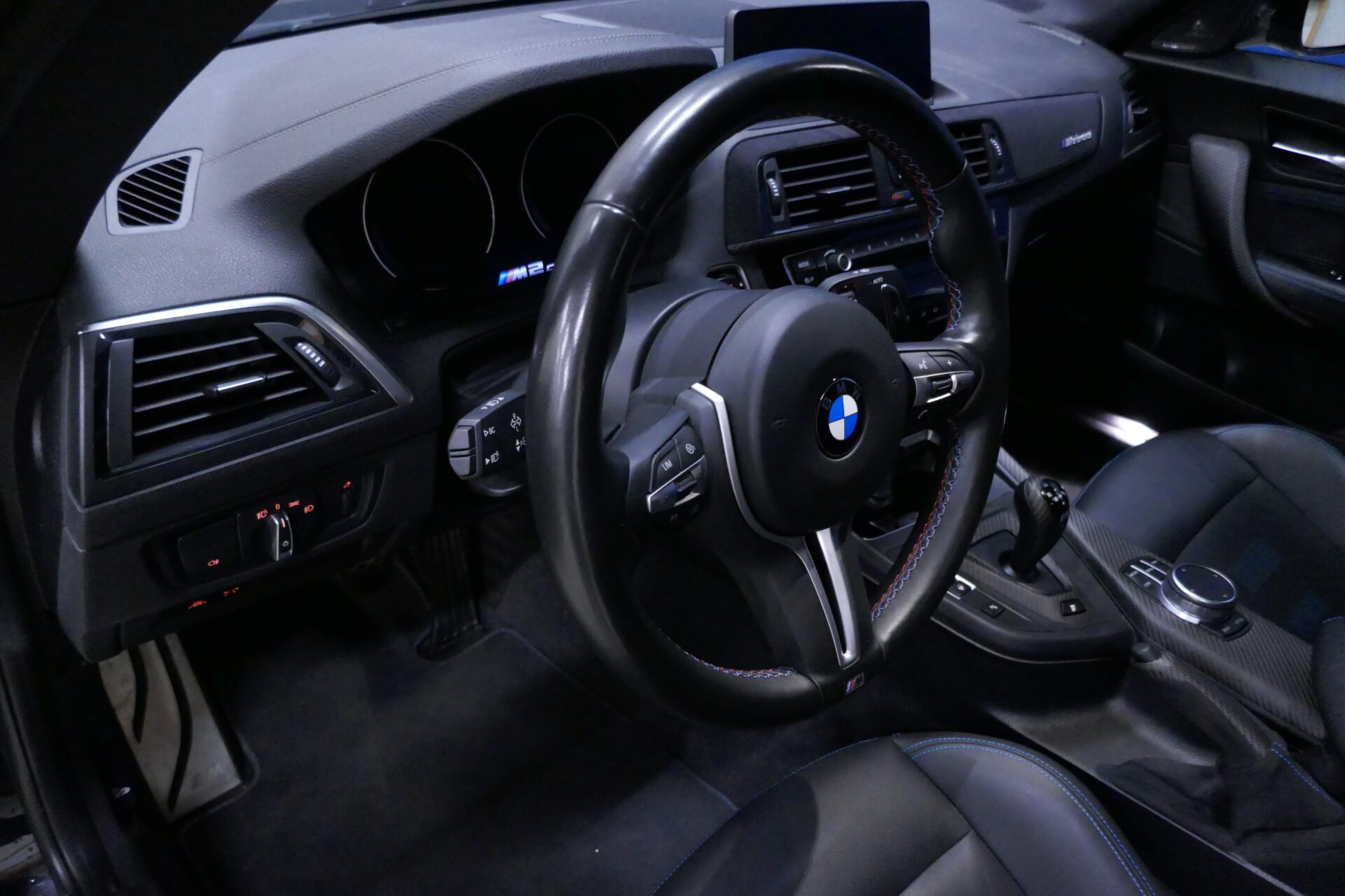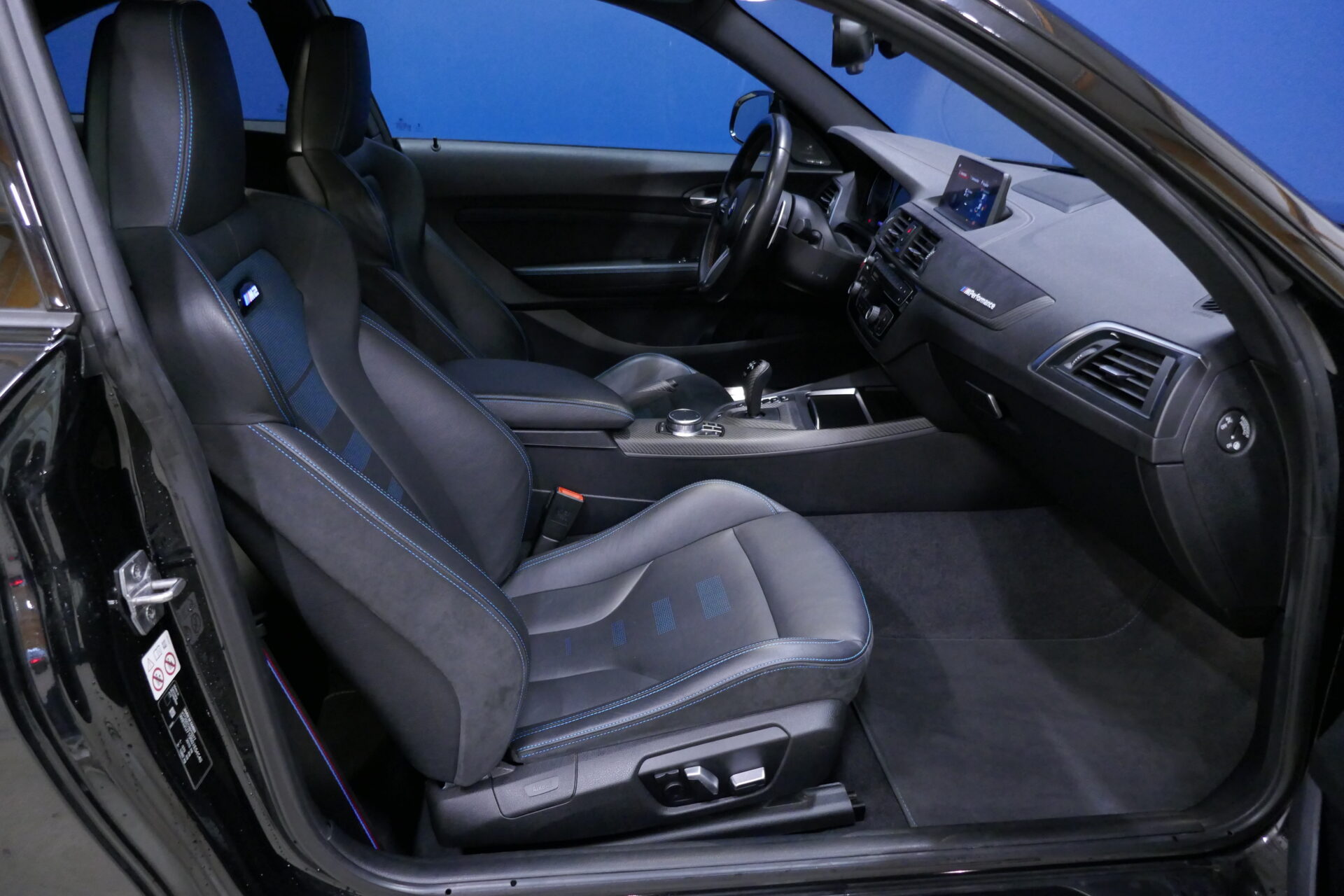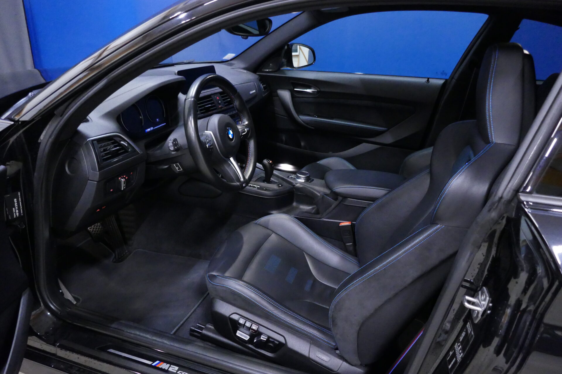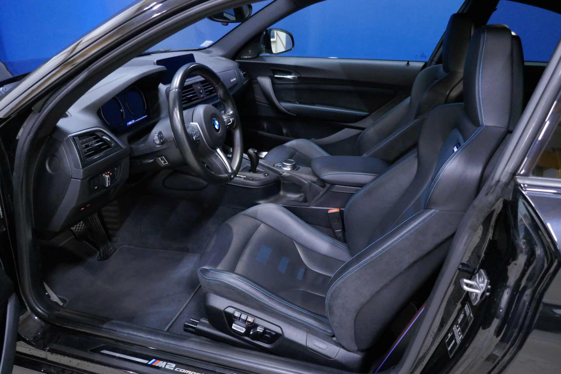 À l'ouverture des portières, on découvre des seuils estampillés « M2 Compétition », que l'on peut compléter en option (1 550 €) par des sièges sport arborant un logo M2 rétro-éclairé. L'instrumentation (partiellement numérique) est claire et lisible. L'écran du GPS est tactile, et moteur, boîte DKG et direction se règlent individuellement grâce à des boutons situés sur la console centrale. Pour plus de facilité, il est possible de préprogrammer deux réglages accessibles au volant par les touches « M1 » et « M2 ». Au delà de l'équipement, plutôt complet, la BMW M2 Compétition garde ce qui fait la force des modèles M : la polyvalence. Elle propose en effet un habitacle bien fini et accueillant, avec deux vraies places arrière et un coffre plus que correct. Bref, la BMW M2 Compétition peut parfaitement être utilisée au quotidien, y compris pour déposer les enfants à l'école. Rares sont les sportives de ce niveau de gamme à pouvoir en dire autant.