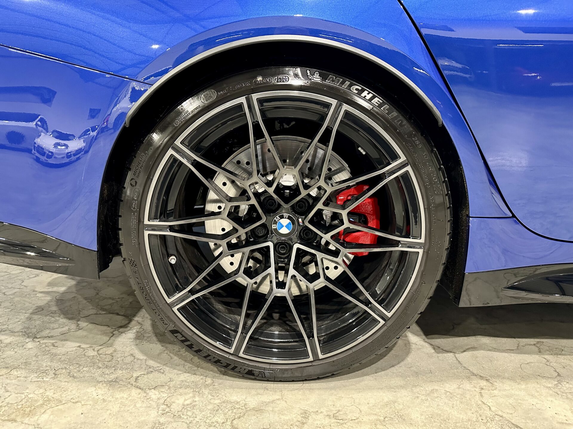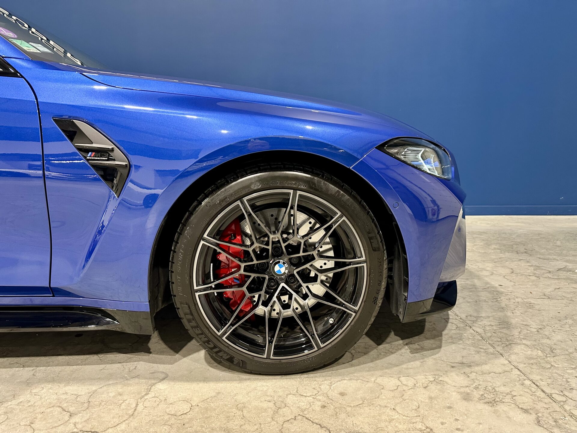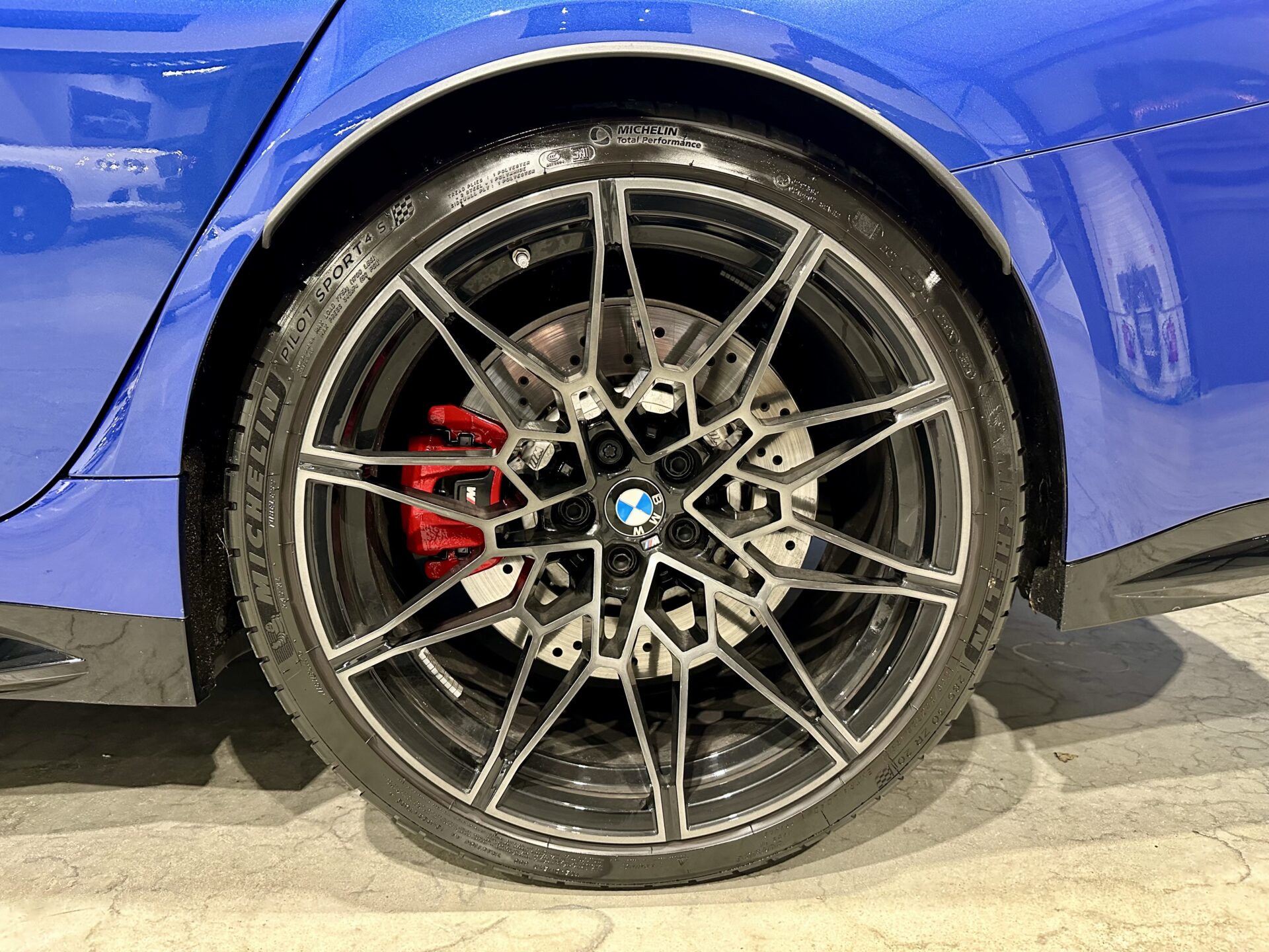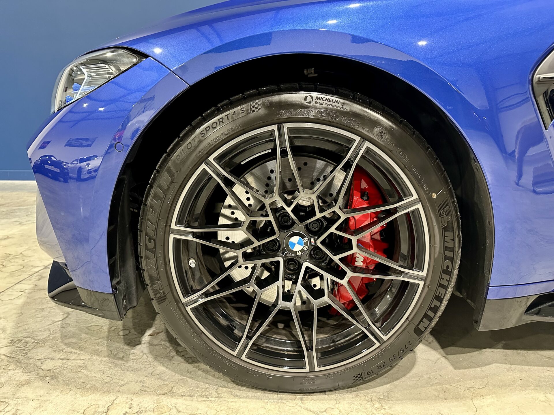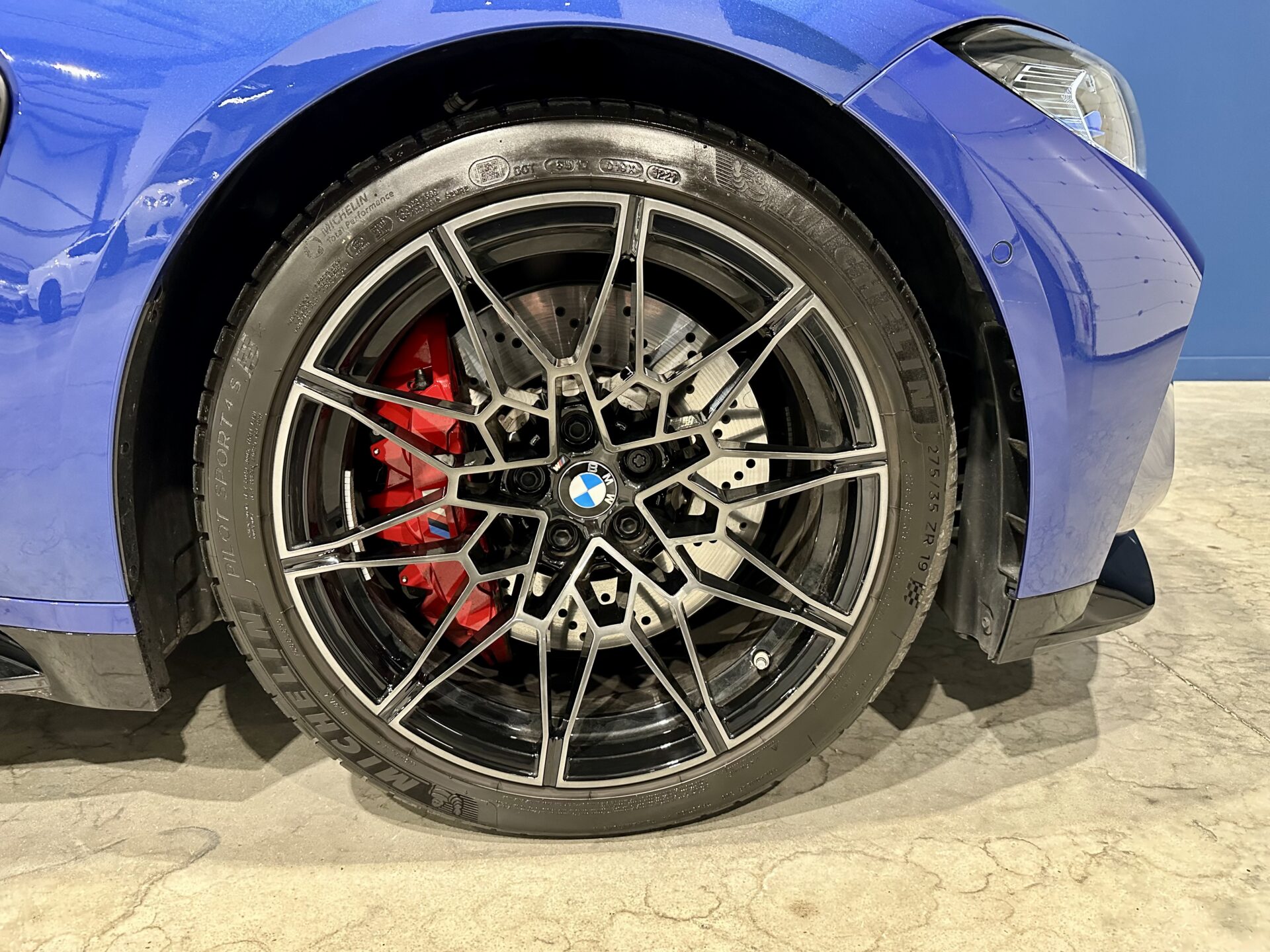 La BMW M3 et M4 Compétition accueillent des disques ventilés et percés, de 380 mm à l’avant et de 370 mm à l’arrière. Ils sont pincés par des étriers fixes à six pistons devant, flottants à un piston derrière. La pression de freinage est assurée par un module électro-hydraulique qui permet, entre autres, de faire varier la réponse à la pédale selon deux modes, Confort et Sport.