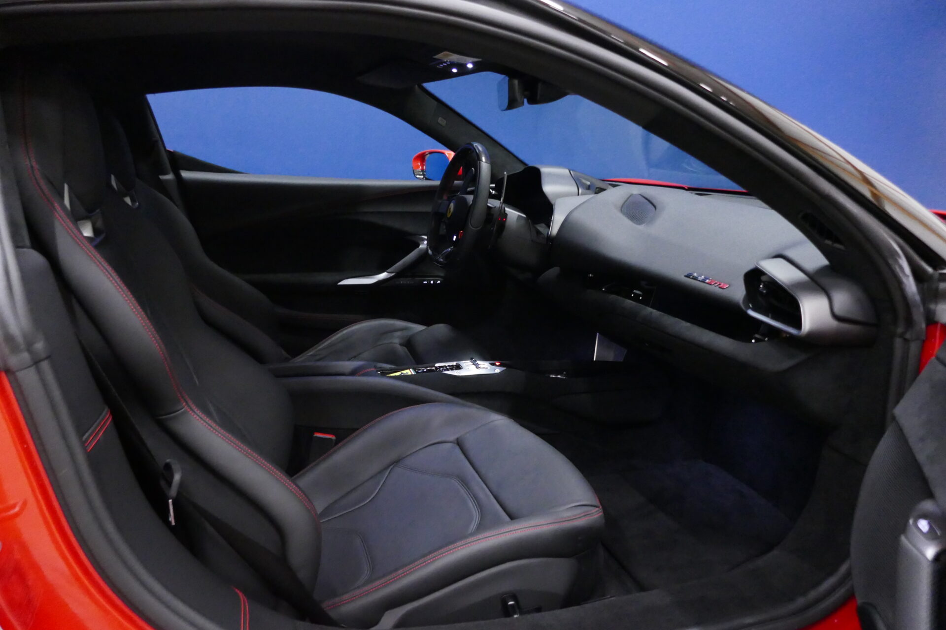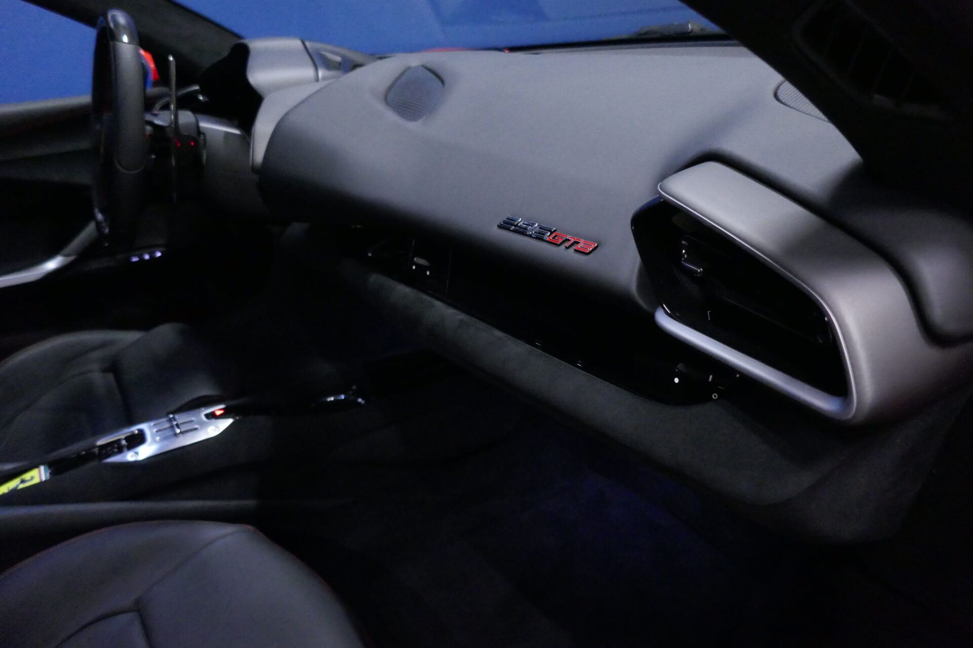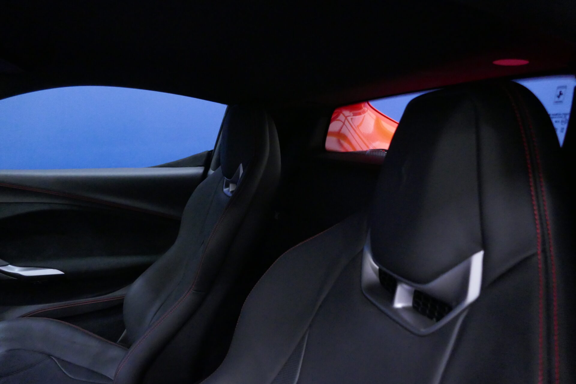 En basculant le e-Manettino sur Performance, afin que le V6 s’éveille et que la chaine de traction maintienne toujours de l’énergie dans la batterie pour disposer d’un maximum de puissance en permanence. Manettino sur Race, la 296 dévoile alors l’autre facette de son visage, celle d’un Mirage 2000 qu’on aurait lâché sur la route. Dans une sonorité réussie, le nouveau V6 à 120° de Maranello montre toute l’étendue de sa force. De 1 500 tr/mn – où les turbos et le moteur électrique gomment déjà tout temps de réponse – à 8 500 tr/mn, la GTB vous satellise en permanence. Plus que les accélérations brutes (0 à 100 km/h en 2,8 s, 0 à 200 km/h en 7,4 s), les reprises sont lunaires. Notamment parce que 900 Nm de couple sont disponibles ! Autant dire que sur la route, les vitesses atteintes sont ahurissantes, sans que jamais conducteurs ou passagers ne soient secoués. Comme toujours chez Ferrari, chaque rapport de boîte bénéficie de sa propre courbe de couple, afin de donner cette impression d’une puissance qui va crescendo au fil du compte-tours. Une progressivité qui manque d’ordinaire aux moteurs suralimentés. Autre bon point, le freinage, rassurant car à la fois puissant et dosable. Gérée à la quasi-perfection quel que soit le type de conduite, la boîte “8” répond au millimètre près au pied droit et permet de se passer totalement des palettes pour profiter de la précision de la 296.