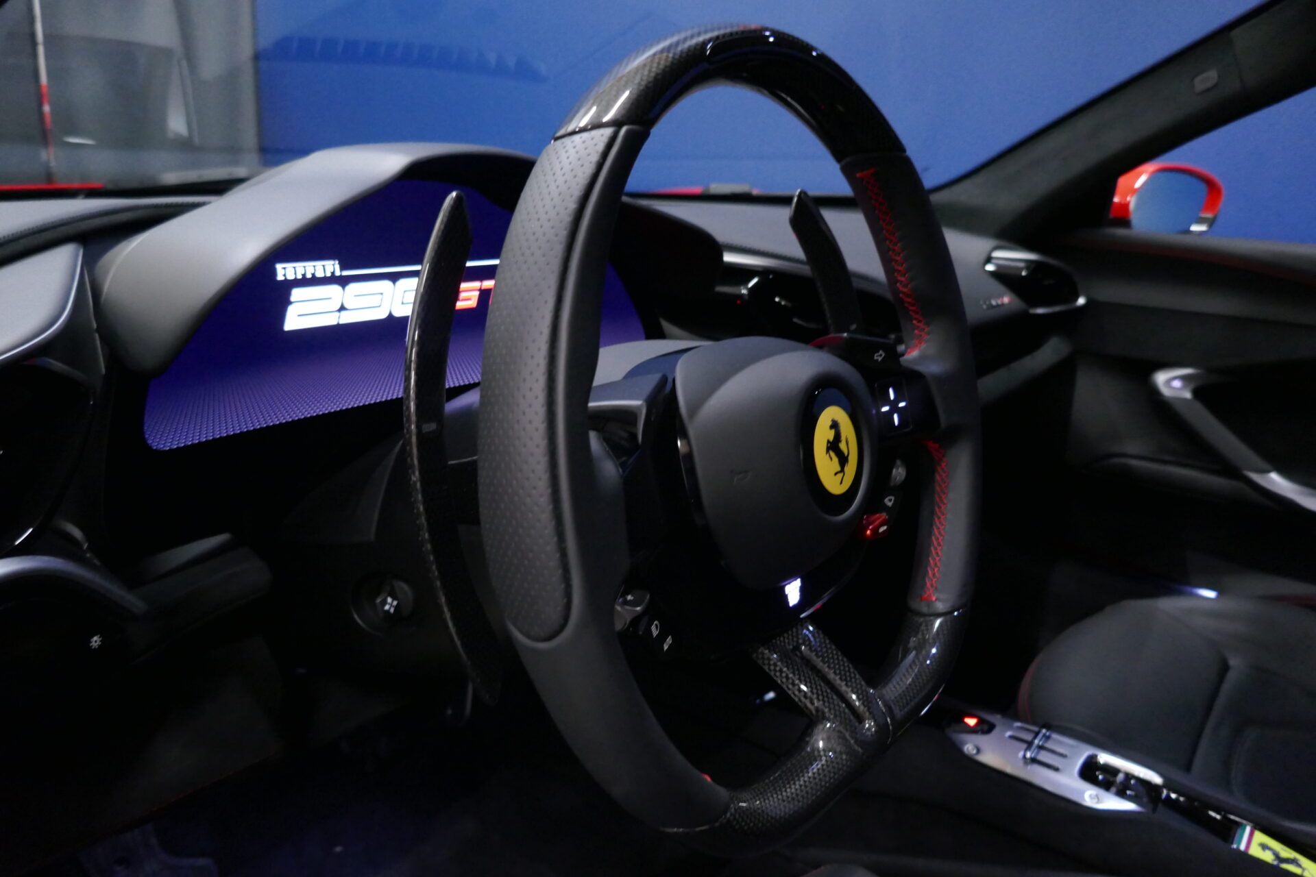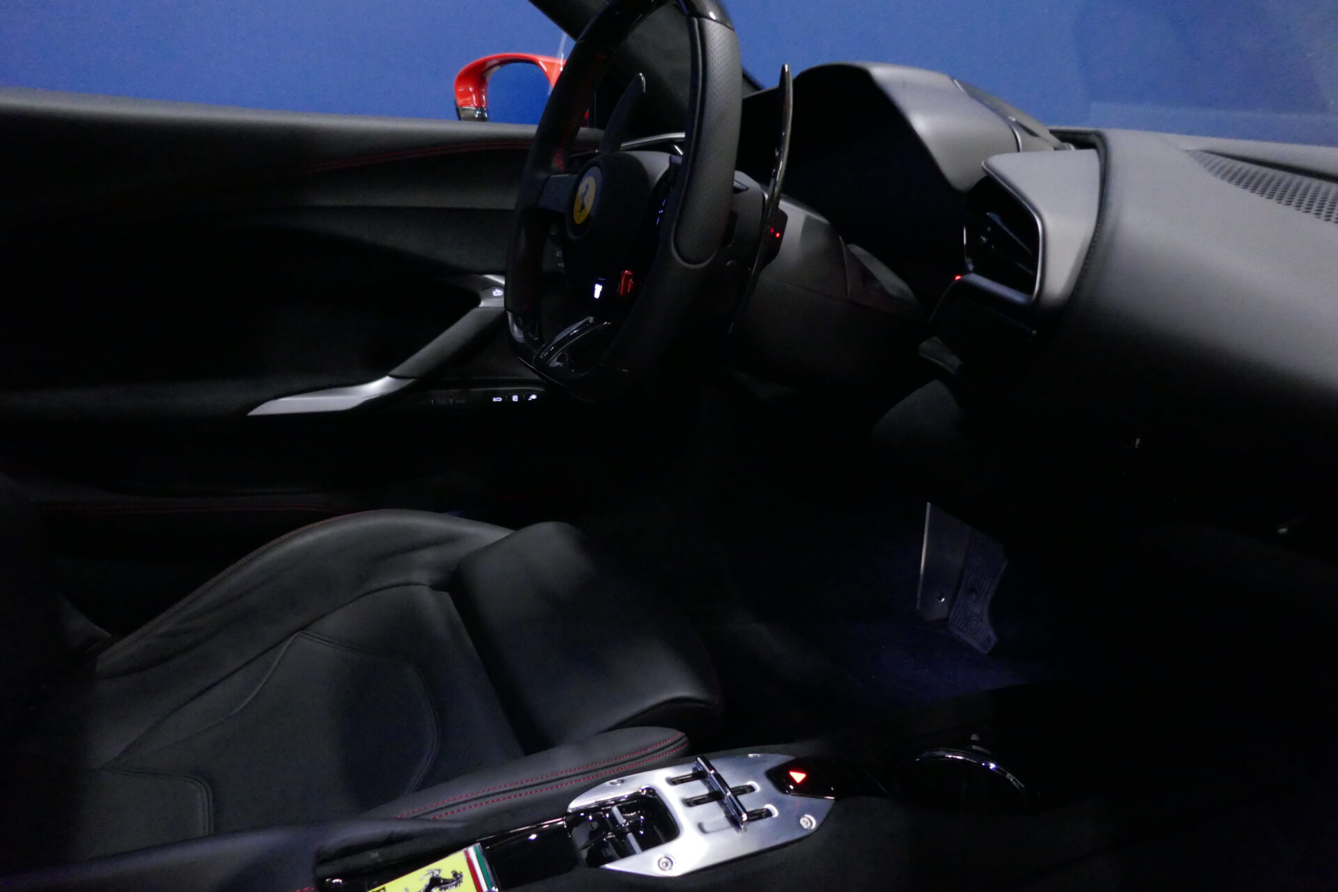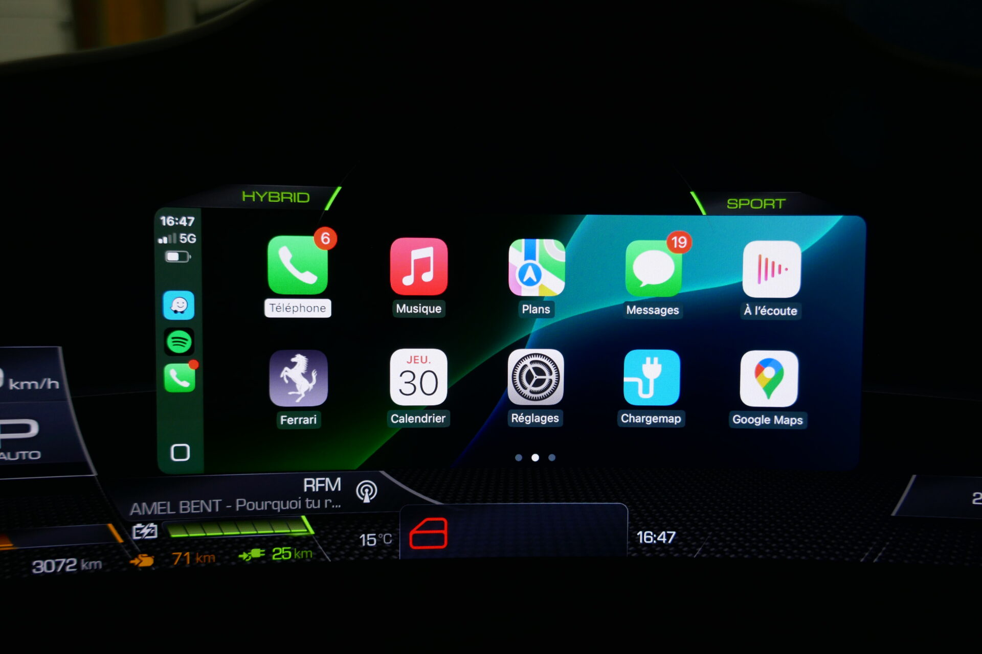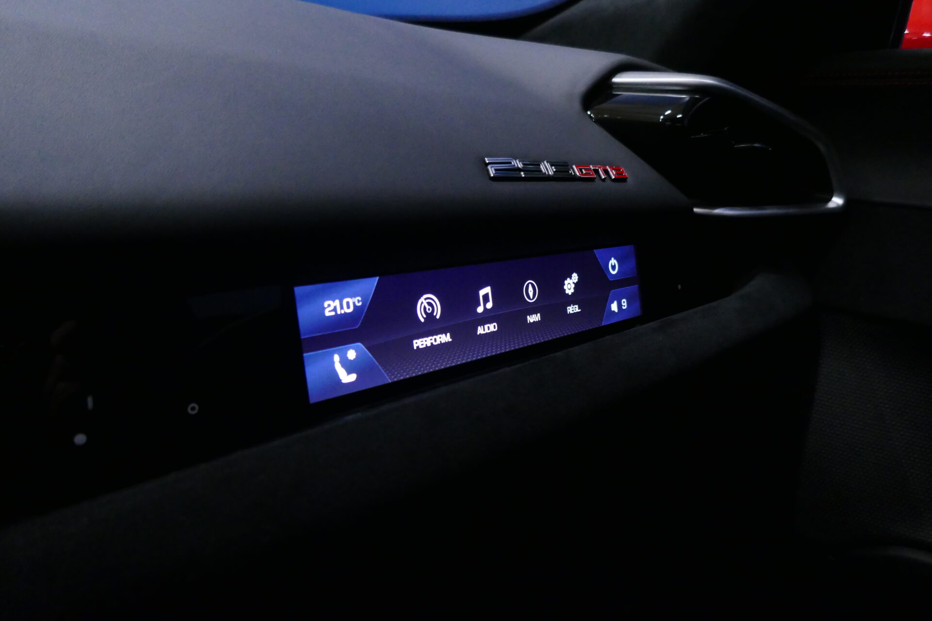 Dans un intérieur singeant celui de la récente SF90 Stradale, avec une ergonomie qui tourne, comme toujours, quasi exclusivement autour du volant. Mais cette 296 n’est pas seulement là pour donner des cours d’ergonomie. Un coup sur la palette de droite pour enclencher la 1ere de la boîte à double embrayage et la berlinette se déplace…sans le moindre bruit. Car avec sa batterie de 7,45 kWh (dont 6 utiles) et son moteur électrique puissant, l’italienne peut effectivement parcourir une bonne vingtaine de kilomètres sans avaler la moindre goutte de sans-plomb. Déroutant dans une Ferrari, d’autant que la vitesse maximale autorisée par le bloc électrique atteint tout de même 135 km/h sur le bon mode (eDrive sur le e-Manettino). De quoi entamer un petit périple dans un silence complet et dans le plus grand confort, cette 296 se montrant étonnamment souple en mode “Sport”.