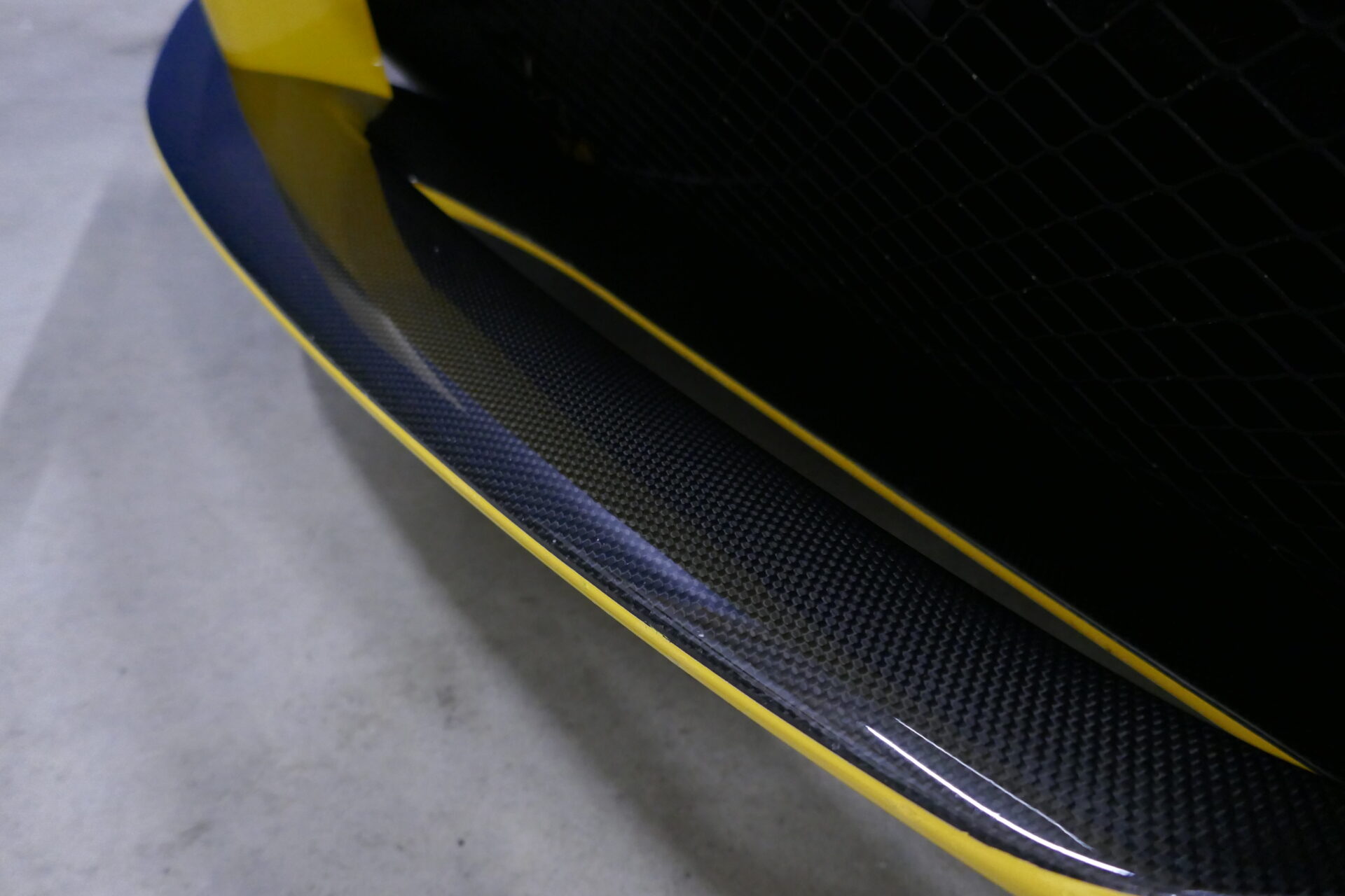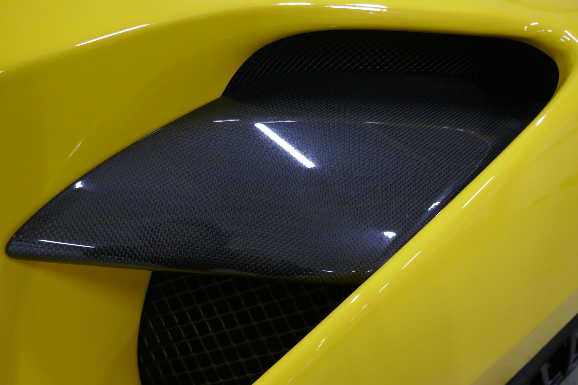 Le châssis et la carrosserie, dans leur intégralité, participent pleinement à l’aérodynamisme complexe de cette sportive hors norme. Résultat, la GTB fournit 50% d’appuis supplémentaires, tout en réduisant la traînée grâce à un bouclier avant, bouche ouverte et béante, séparé par deux montants verticaux, comme pour mieux aspirer l’air.
