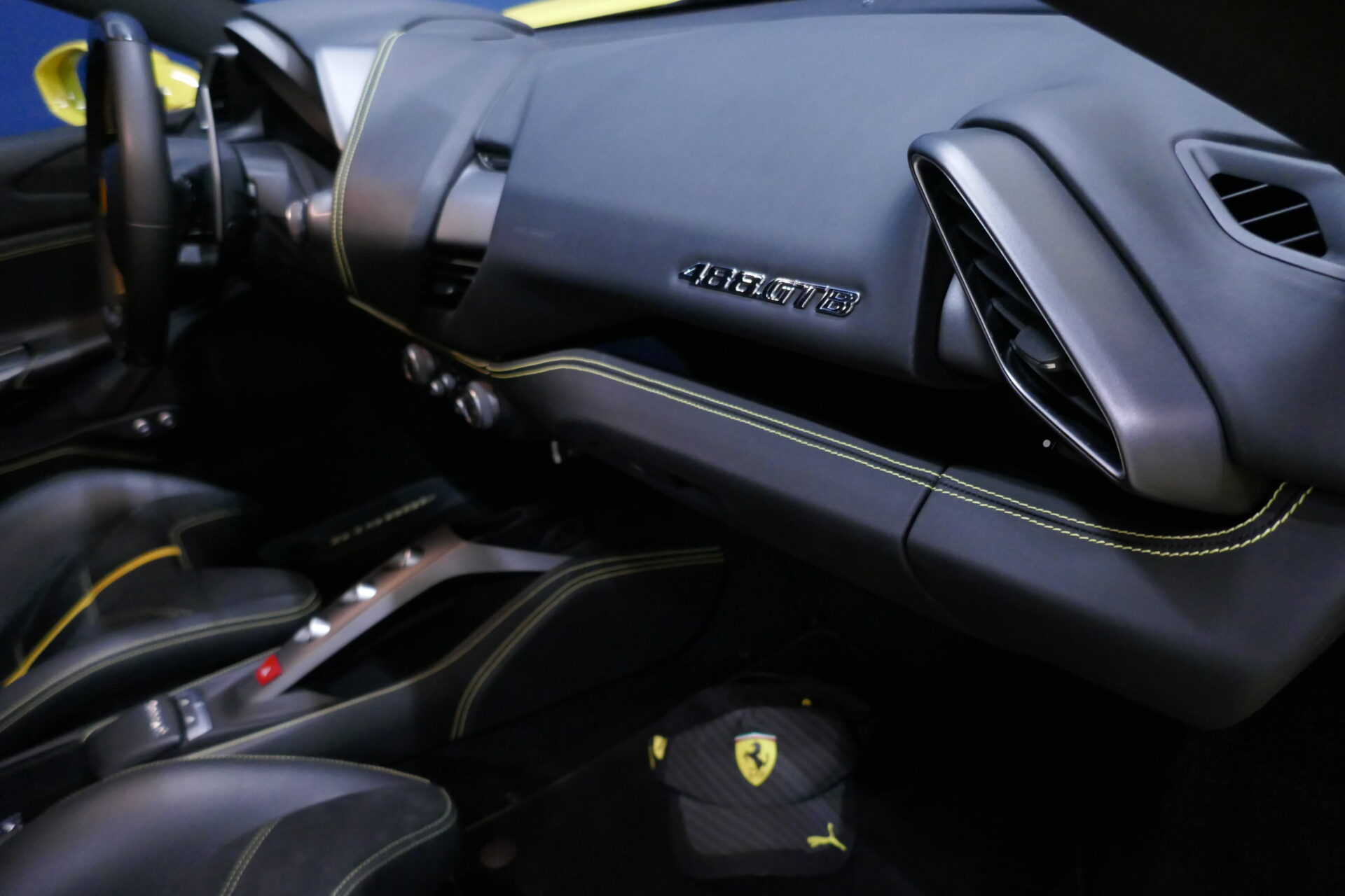Le cœur de cette 488 GTB s’expose toujours aussi fièrement sous son capot vitré, greffé désormais, de chaque côté, d’un turbo qui élargit la taille du moteur de 6 cm. Le nouveau bloc en alu développe 670 ch, dont le régime maxi culmine à 8000 tr/mn.