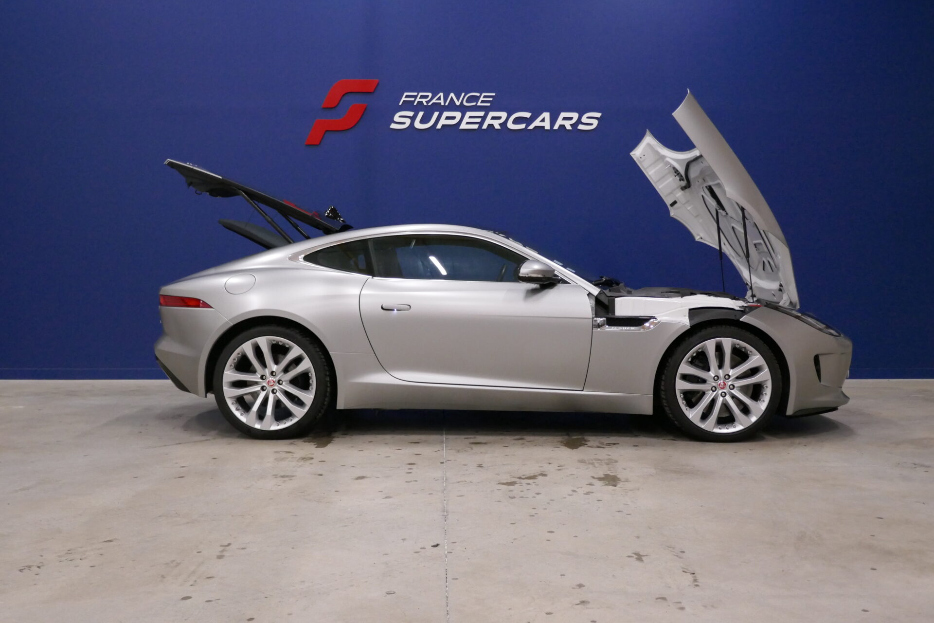 Solidement campé sur ses immenses roues, le coupé se distingue de la concurrence par une croupe qui n’est pas sans rappeler celle d’un break de chasse. Un arrière à la fois musclé et massif qui annonce sans vergogne des performances dignes des meilleures sportives. Pour ce qui est des proportions, la F-Type affiche une longueur de 4,47 m pour une largeur de 1,92 m. Le tout est équilibré et hautement désirable, comme sait si bien le faire le designer britannique Ian Callum, le père du modèle.