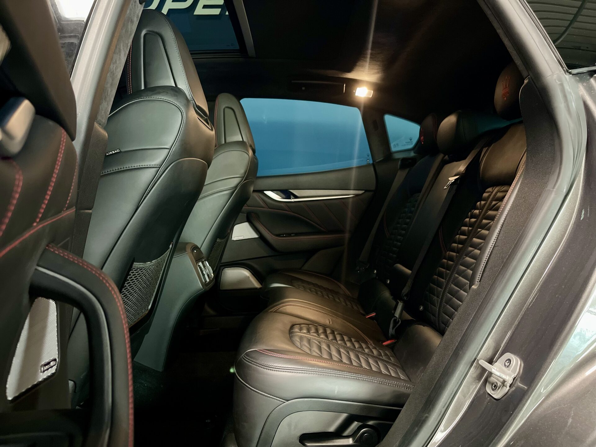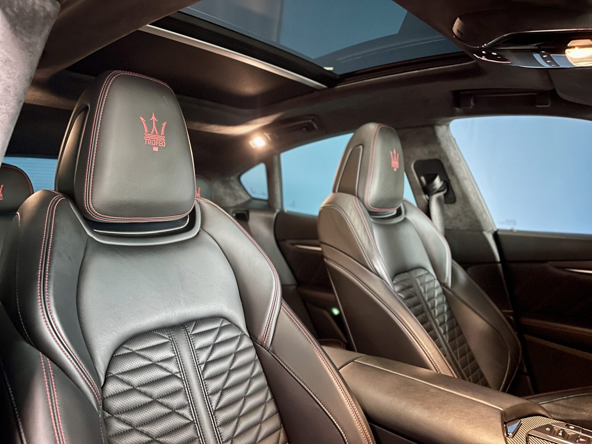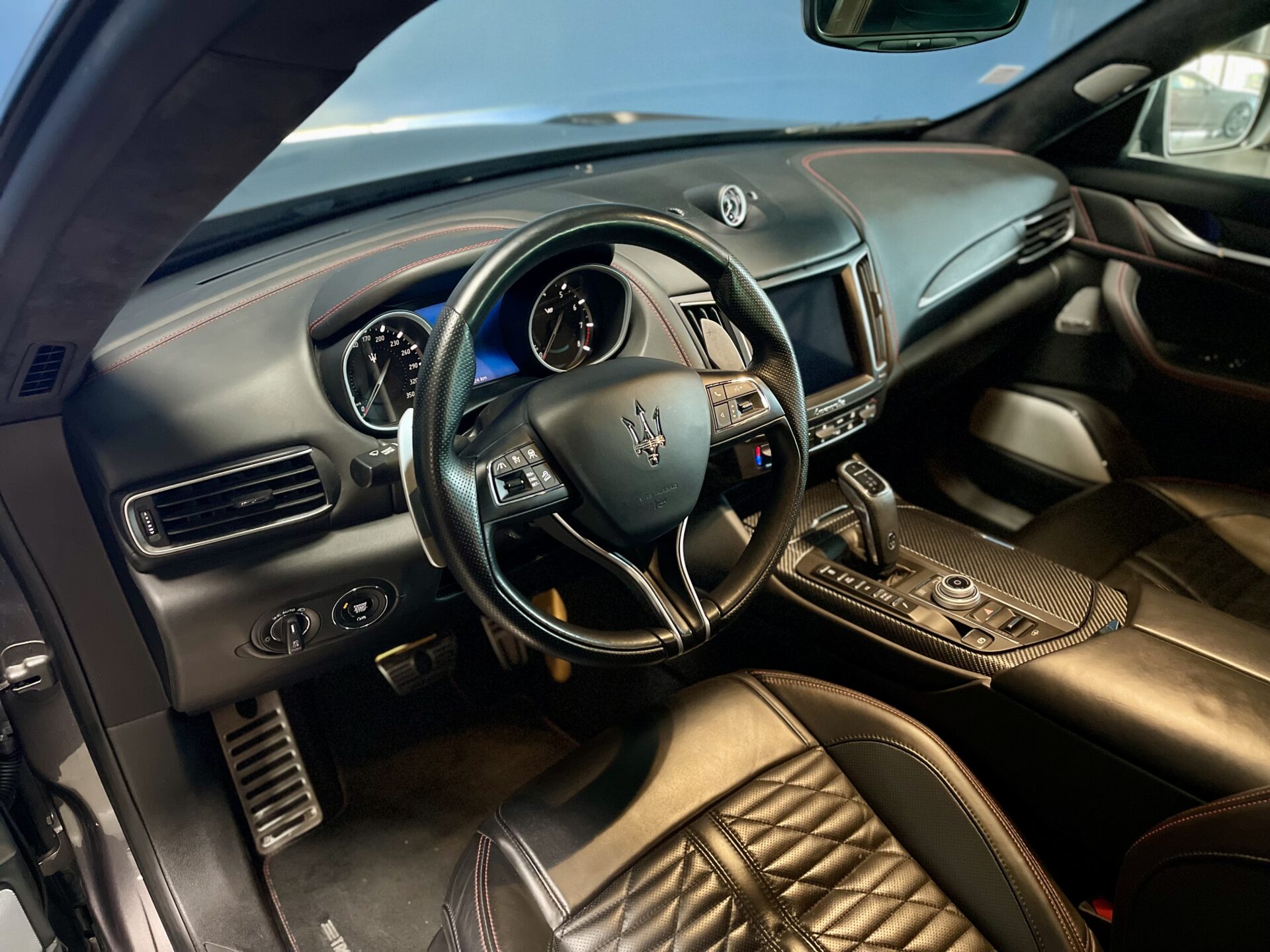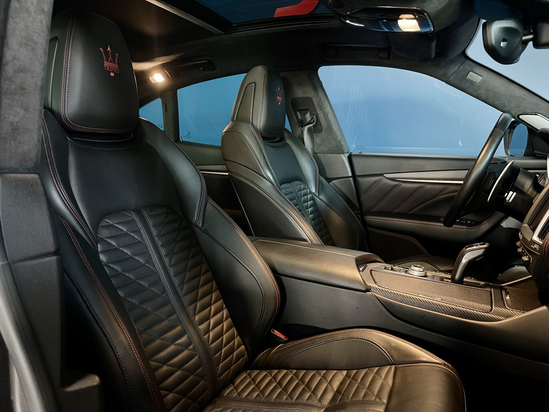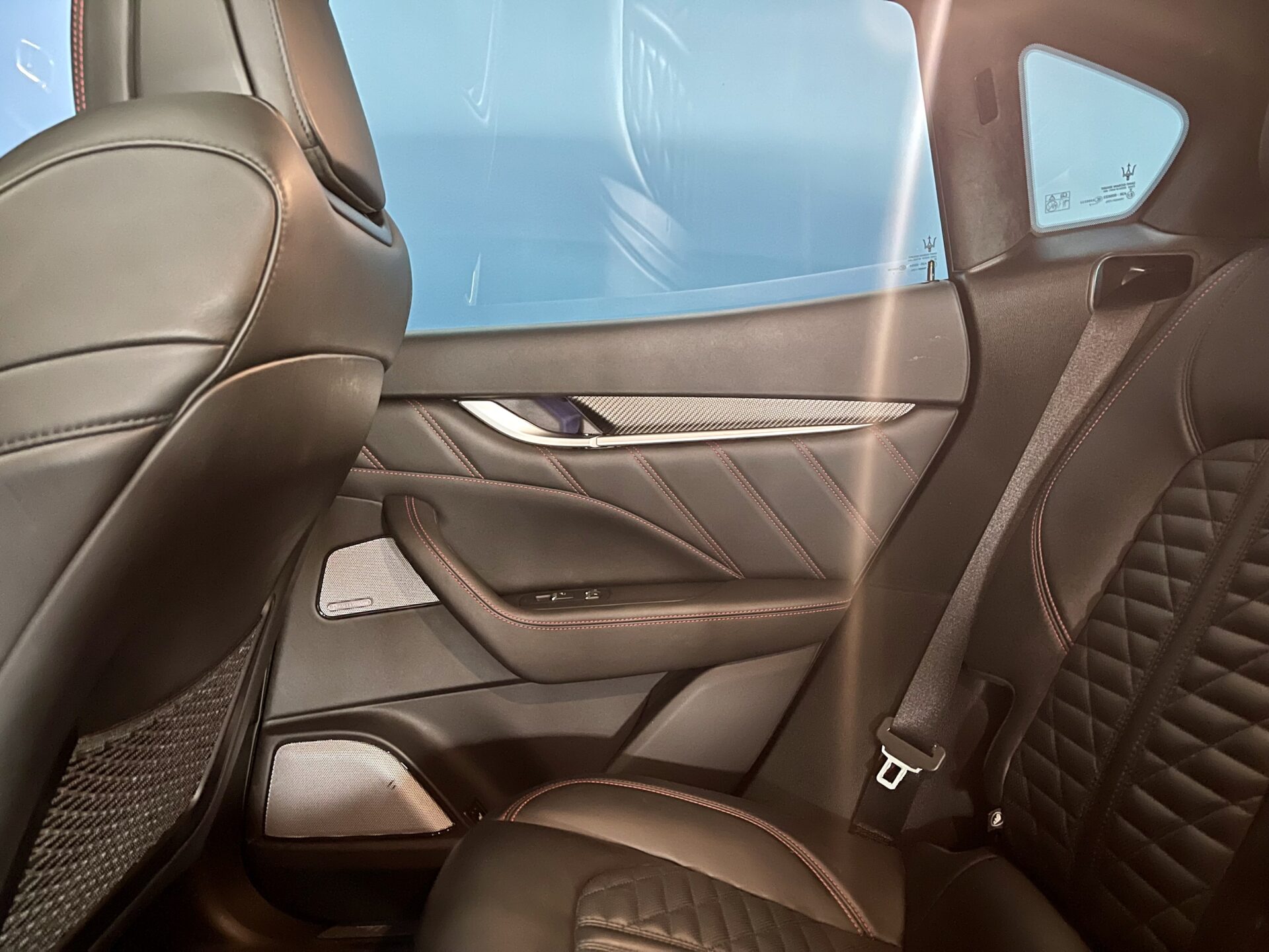 Par rapport au modèle de base, le Levante Trofeo se veut d’emblée plus sportif tout en conservant sa classe naturelle. La carrosserie comporte des jupes latérales et plusieurs éléments avant/arrière en carbone. On a droit également à un capot en aluminium comportant deux prises d’air, ainsi qu’à une calandre et des contours de portières désormais peints en noir. Notre modèle est en outre équipé des jantes 22 pouces au design Orione qui se marient idéalement avec la teinte « Grigio ». Enfin, pour parachever le tout, le célèbre insigne du Trident présent au-dessus des ailes arrière est complété par l’inscription Trofeo.