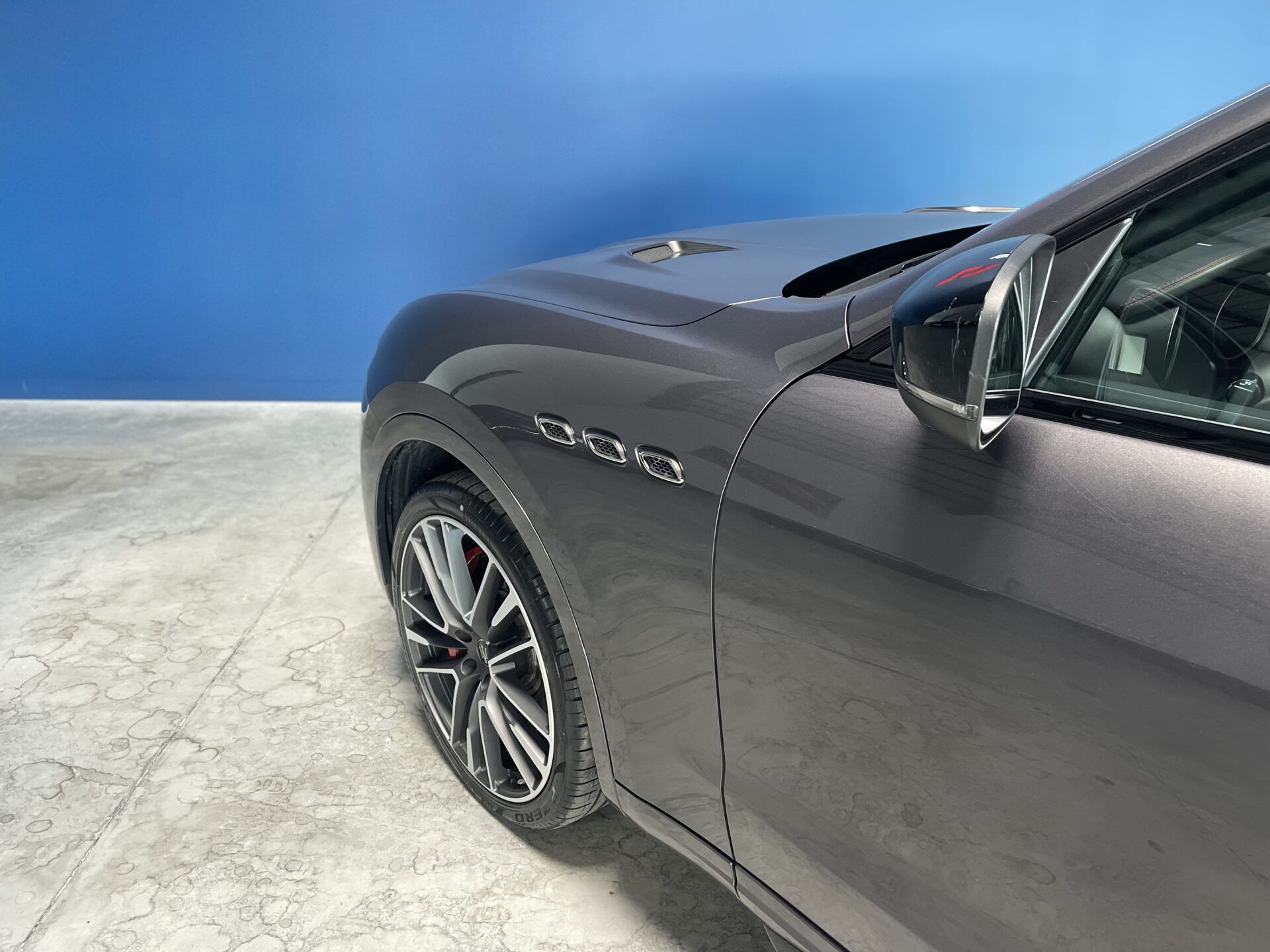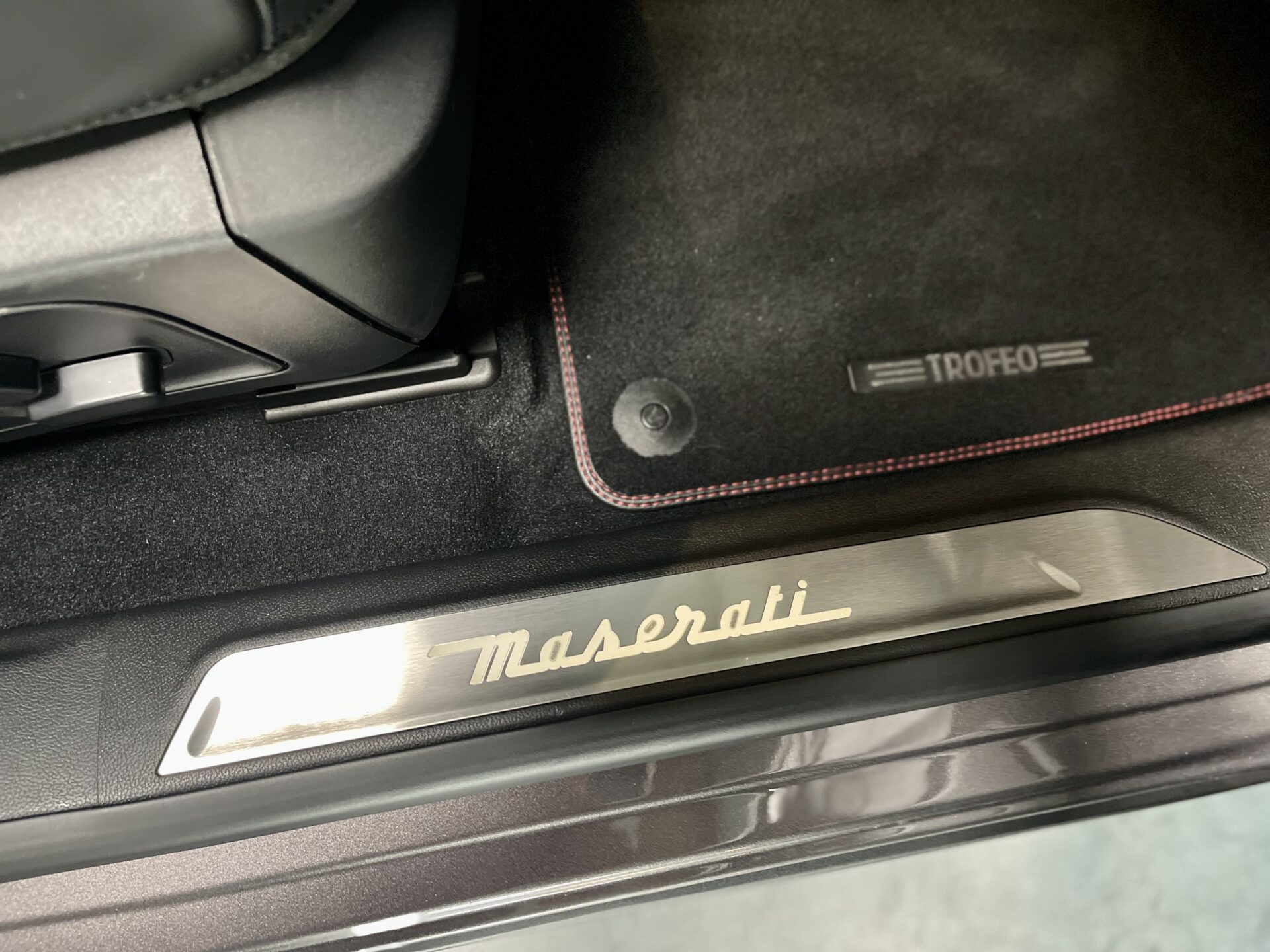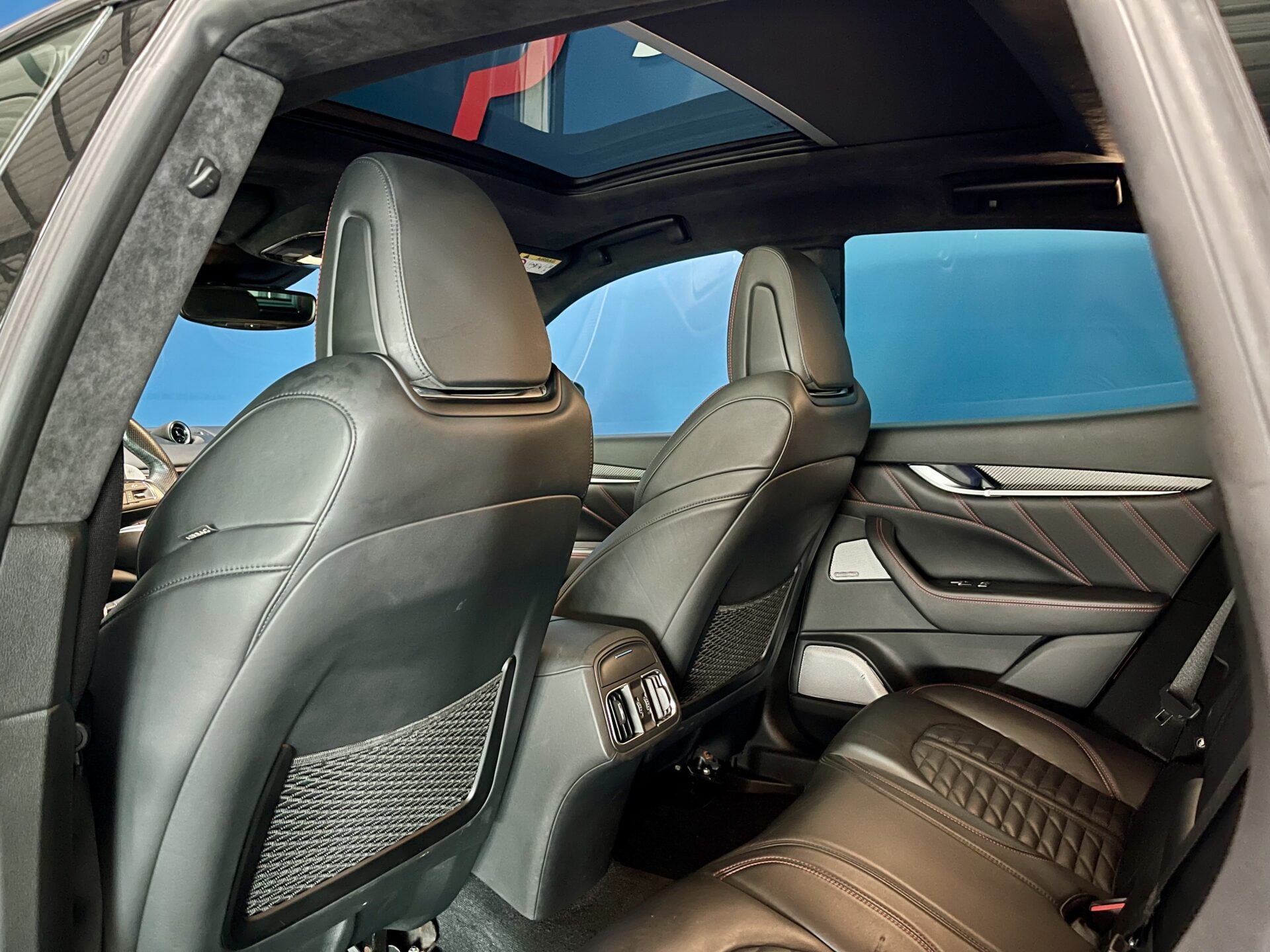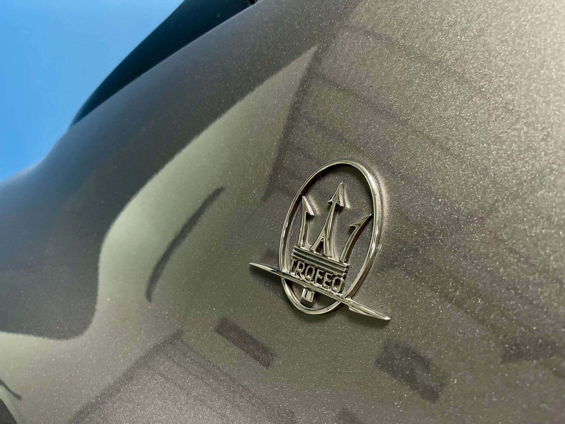 Par rapport au modèle de base, le Levante Trofeo se veut d’emblée plus sportif tout en conservant sa classe naturelle. La carrosserie comporte des jupes latérales et plusieurs éléments avant/arrière en carbone. On a droit également à un capot en aluminium comportant deux prises d’air, ainsi qu’à une calandre et des contours de portières désormais peints en noir. Notre modèle est en outre équipé des jantes 22 pouces au design Orione qui se marient idéalement avec la teinte « Grigio ». Enfin, pour parachever le tout, le célèbre insigne du Trident présent au-dessus des ailes arrière est complété par l’inscription Trofeo.