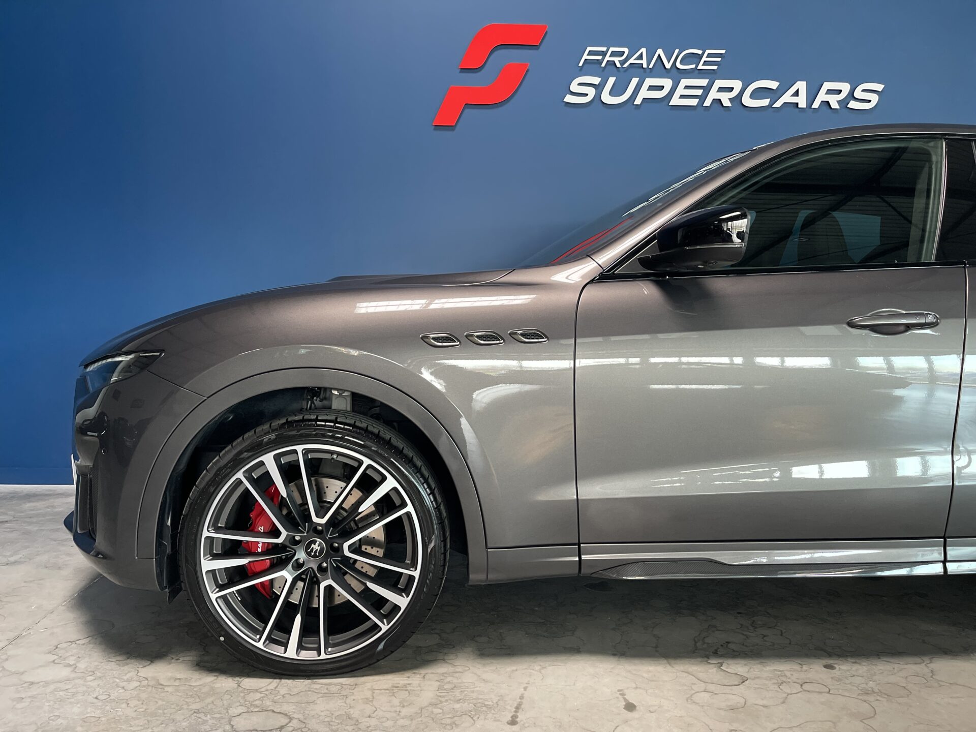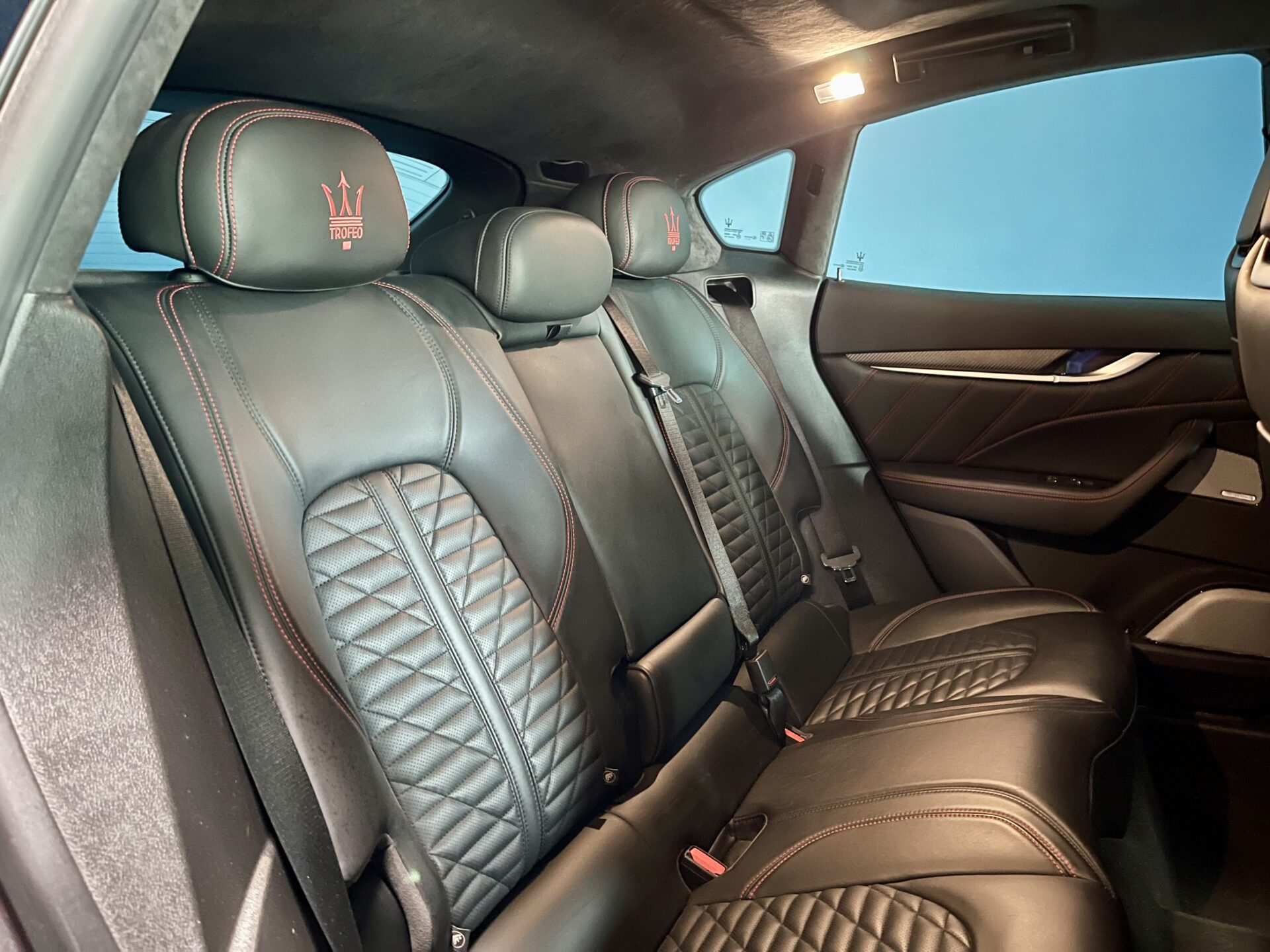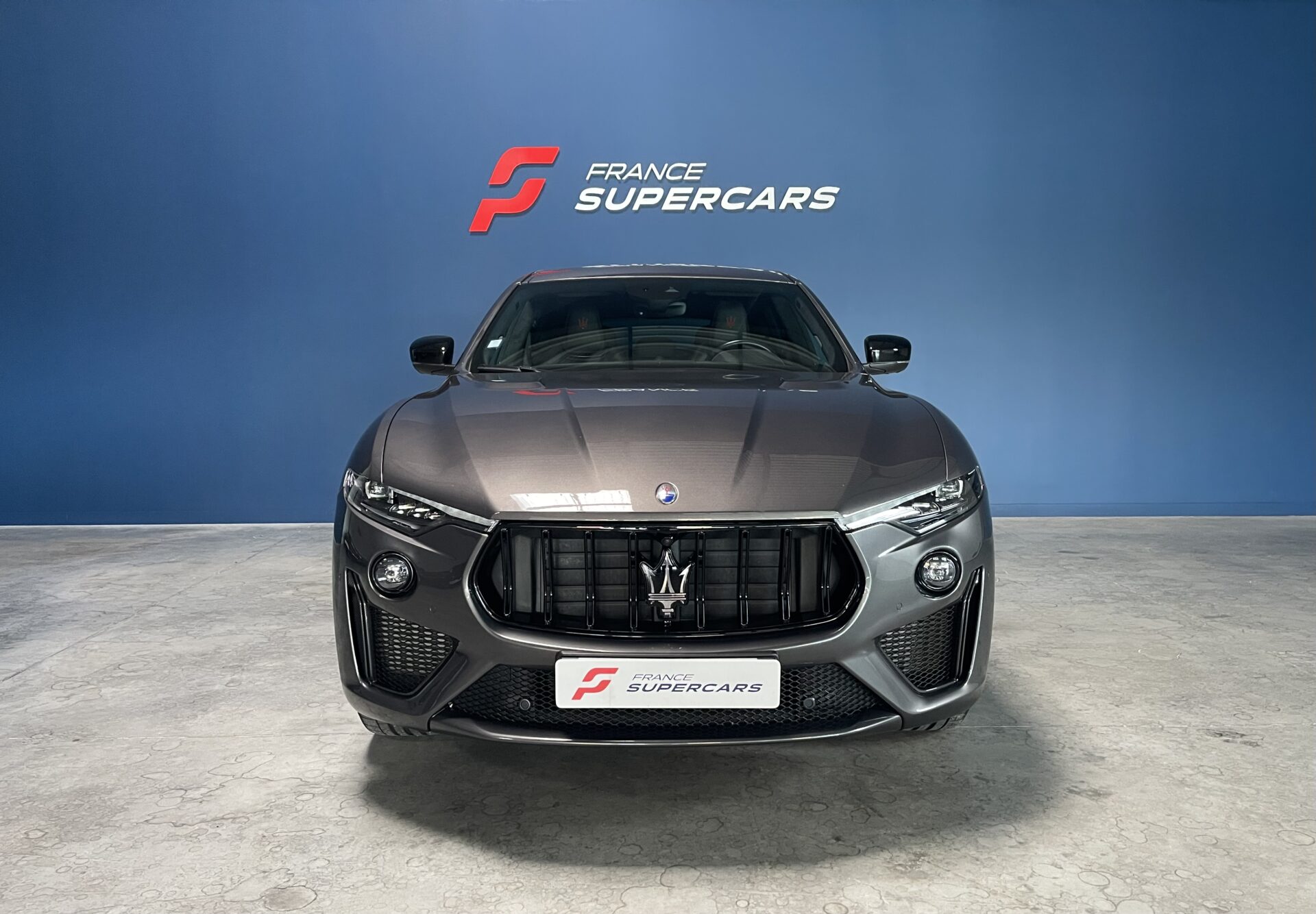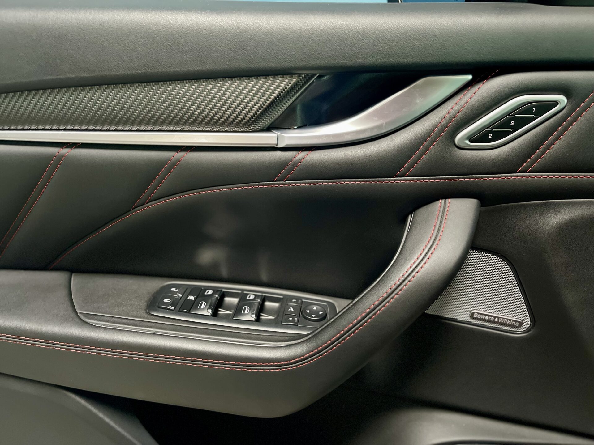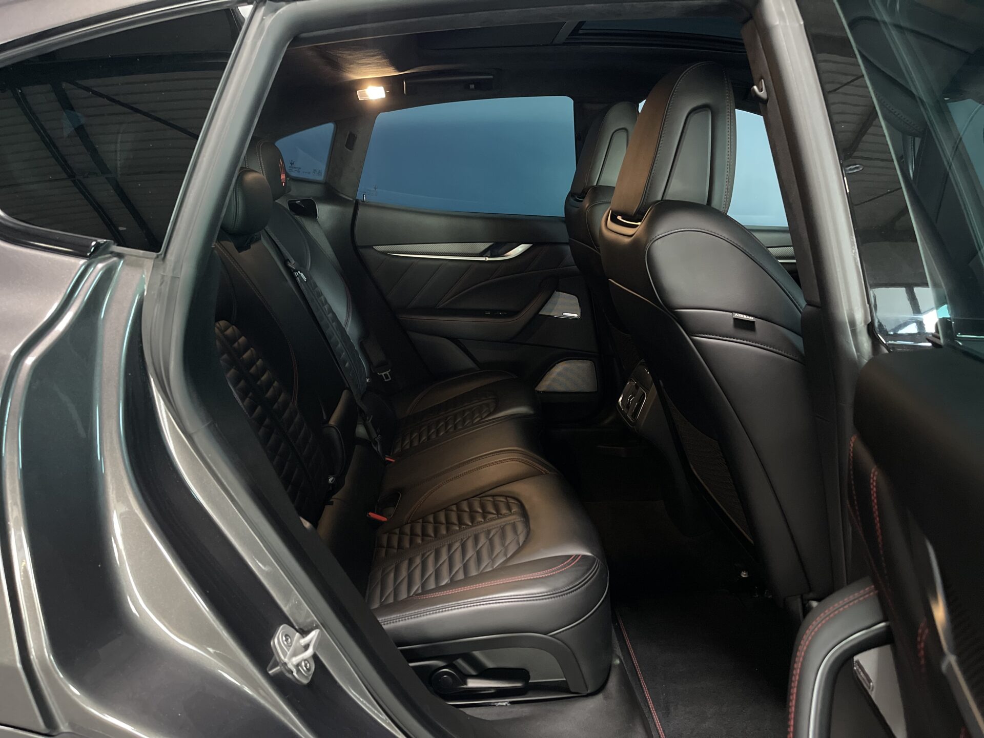 Par rapport au modèle de base, le Levante Trofeo se veut d’emblée plus sportif tout en conservant sa classe naturelle. La carrosserie comporte des jupes latérales et plusieurs éléments avant/arrière en carbone. On a droit également à un capot en aluminium comportant deux prises d’air, ainsi qu’à une calandre et des contours de portières désormais peints en noir. Notre modèle est en outre équipé des jantes 22 pouces au design Orione qui se marient idéalement avec la teinte « Grigio ». Enfin, pour parachever le tout, le célèbre insigne du Trident présent au-dessus des ailes arrière est complété par l’inscription Trofeo.