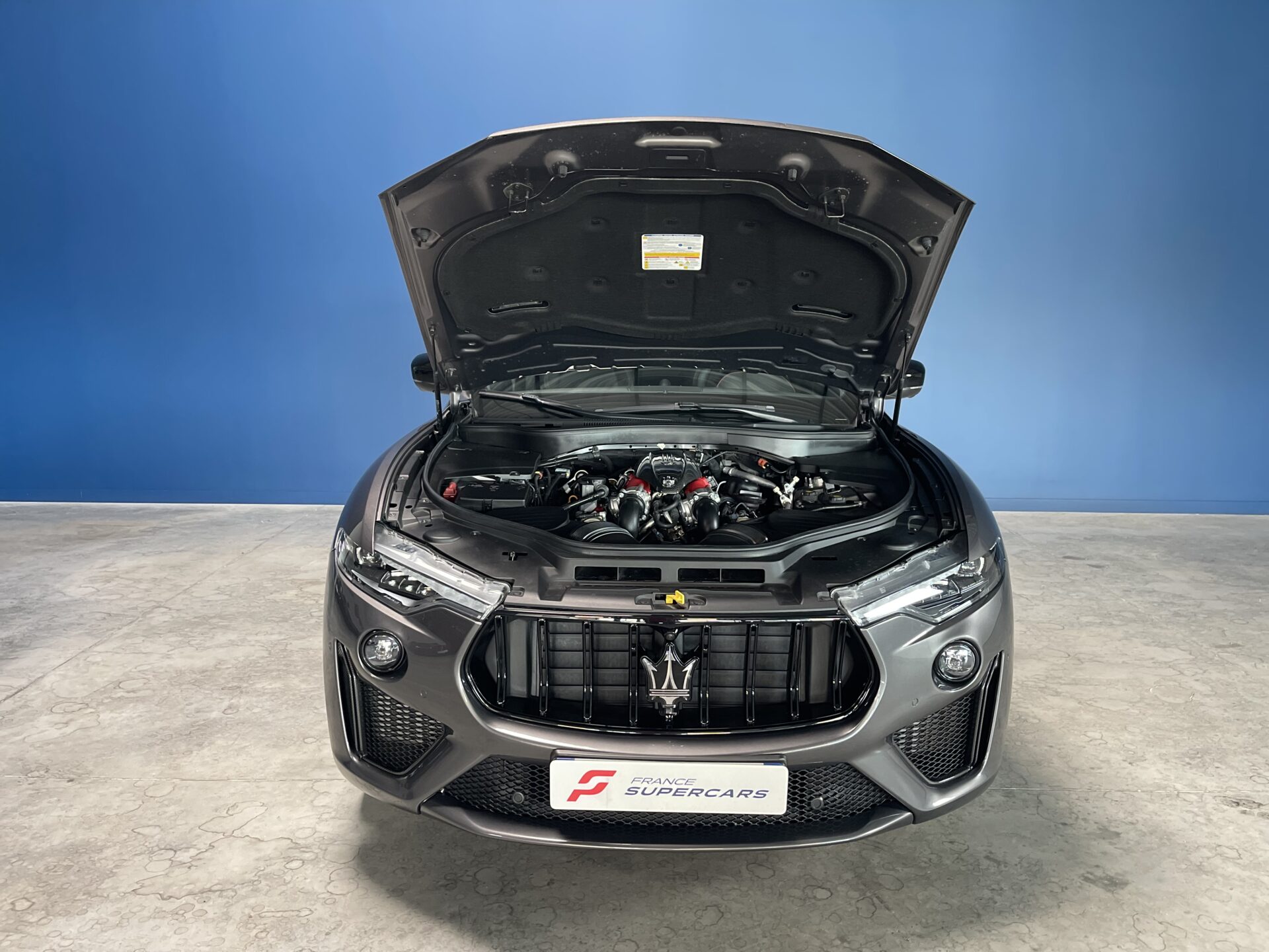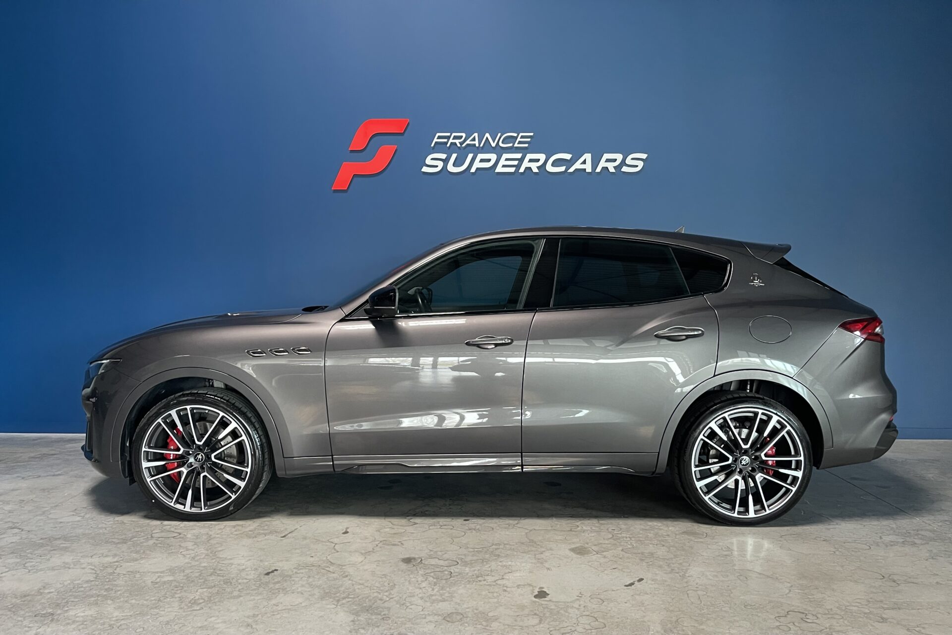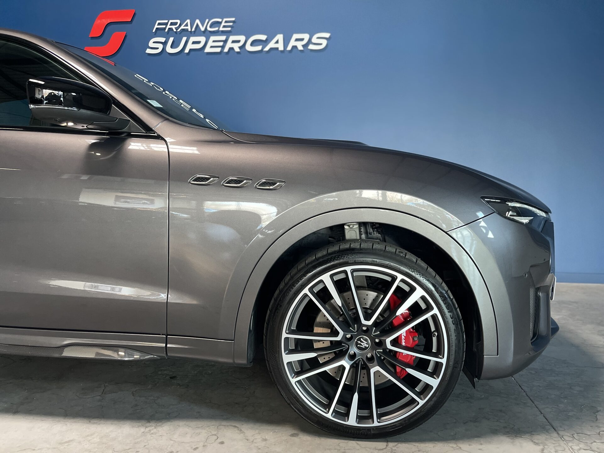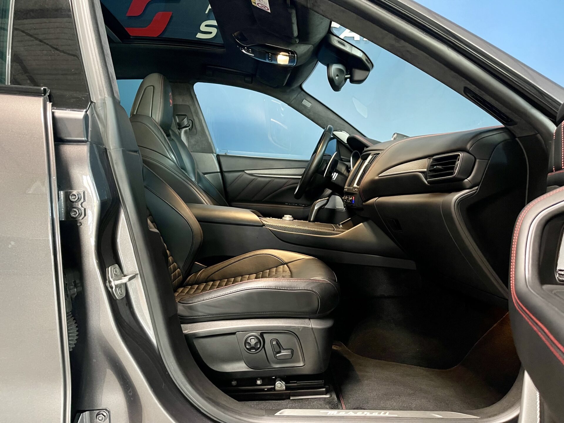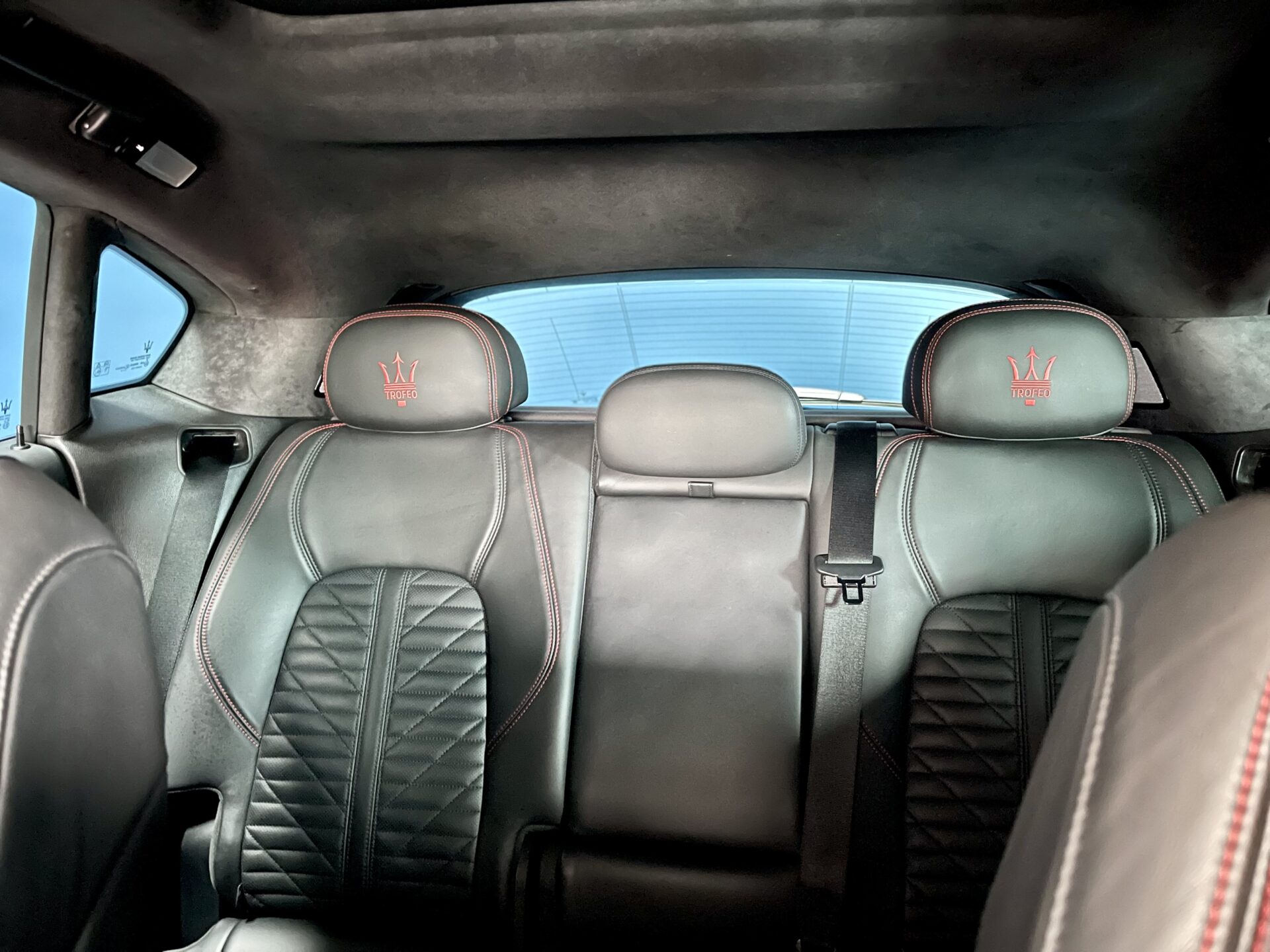 Par rapport au modèle de base, le Levante Trofeo se veut d’emblée plus sportif tout en conservant sa classe naturelle. La carrosserie comporte des jupes latérales et plusieurs éléments avant/arrière en carbone. On a droit également à un capot en aluminium comportant deux prises d’air, ainsi qu’à une calandre et des contours de portières désormais peints en noir. Notre modèle est en outre équipé des jantes 22 pouces au design Orione qui se marient idéalement avec la teinte « Grigio ». Enfin, pour parachever le tout, le célèbre insigne du Trident présent au-dessus des ailes arrière est complété par l’inscription Trofeo.