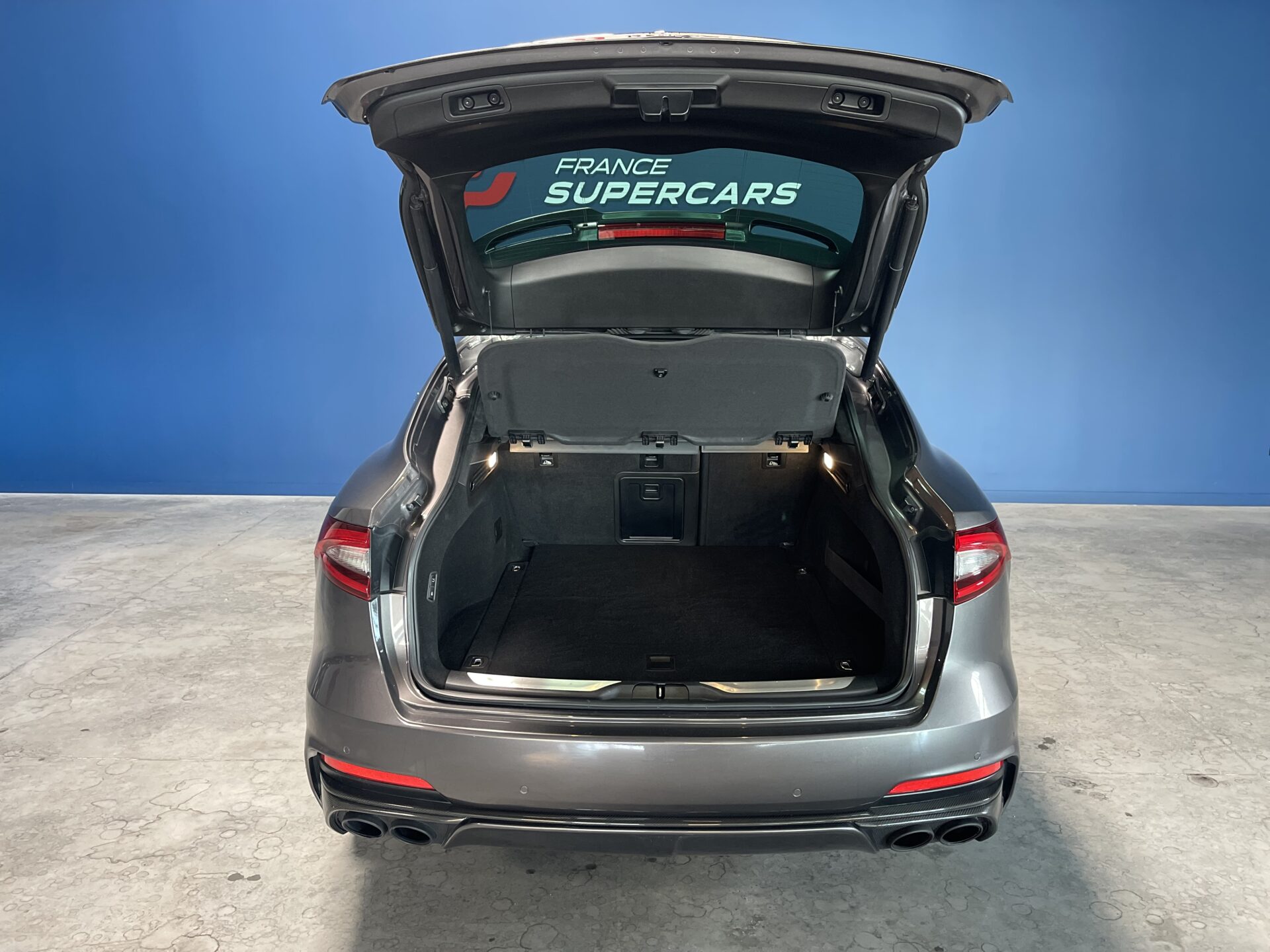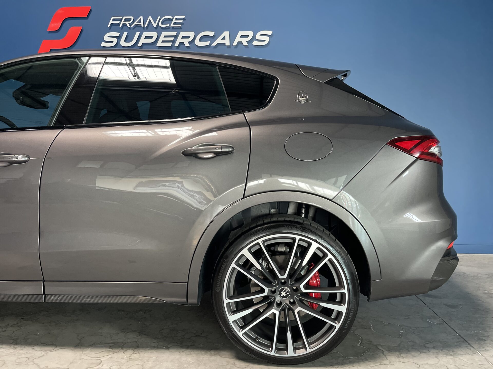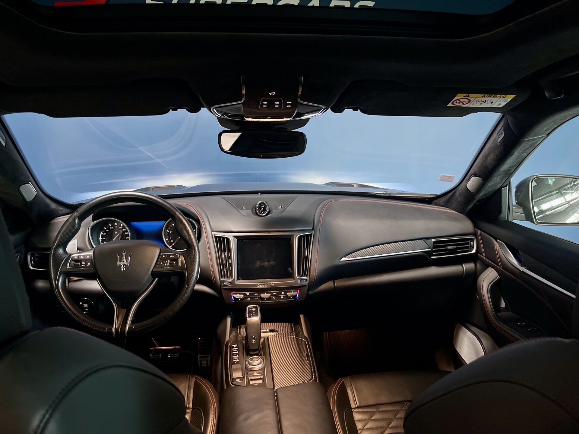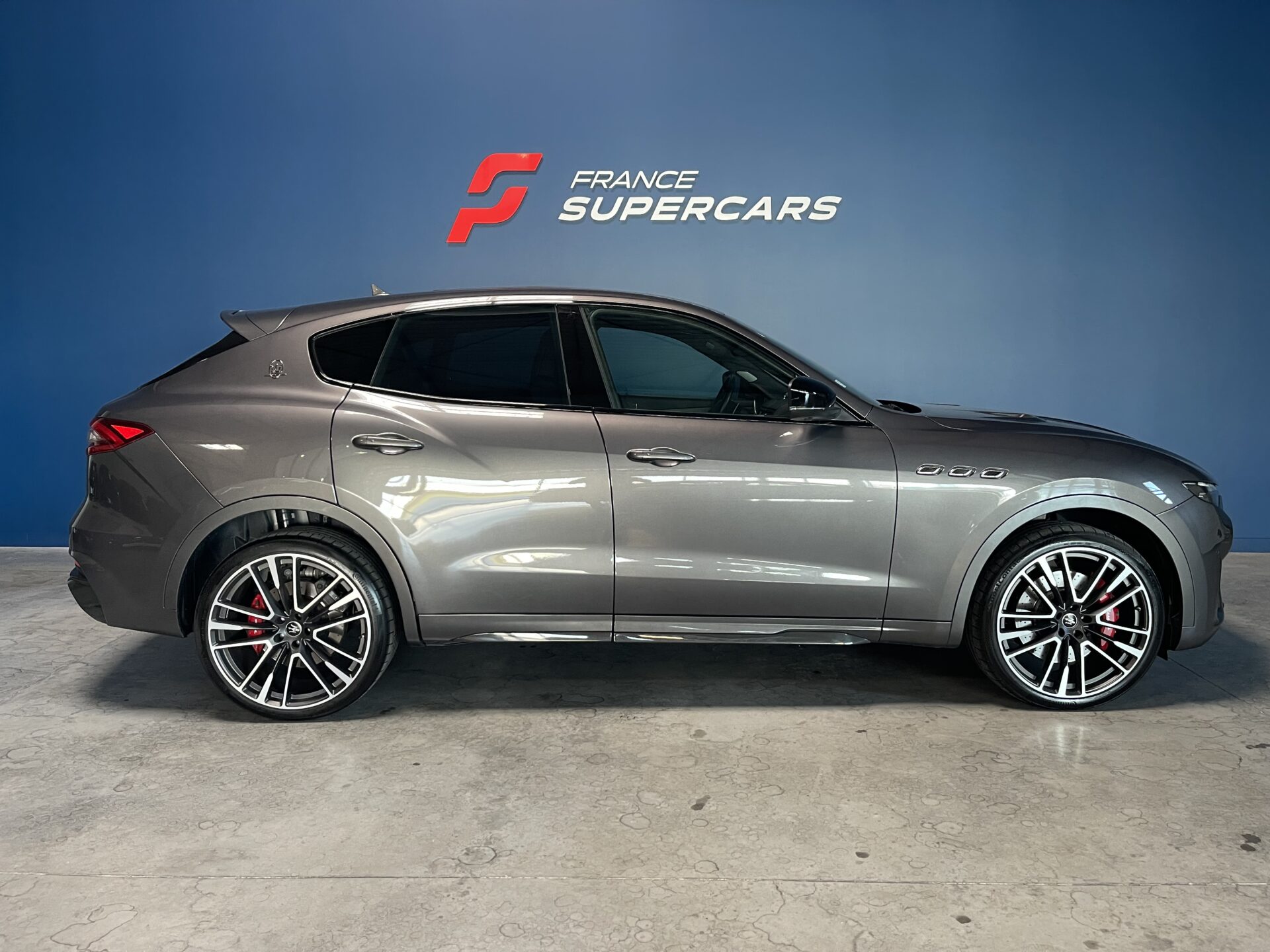 Par rapport au modèle de base, le Levante Trofeo se veut d’emblée plus sportif tout en conservant sa classe naturelle. La carrosserie comporte des jupes latérales et plusieurs éléments avant/arrière en carbone. On a droit également à un capot en aluminium comportant deux prises d’air, ainsi qu’à une calandre et des contours de portières désormais peints en noir. Notre modèle est en outre équipé des jantes 22 pouces au design Orione qui se marient idéalement avec la teinte « Grigio ». Enfin, pour parachever le tout, le célèbre insigne du Trident présent au-dessus des ailes arrière est complété par l’inscription Trofeo.