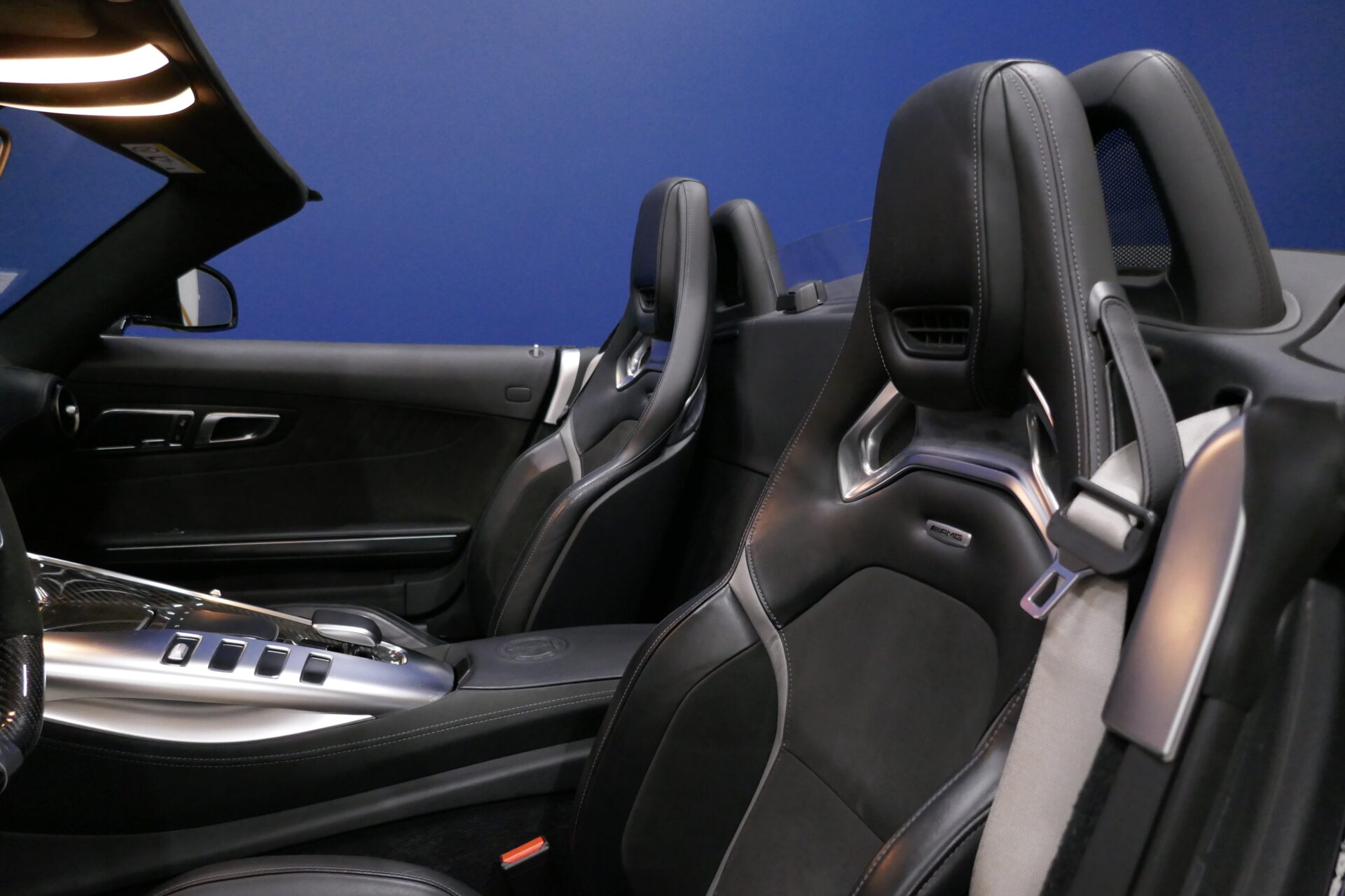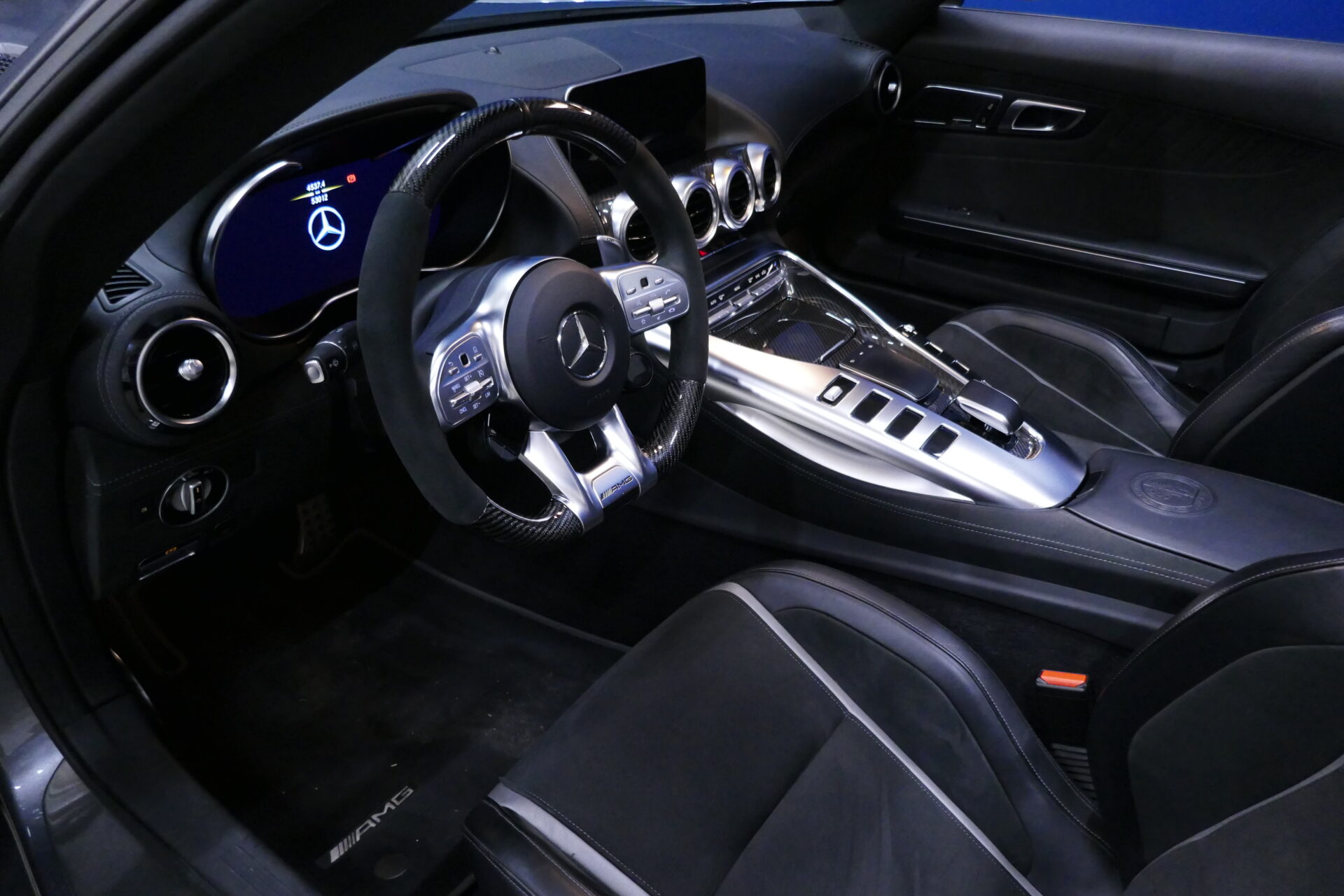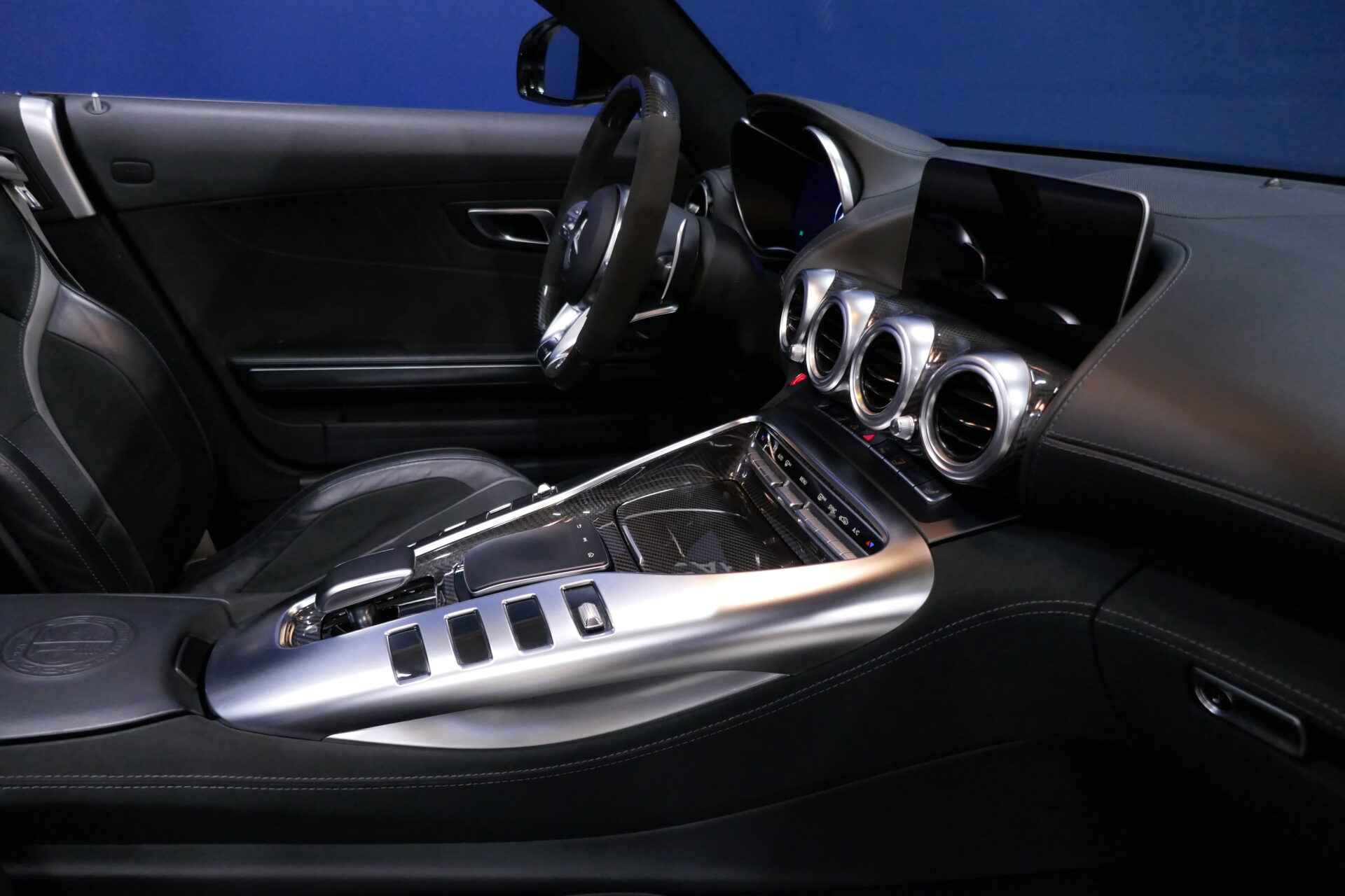 Très reculé, le conducteur est par ailleurs décalé vers la gauche, dans un cockpit étonnamment large. La Mercedes-AMG GT mesure en effet 1,94 mètre de large contre 1,85 mètre pour la Porsche 911 Carrera S et 1,88 mètre pour la Chevrolet Corvette Stingray, plus raisonnable à cet égard que ses devancières. C'est que la Mercedes-AMG hérite de sa devancière l'implantation centrale avant de son moteur, avec la boîte de vitesses rejetée contre le différentiel, sur le train arrière. Bien qu'il soit officiellement plus court de quelque 9 cm que le V8 atmosphérique qu'il remplace, le nouveau moteur double turbo empiète largement sur l'habitacle. D'où l'énorme console centrale.