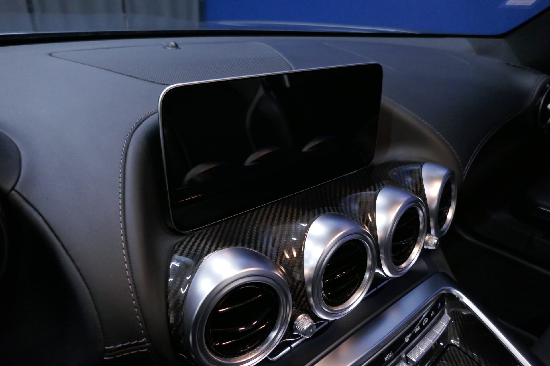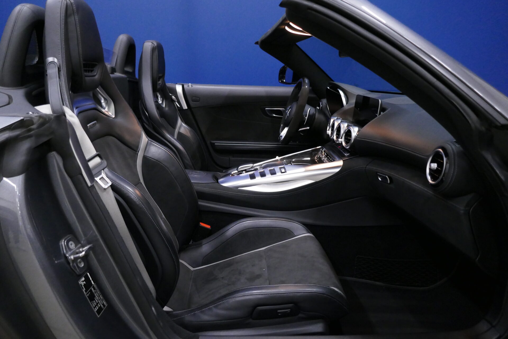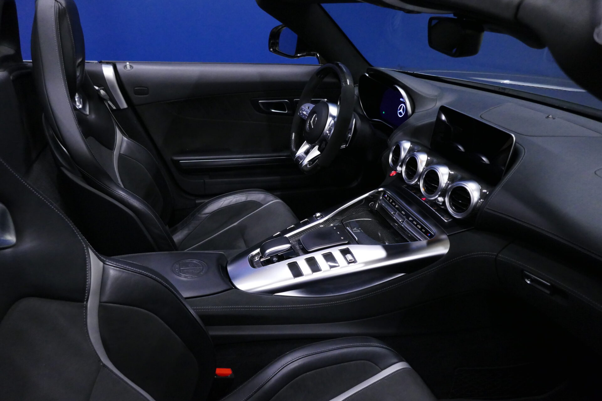 Très reculé, le conducteur est par ailleurs décalé vers la gauche, dans un cockpit étonnamment large. La Mercedes-AMG GT mesure en effet 1,94 mètre de large contre 1,85 mètre pour la Porsche 911 Carrera S et 1,88 mètre pour la Chevrolet Corvette Stingray, plus raisonnable à cet égard que ses devancières. C'est que la Mercedes-AMG hérite de sa devancière l'implantation centrale avant de son moteur, avec la boîte de vitesses rejetée contre le différentiel, sur le train arrière. Bien qu'il soit officiellement plus court de quelque 9 cm que le V8 atmosphérique qu'il remplace, le nouveau moteur double turbo empiète largement sur l'habitacle. D'où l'énorme console centrale.