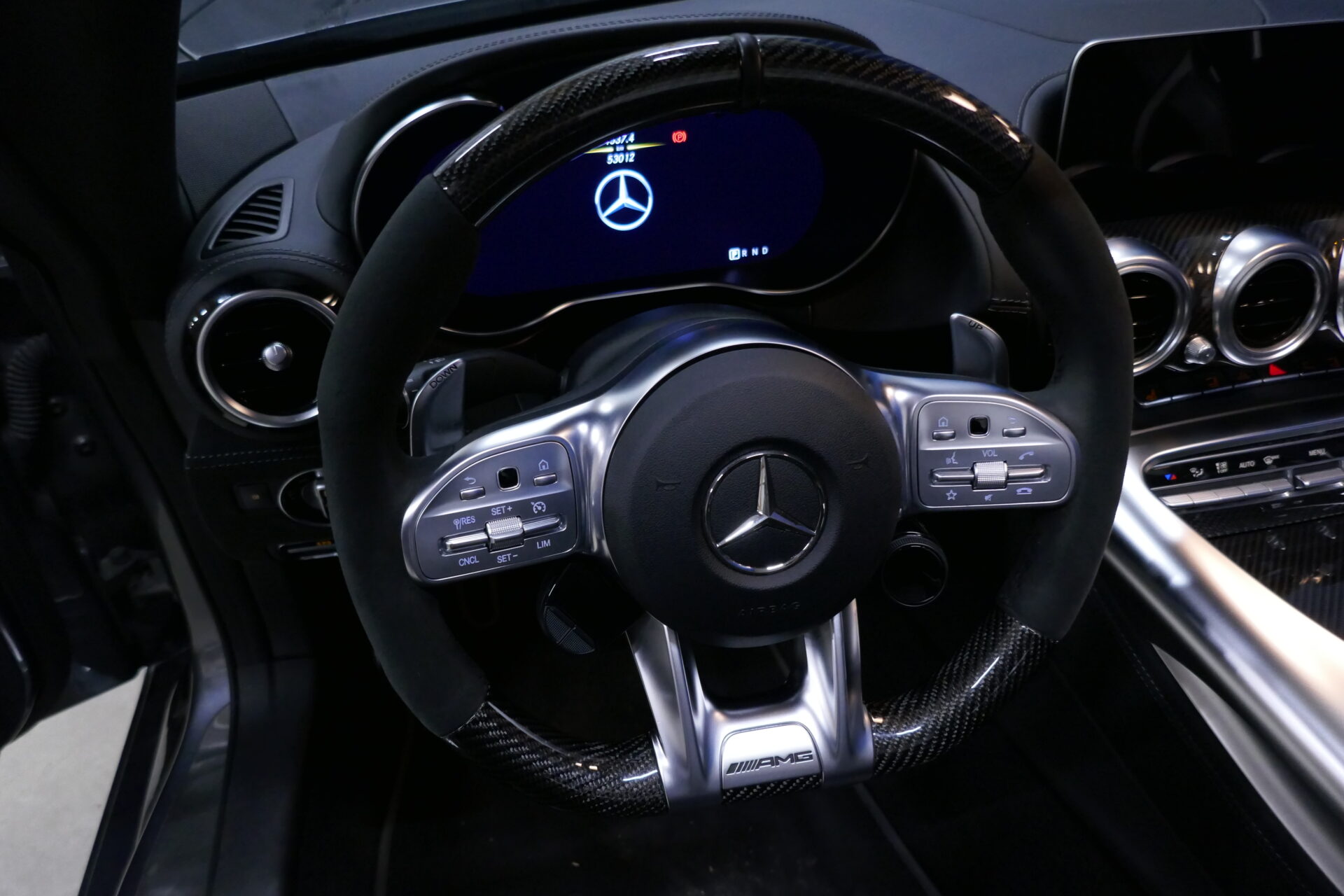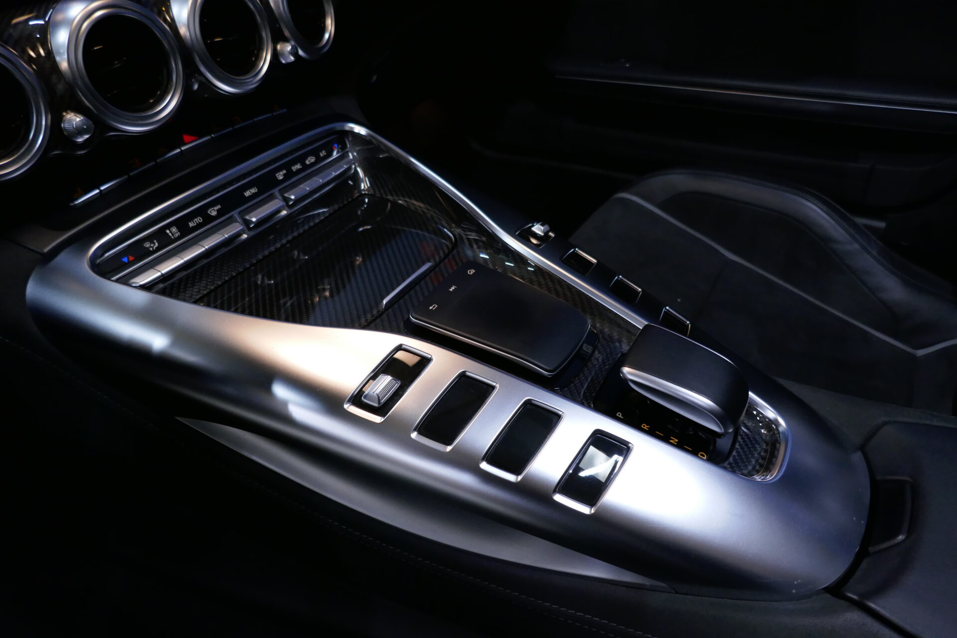 De part et d'autre ce de levier, on trouve huit boutons poussoirs (autant que de cylindres dans le moteur, dixit Mercedes) qui commandent le volume de la radio, la loi d'amortissement ou bien encore le passage de la boîte en mode manuel. Mercedes-AMG ne voulait pas tomber dans le travers des boutons à la Porsche, illisibles car trop rapprochés.