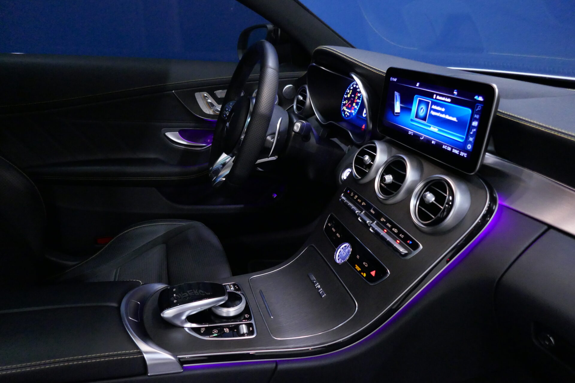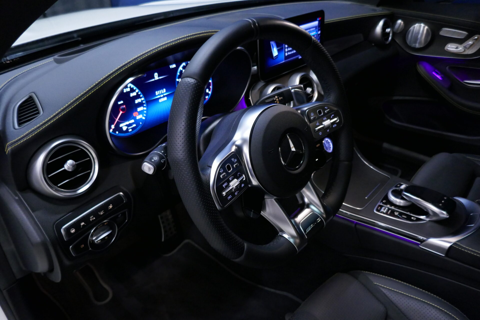 À l'intérieur, la C 63 est équipée de sièges sport qui présentent des renforts latéraux plus élevés. Les garnitures en fibre de carbone et les écussons AMG de la console centrale et du volant confèrent à la voiture une allure sportive.
