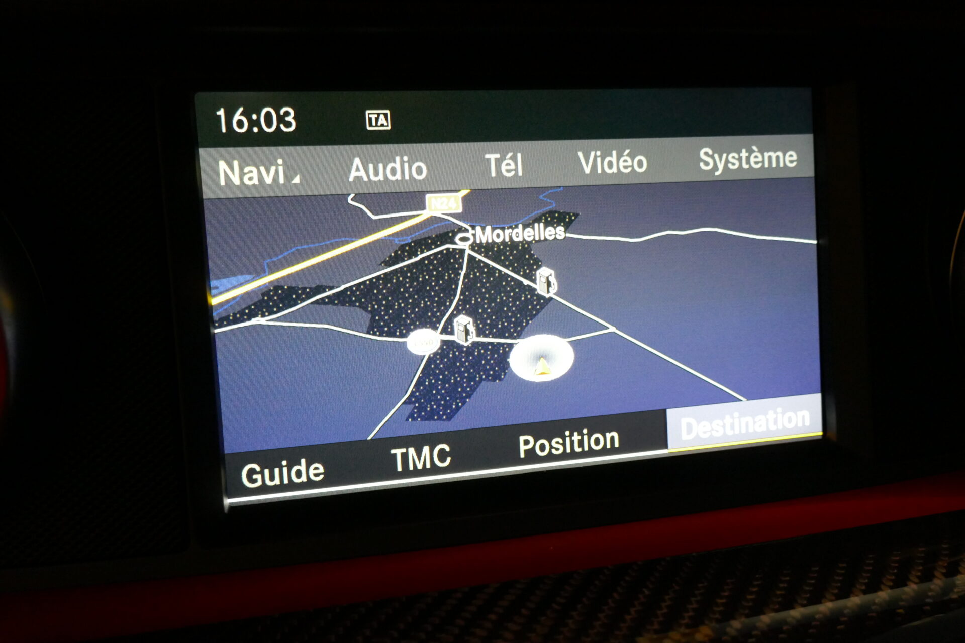 L’équipement technologique embarqué de série est assez impressionnant: GPS Comand couleur 7", Bluetooth, commande vocale Linguatronic, démarrage sans clé (Keyless Go), télécommande de portes de garage, pré-équipement téléphone, sièges sport électriques à mémoire… et on en passe ! A noter que les garnitures en cuir sont en cuir Nappa étendu designo uni ou bicolore de série, une « fleur de série » assez rare de la part du constructeur à l’étoile ! Il existe encore quelques options à des tarifs surréalistes comme le pack carbone intérieur, le volant cuir/Alcantara, la sono Bang & Olufsen, housse de protection AMG.