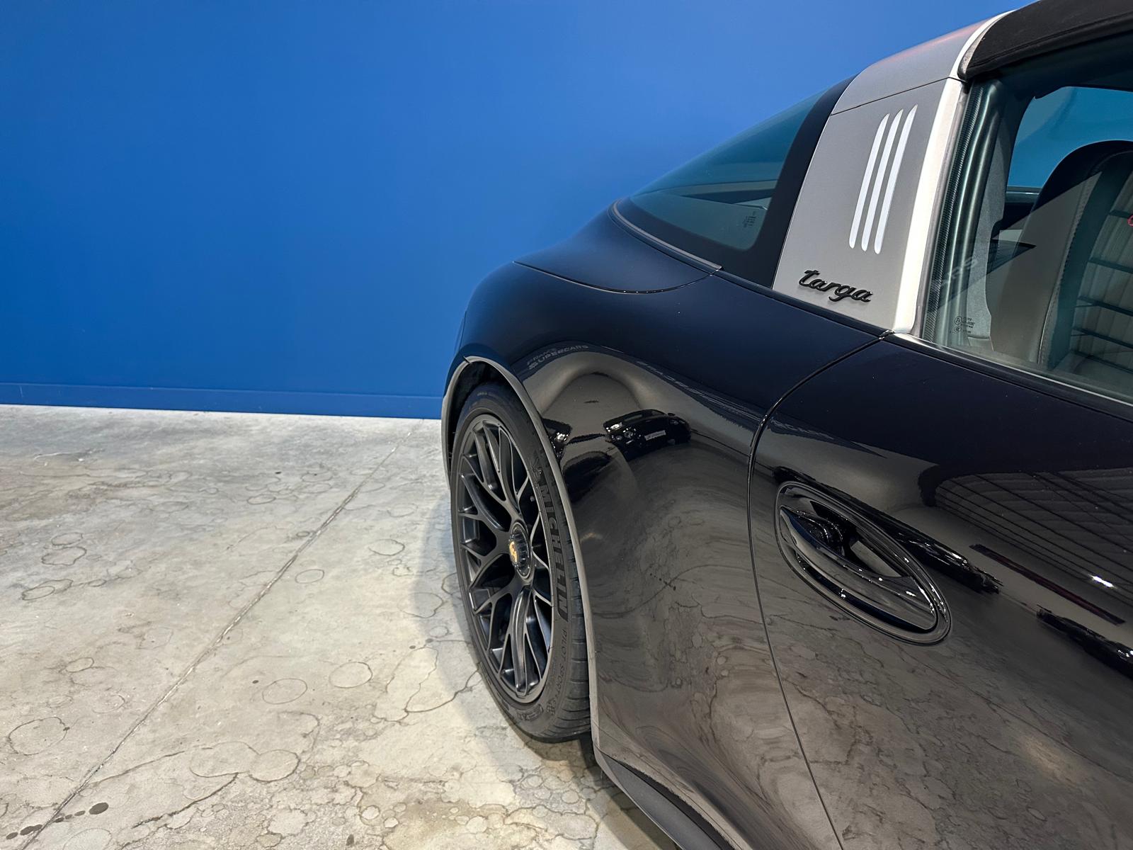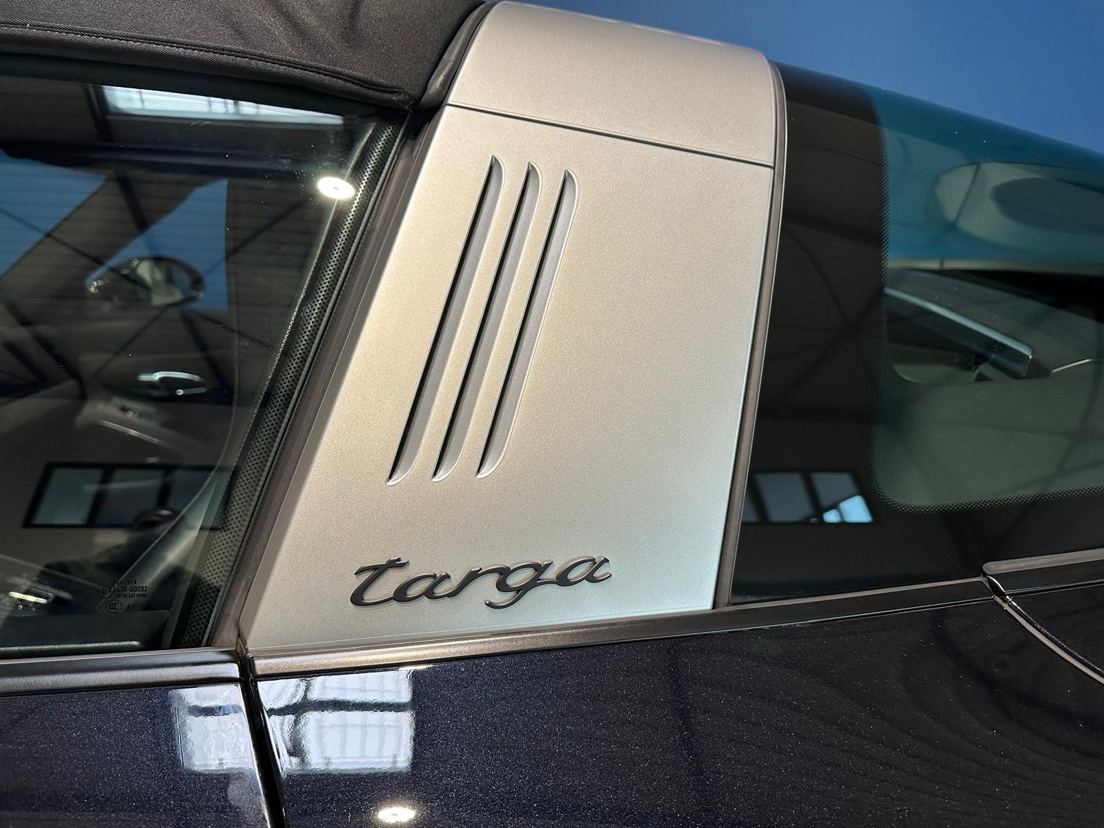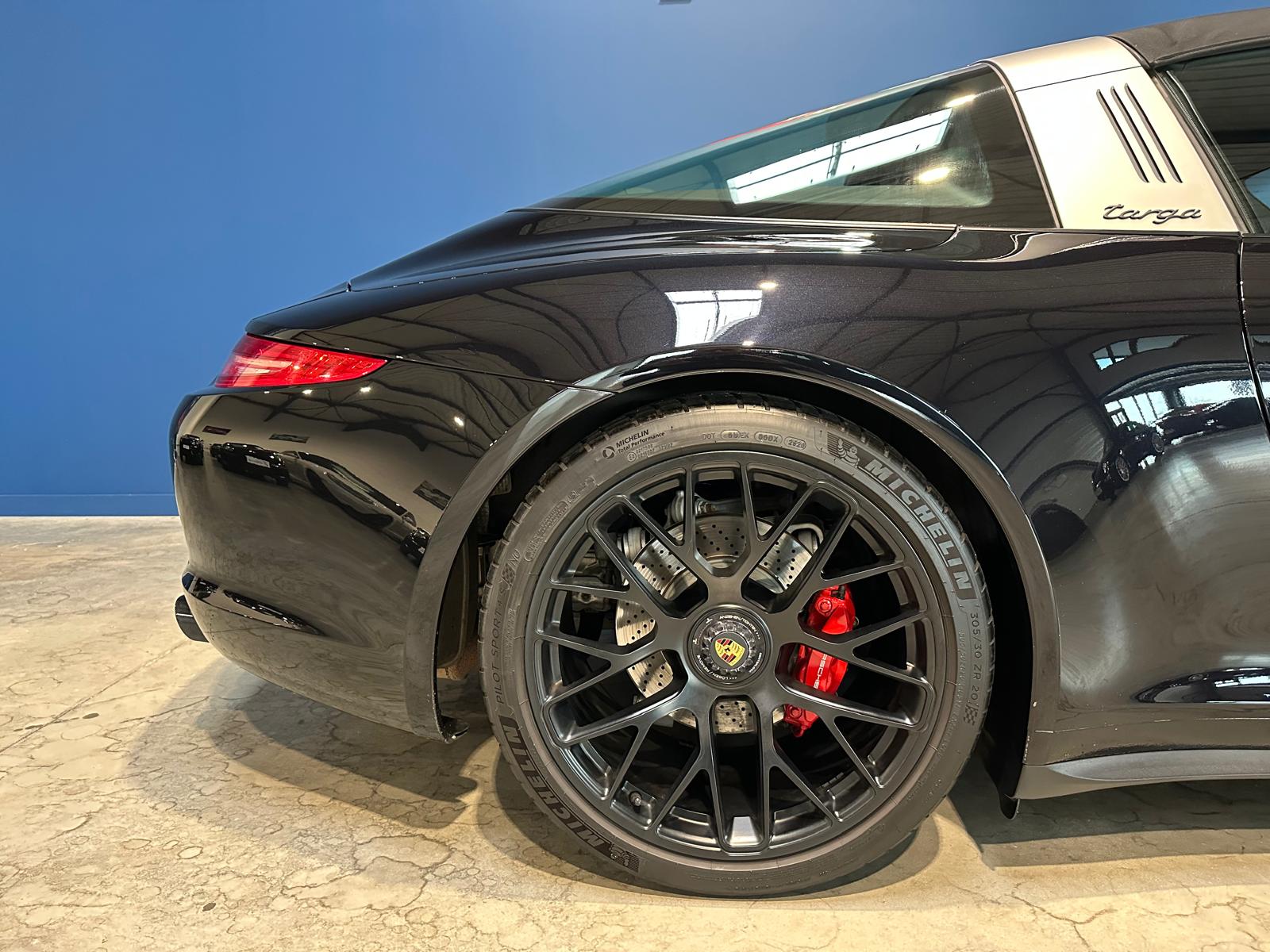 Mais la 911 Carrera GTS, ce n'est pas qu'une histoire de moteur. La carrosserie bénéficie ainsi d'éléments spécifiques, comme un bouclier avant entièrement redessiné afin d'optimiser l'écoulement aérodynamique, avec une lame peinte dans la teinte de la carrosserie. Les optiques sont à fond noir et disposent d'un faisceau orientable dans les virages. Les jantes noires de 20 pouces à écrou central font partie de la dotation standard, tous comme les petits logos « GTS » sur les portières, les monogrammes noirs à l'arrière ou les deux doubles sorties d'échappement sombres. Enfin, toutes les GTS, y compris les versions à deux roues motrices, disposent des ailes élargies des modèles dotés de la transmission intégrale. Si l'extérieur mêle habilement sportivité et élégance, l'habitacle est plutôt radical, la Targa 4 GTS se révèle accueillante, avec de nombreux éléments en Alcantara (sièges, volant, levier de vitesses) et une finition soignée.