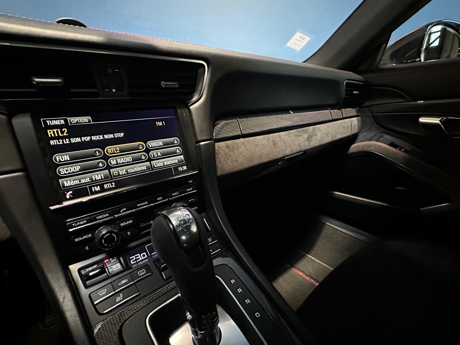 Trouver sa Porsche 911 devient aussi compliqué que de choisir son menu dans un restaurant de sushis : entre les coupés, les cabriolets, les versions à deux ou quatre roues motrices, avec ou sans S, avec ou sans Turbo, et j'en passe et des meilleures, l'offre est devenue pléthorique. Sans même entrer dans le débat entre boîte manuelle et PDK, on dénombre déjà 21 versions... dont cinq rien que pour la GTS, qui se décline dans les trois carrosseries et en deux et quatre roues motrices. Cette 911 Targa 4 GTS vient combler le vide laissé dans la gamme entre la Carrera S (400 ch) et la GT3 (475 ch). Elle est censée épicer quelque peu la conduite par rapport à la première, très polyvalente, sans pour autant tomber dans les excès de la seconde, qui pousse la radicalité jusqu'à faire l'impasse sur les places arrière sur certaines versions. Concrètement, cela se traduit par l'adoption d'une version retravaillée du flat-6 3.8 des Carrera S. Son admission a été complètement revue, avec l'adoption d'un système à résonance variable avec six volets (un par cylindre) dont l'ouverture est pilotée simultanément en fonction du régime moteur et de l'enfoncement de la pédale d'accélérateur. Ce système permet un meilleur remplissage des chambres de combustion. En outre, les tubulures d'admission ont été redessinées et polies afin de lever les freins à la circulation du flux d'air. Enfin, les arbres à cames ont un profil plus agressif, tandis que soupapes et ressorts de rappel sont nouveaux. Au final, la puissance passe de 400 à 430 ch, tandis que le couple stagne à 440 Nm. L'impact sur les performances est minimal, puisque la Targa 4 GTS ne gagne qu'un dixième de seconde sur le 0 à 100 km/h par rapport à la Carrera S (4 s contre 4,1), tandis que la vitesse maxi est inchangée, à 302 km/h. Cependant, ces performances restent très respectables dans l'absolu, puisque grâce à un poids contenu et à son architecture « tout à l'arrière », la 911 se permet de faire aussi bien que des rivales plus puissantes, comme la Mercedes-AMG GT (462 ch) ou la Jaguar F-Type Coupé V8 R AWD (550 ch!). Et puis ce flat-6 gagne en caractère, notamment grâce à l'adoption en série de l'échappement sport. Sans égaler le timbre furieux du moteur de la GT3, le bloc de la GTS émet ce grondement métallique caractéristique des 911, avec un final rageur à l'approche de la zone rouge, fixée à 7 800 tr/min. En mode « attaque », on se croirait par instants aux commandes d'une RSR ! Le 3.8 est un peu moins démonstratif à bas régimes, mais la boîte PDK à double embrayage s'attache à l'exploiter au mieux, en minimisant les pertes et en jonglant aussi rapidement que possible entre ses sept rapports. Dans les modes « Sport » et « Sport plus », elle donne même un petit coup de pied aux fesses à chaque changement de rapport, sous la forme d'un léger boost de couple. Assez grisant !