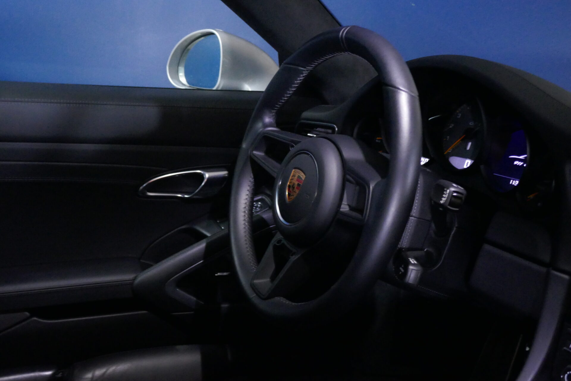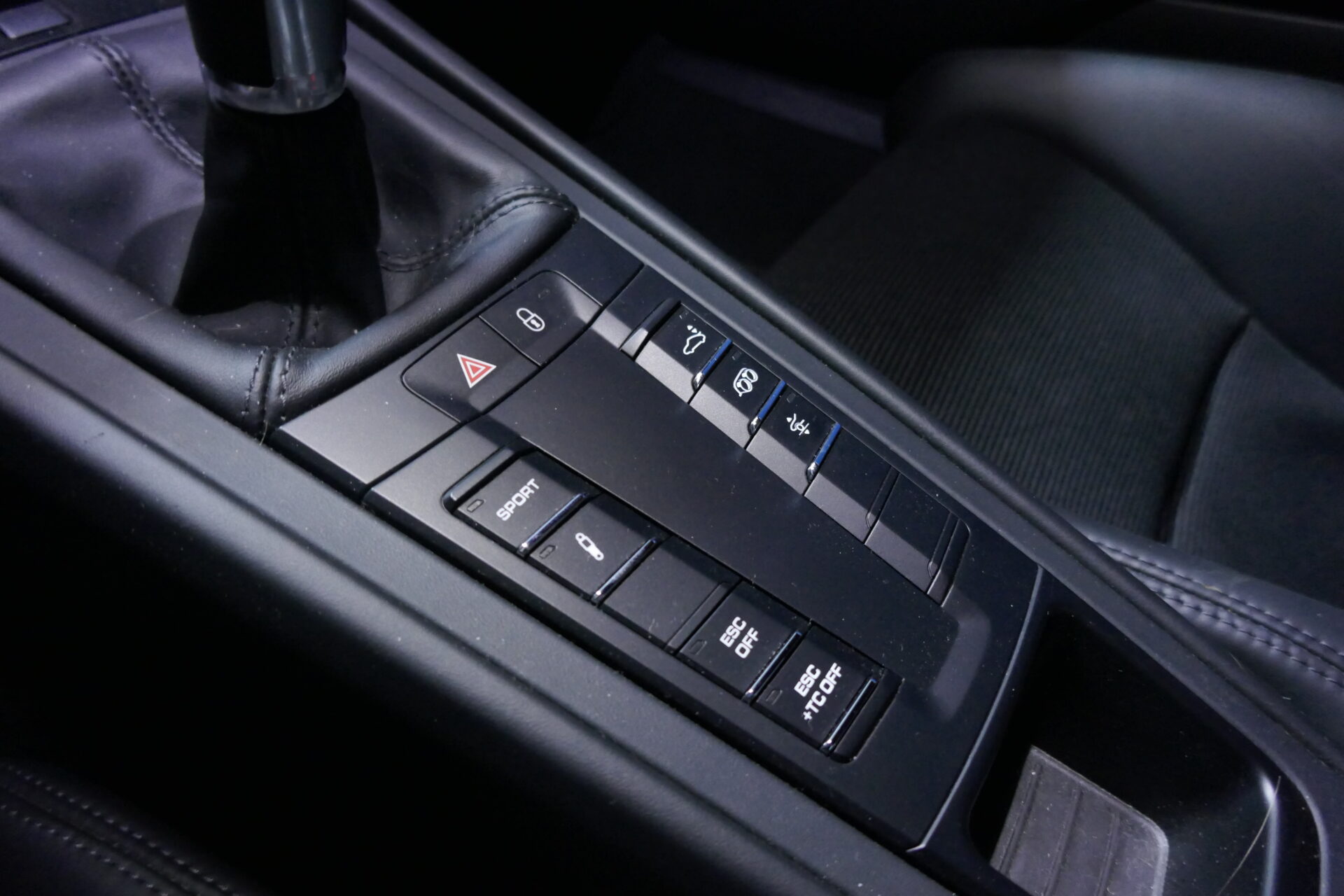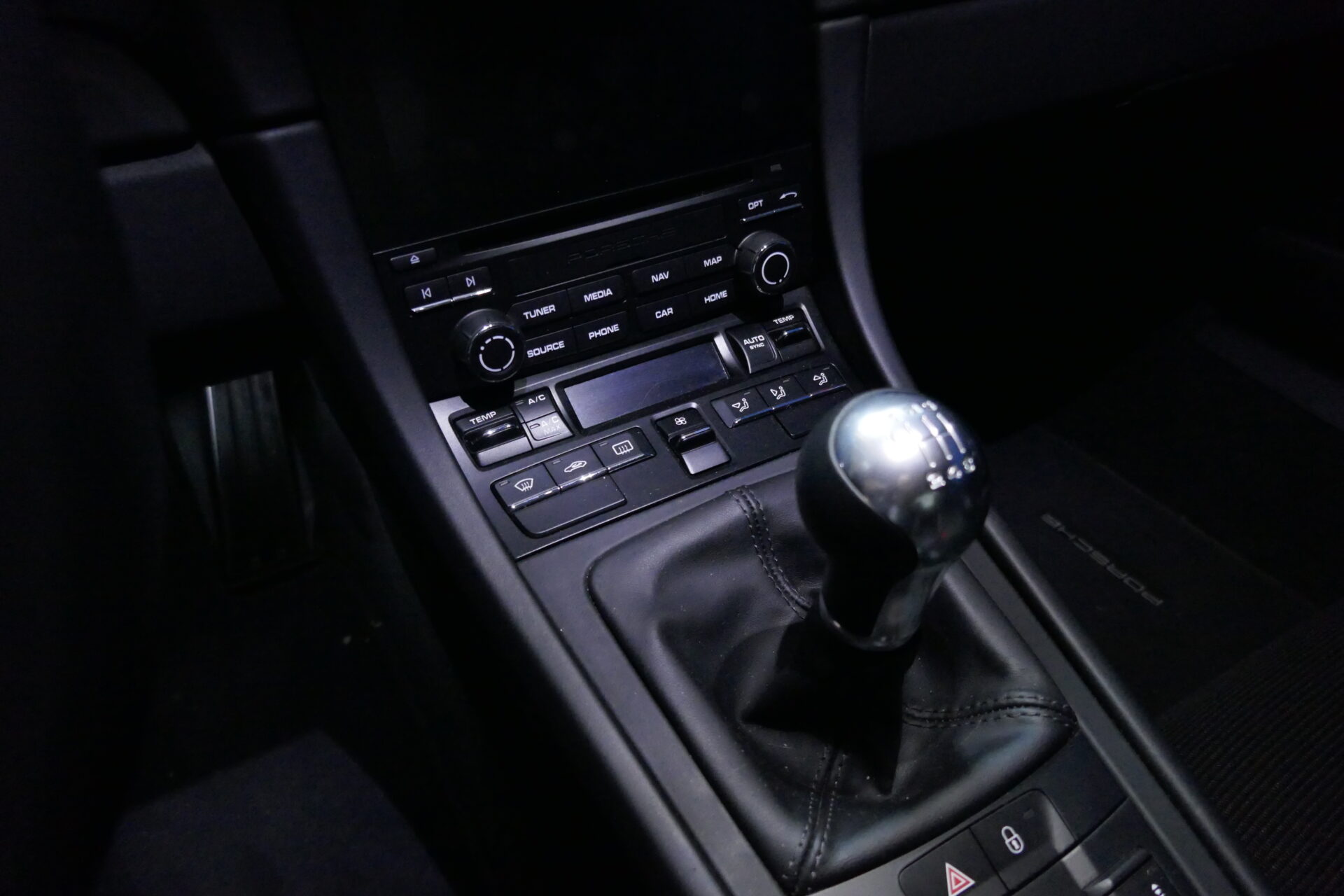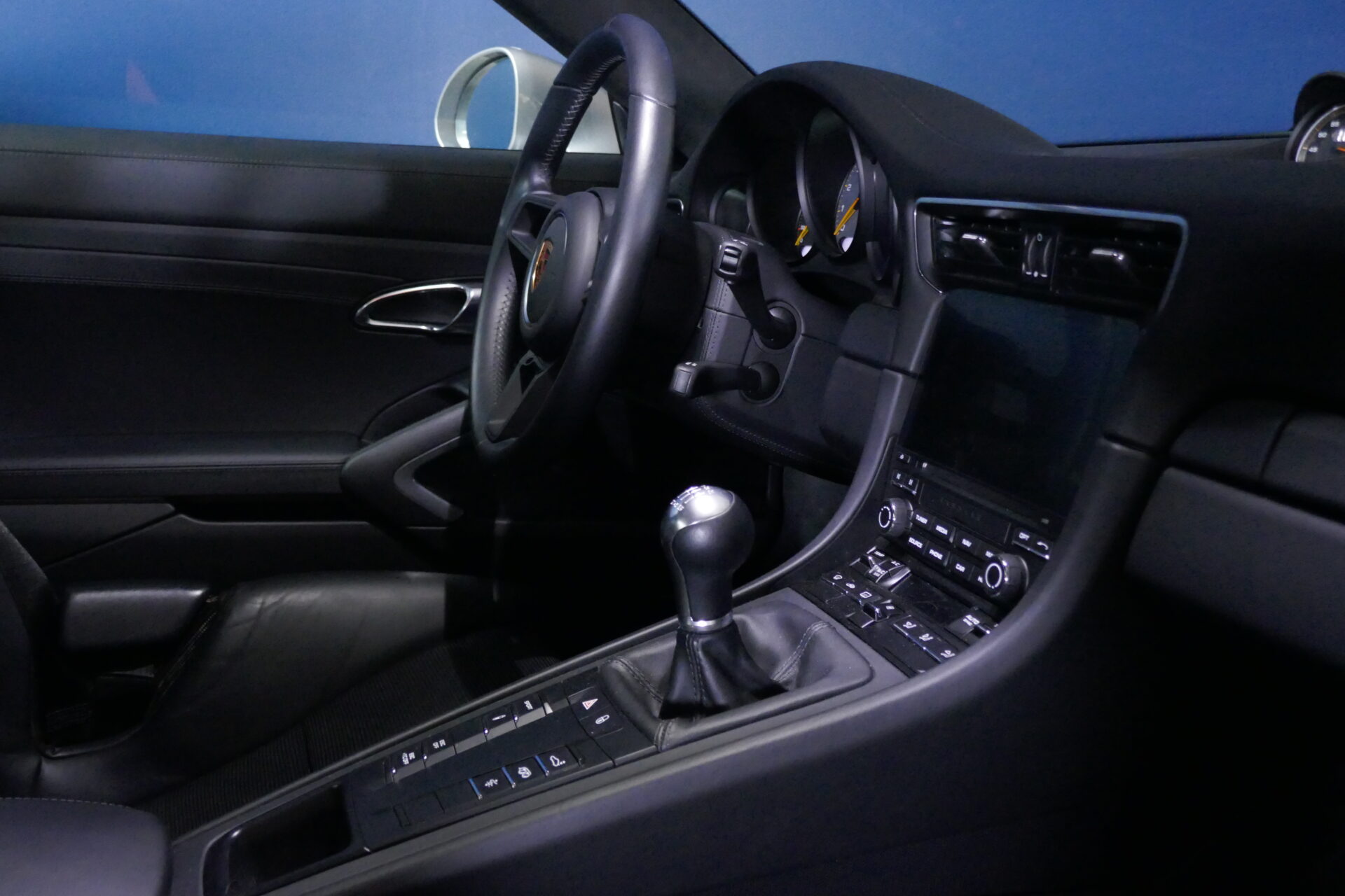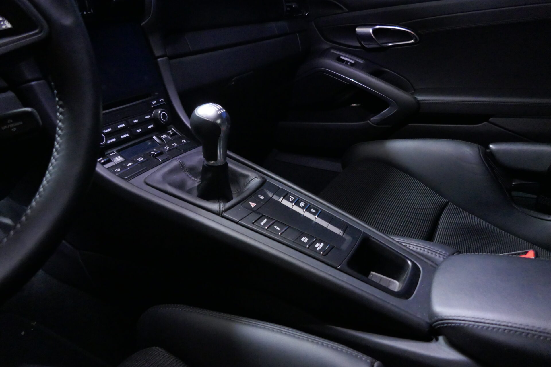 Puis il convient de jeter un œil à l’habitacle où du cuir lisse gaine les sièges de cette exécution routière, en lieu et place de l’Alcantara de mise sur la version de piste. Mais le détail le plus important n’est pas dans la décoration ou les garnitures. Il s’agit évidemment du levier de vitesse, au centre de la console centrale. Exit donc la boîte automatique PDK. Pour un plaisir de conduire amplifié, place à une transmission manuelle à 6 rapports, avec un système de talon-pointe automatique.