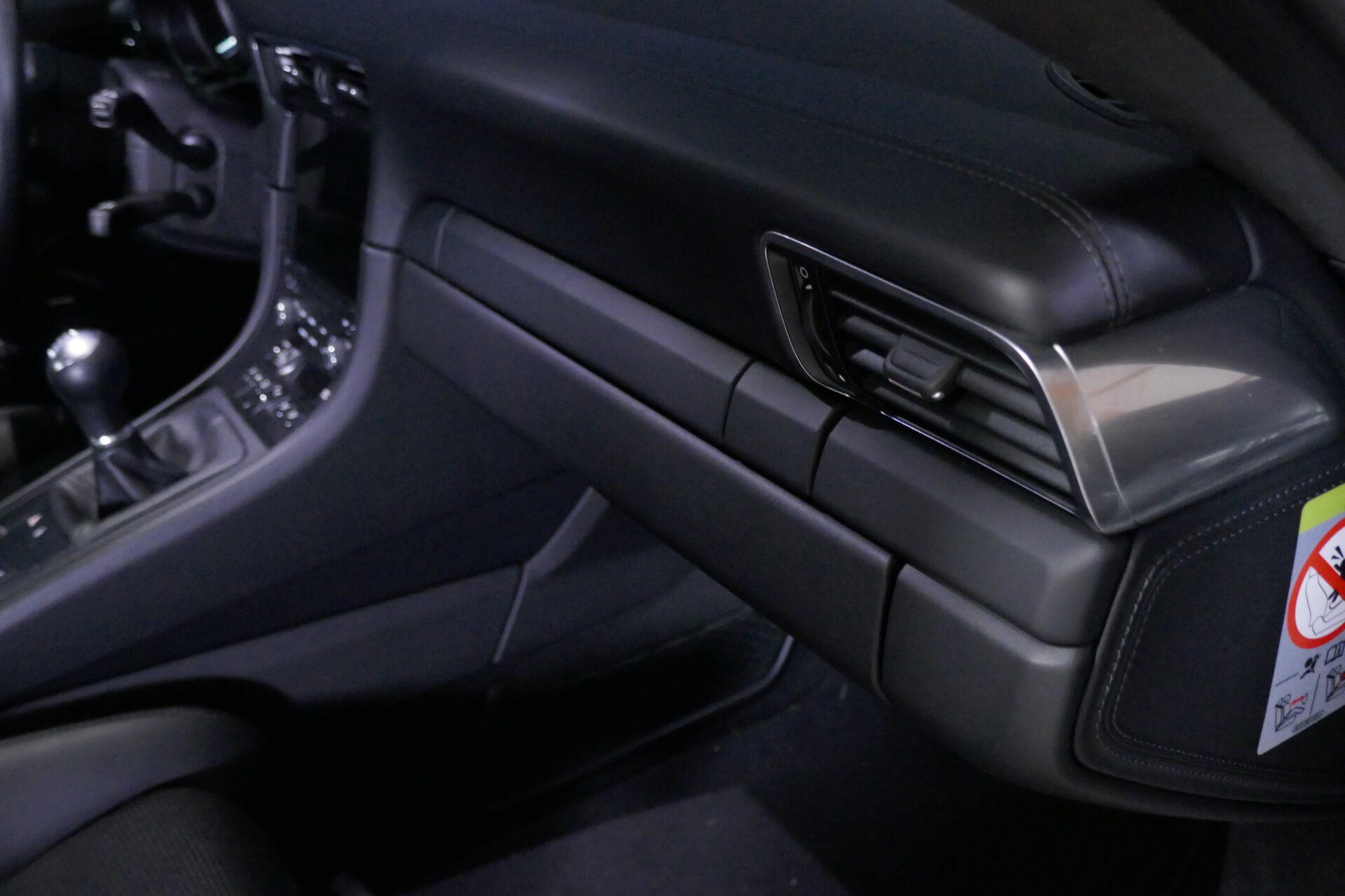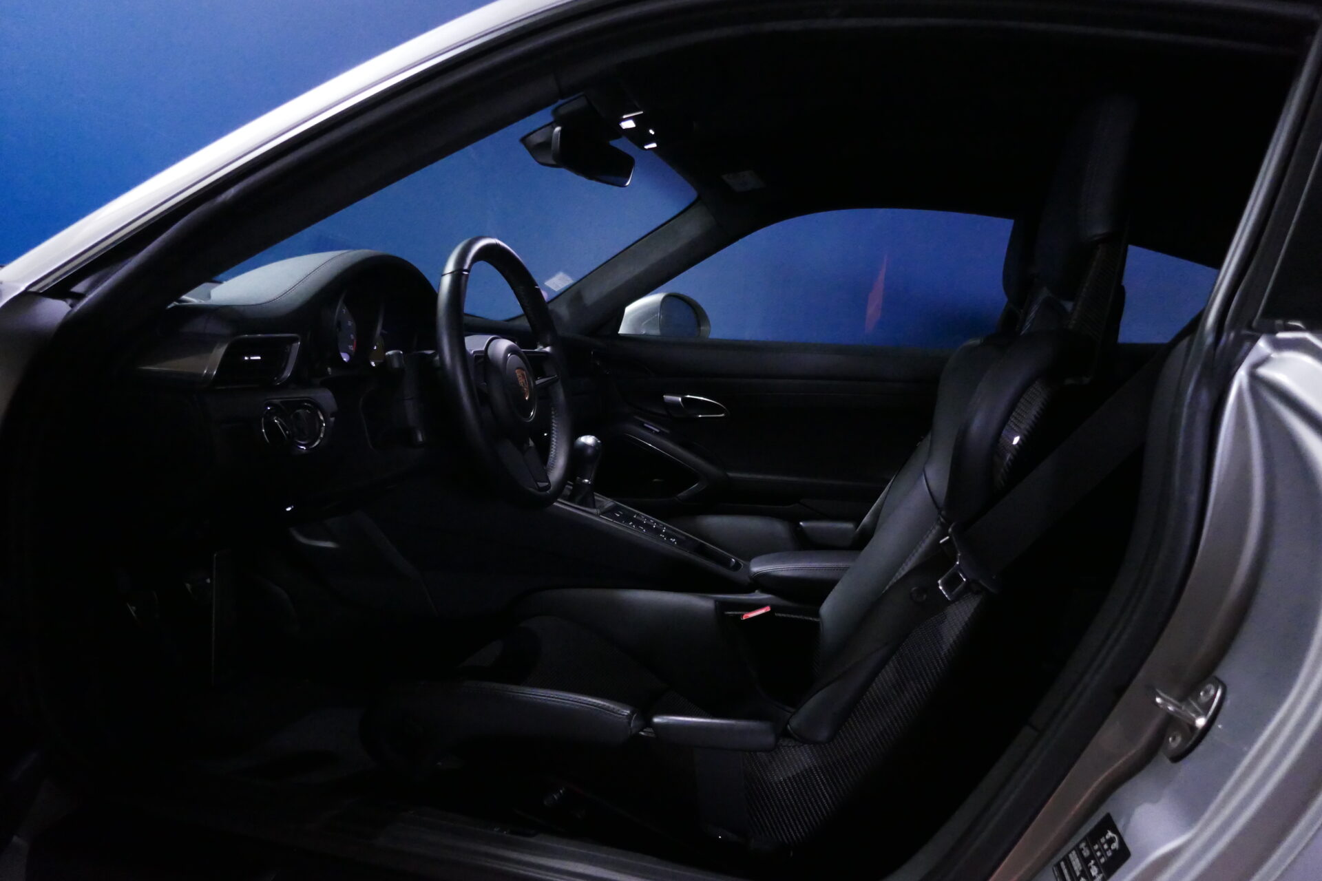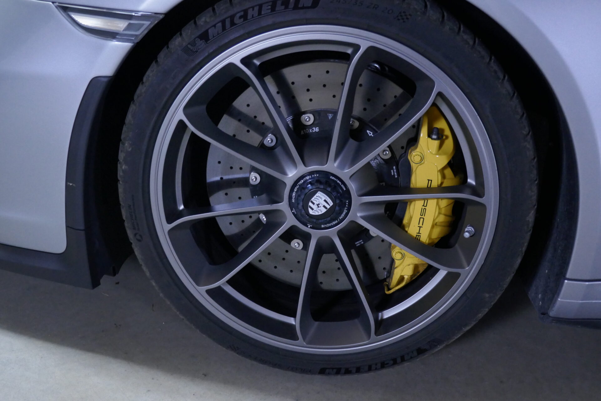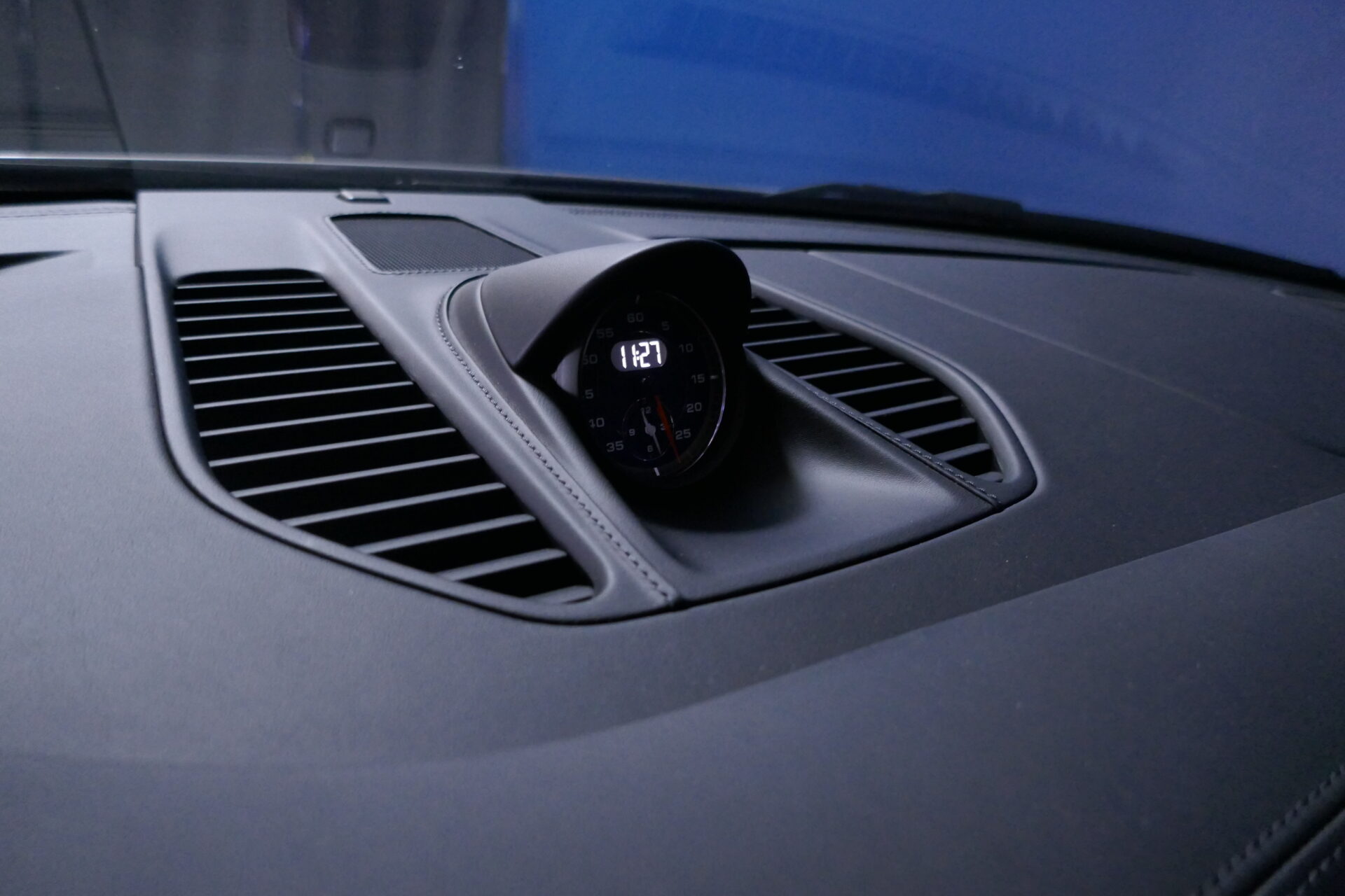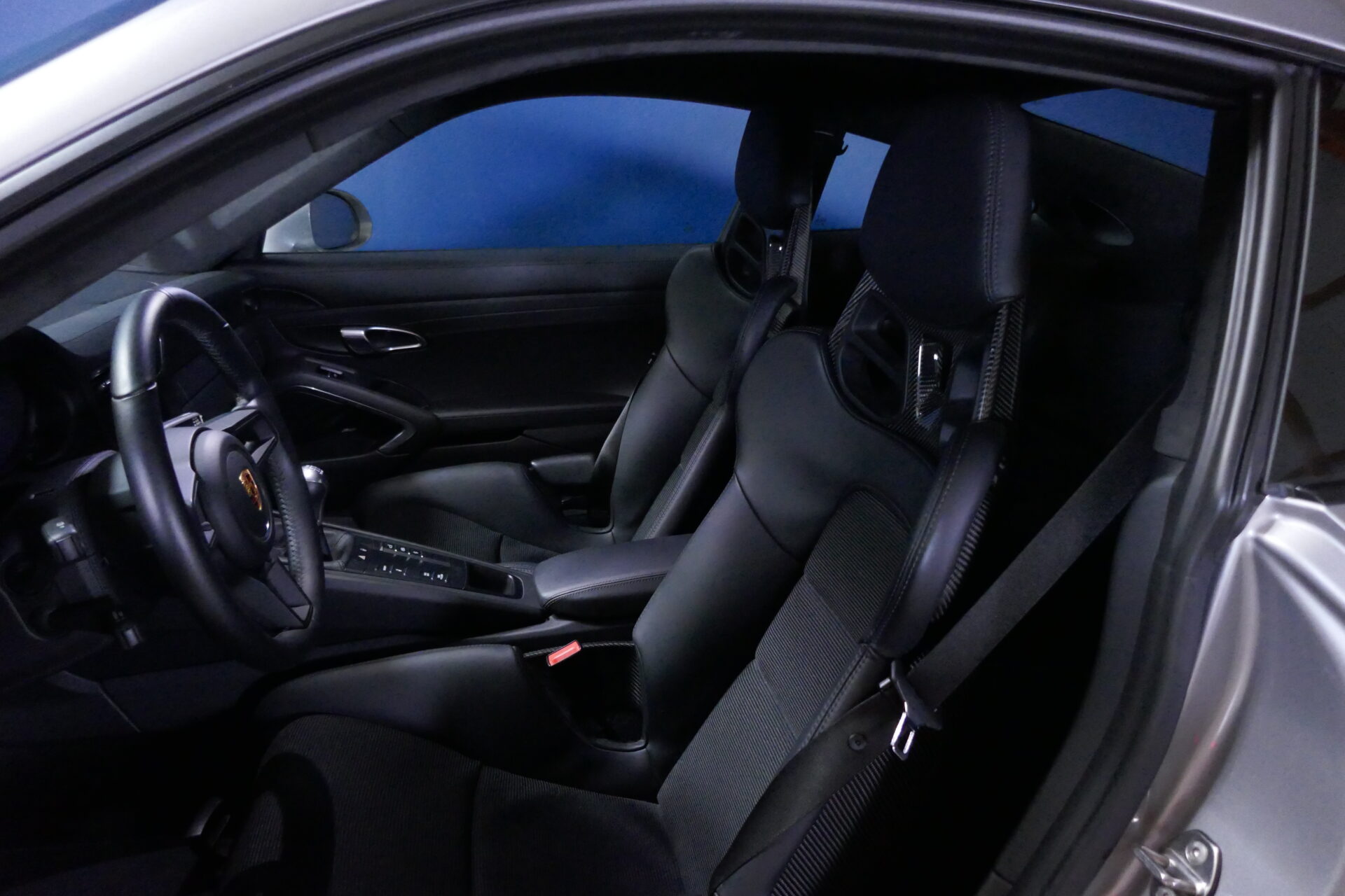 Puis il convient de jeter un œil à l’habitacle où du cuir lisse gaine les sièges de cette exécution routière, en lieu et place de l’Alcantara de mise sur la version de piste. Mais le détail le plus important n’est pas dans la décoration ou les garnitures. Il s’agit évidemment du levier de vitesse, au centre de la console centrale. Exit donc la boîte automatique PDK. Pour un plaisir de conduire amplifié, place à une transmission manuelle à 6 rapports, avec un système de talon-pointe automatique.