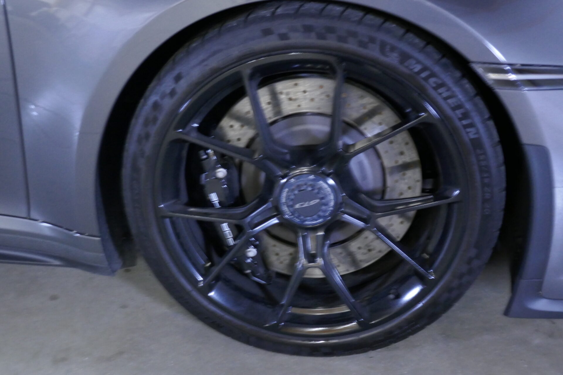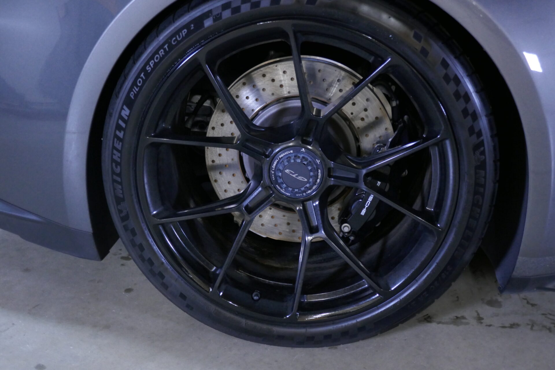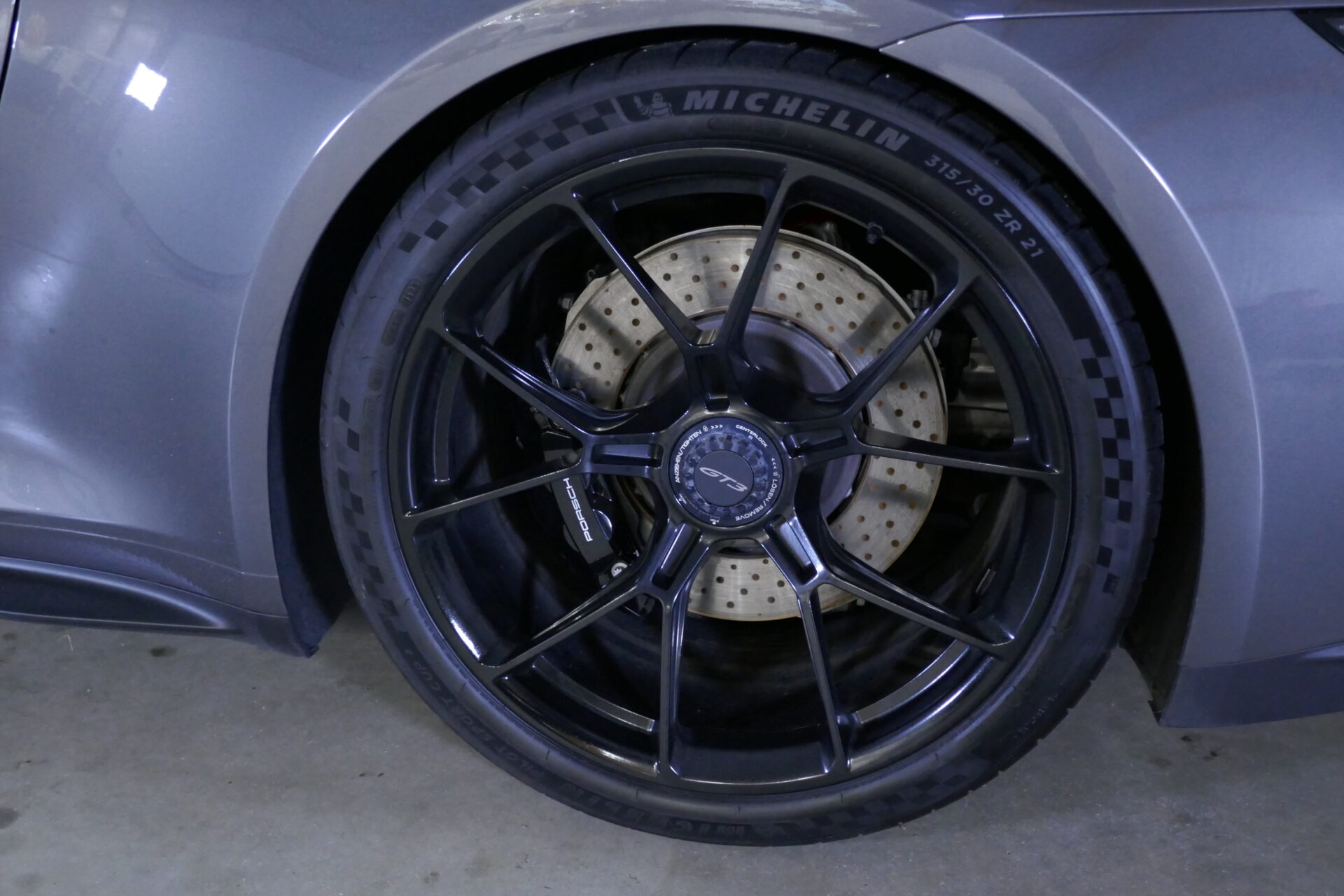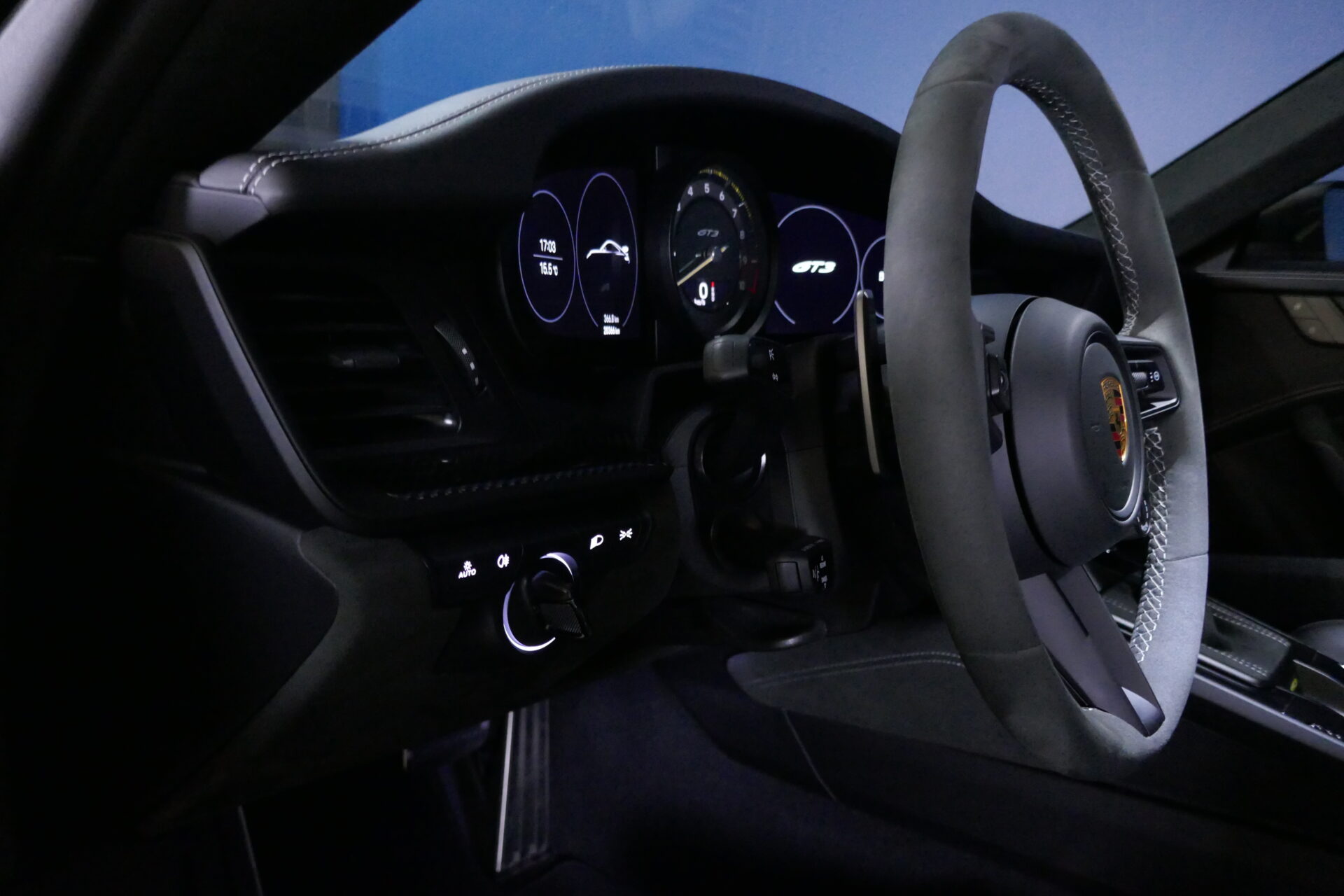 Si aller vite n'est presque qu'une question de chiffres, encore faut-il maitriser l'air qui parcourt la silhouette de la voiture. Et sur le plan aérodynamique, cette GT3 ressemble là-aussi davantage à son homologue de course (GT3 Cup), qu'à ses sœurs de gamme disponibles en concessions. Le spoiler avant et le superbe aileron arrière sont réglables manuellement sur 4 niveaux. Des échelons qui ne sont pas là que pour flatter l'égo des gentlemen drivers : le dernier cran ne permet pas de prendre la route ! Résultat, à 200 km/h, cette Porsche GT3 type 992 génère 150 % d'appui en plus que sa devancière, déjà peaufinée en la matière. Le soubassement est entièrement caréné, et de multiples goulottes viennent rediriger le flux d'air pour ne pas créer de turbulences au niveau des roues.